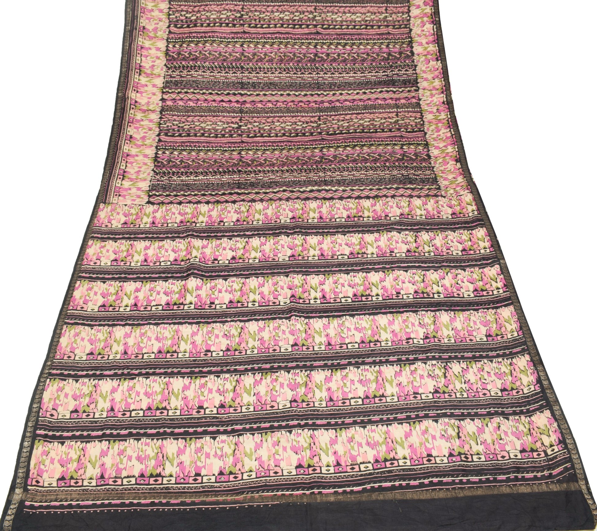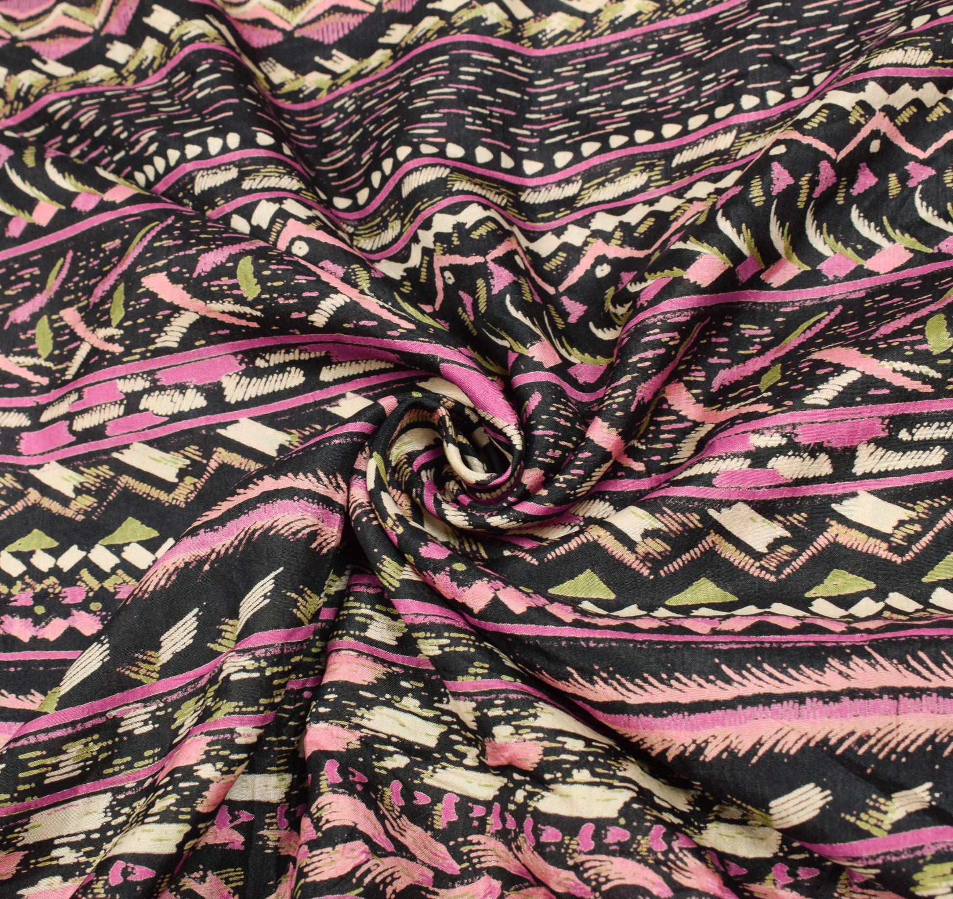 Sushila Vintage Black Abstract Saree Pure Silk Printed Soft 6 Yard Craft Fabric
