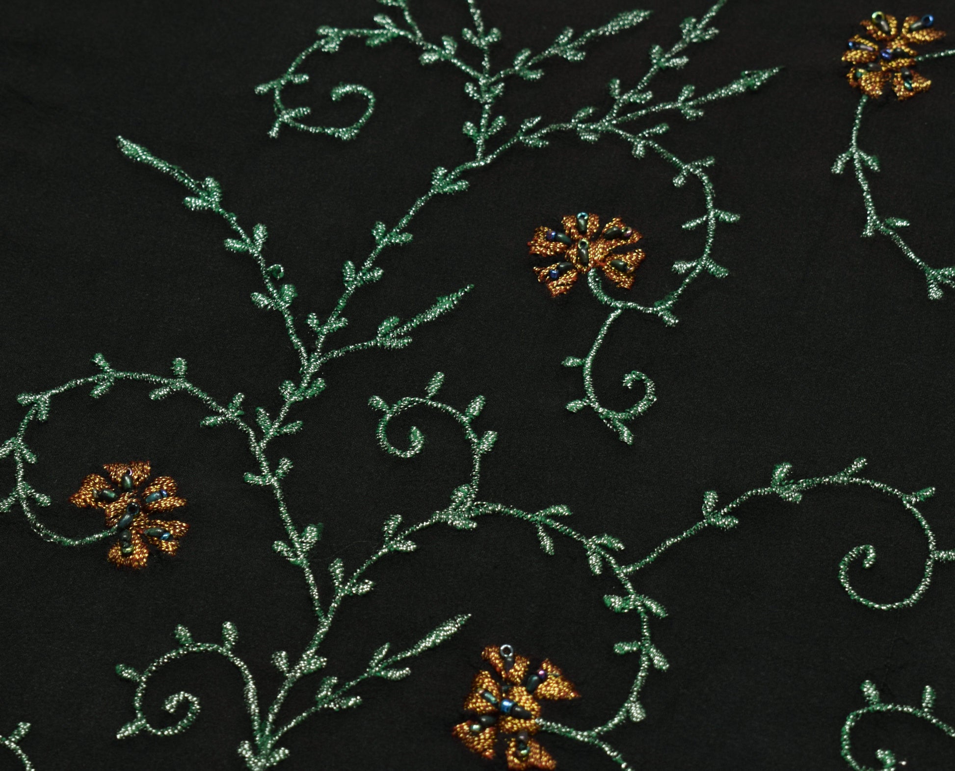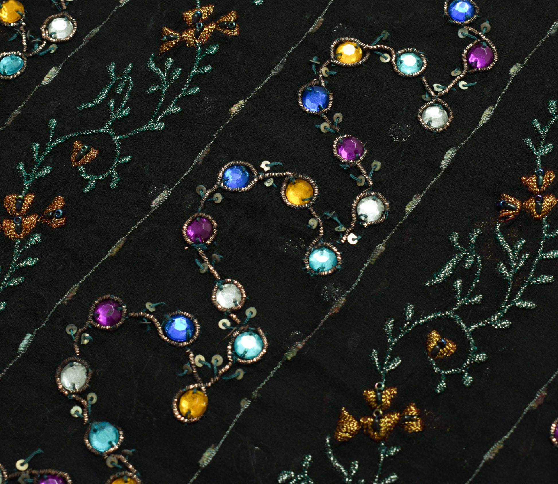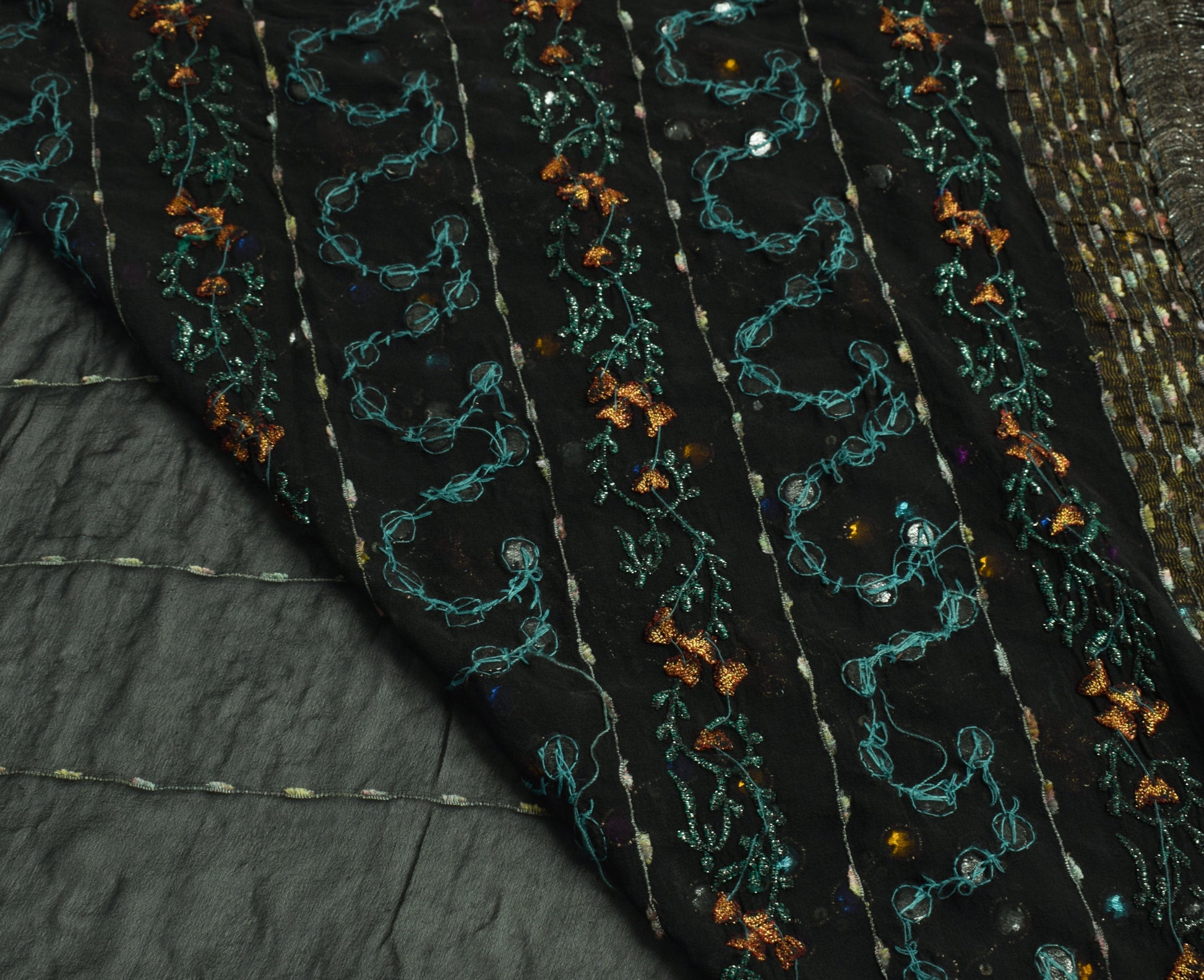 Capture the spirit of heritage fashion with this black 100% pure georgette silk saree, showcasing stunning floral motifs and artistic hand beaded, zardozi work, sequins work, rhine stone & embroidered embellishments. Measuring approximately 184 inch in length and 43 inch in width, this sari provides a generous amount of fabric for versatile styling. It weighs just 1030 grams (actual product weight), making it a comfortable choice for long wear. this sari includes fall: yes and pico: yes, ensuring a polished, ready-to-wear finish. Whether worn traditionally, upcycled into beautiful home décor, or transformed into unique dresses, this sari is a versatile addition to your collection.