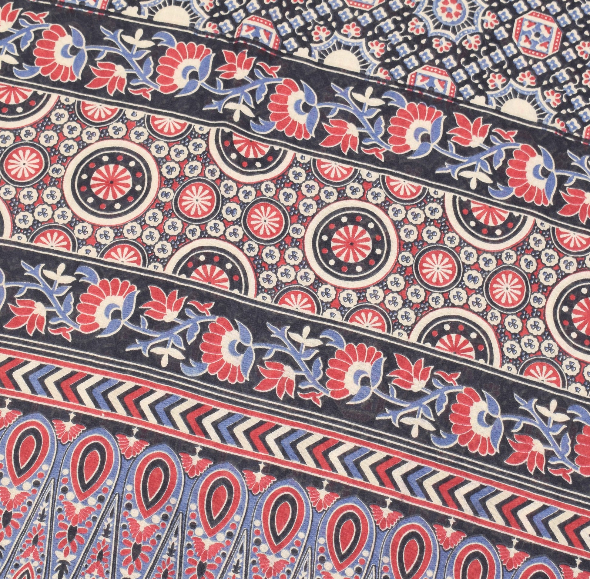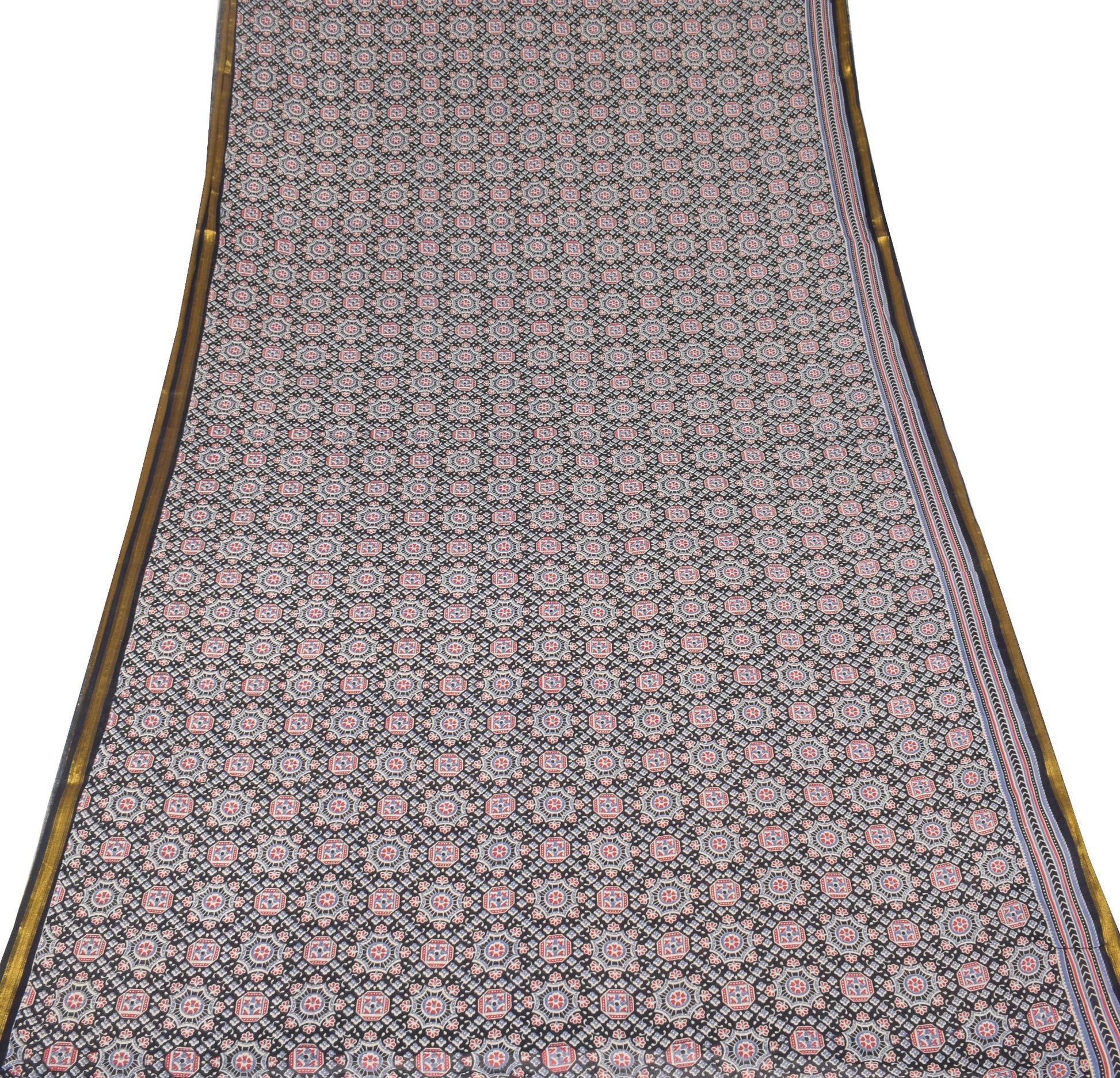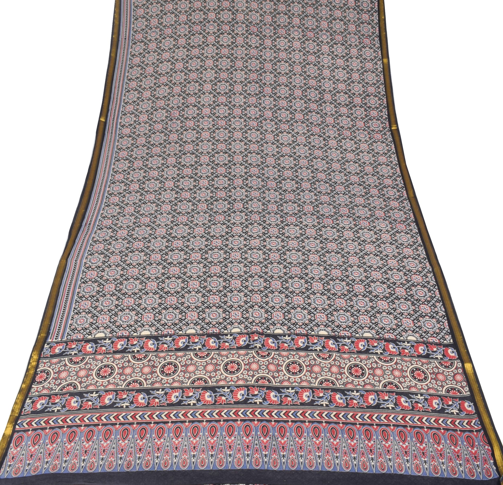 Sushila Vintage Black Saree Pure Cotton Ajrakh Hand Block Print Sari Soft Fabric