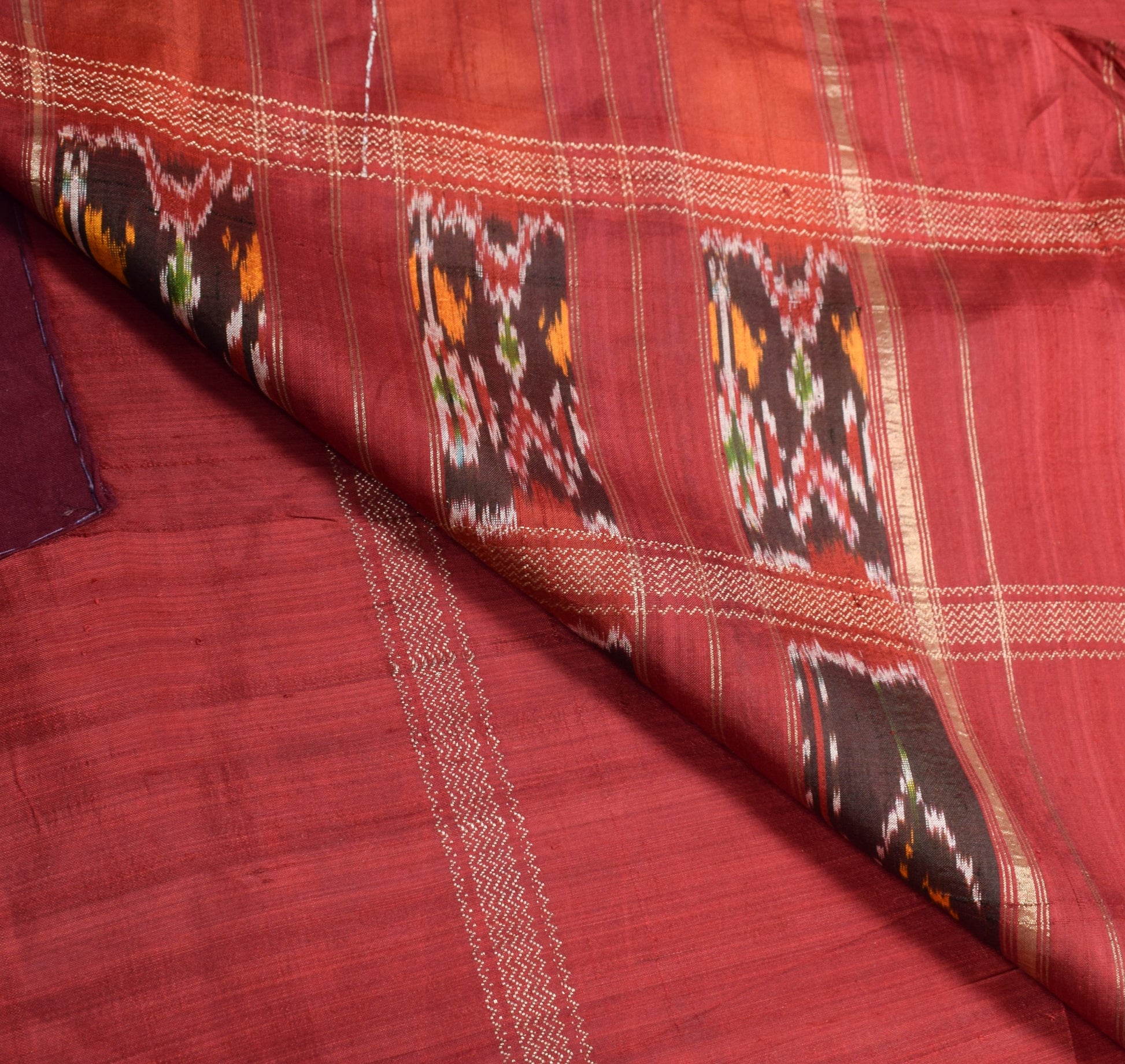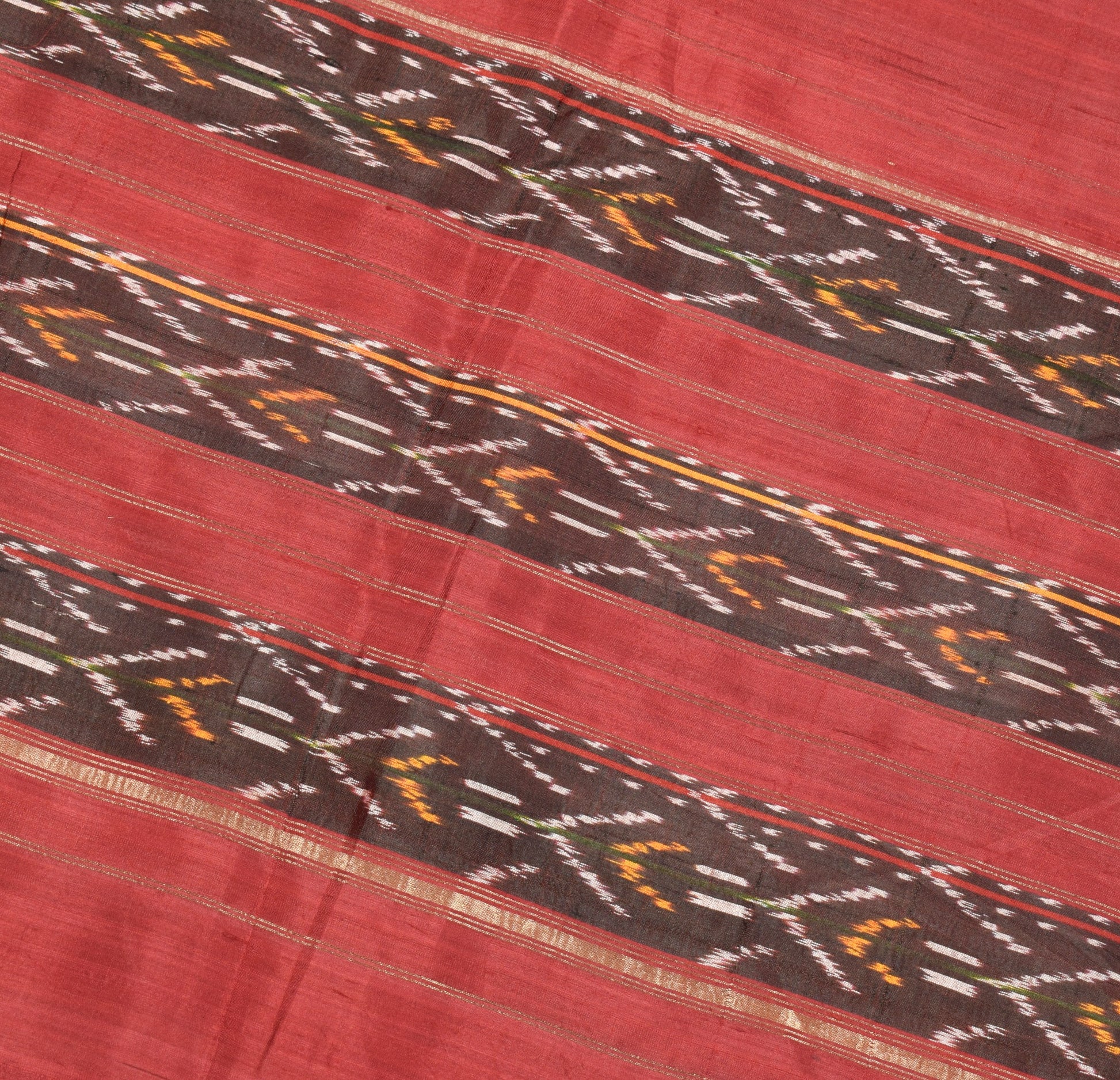 Discover rarely found elegance with this Sushila Vintage saree, crafted from 100% pure silk and featuring the exquisite Ikat Patola weaving technique—an intricate double-ikat process renowned for its complexity and vibrant patterns. The deep black and maroon palette offers a striking contrast, enriched by a luxurious zari brocade border that adds regal sophistication.