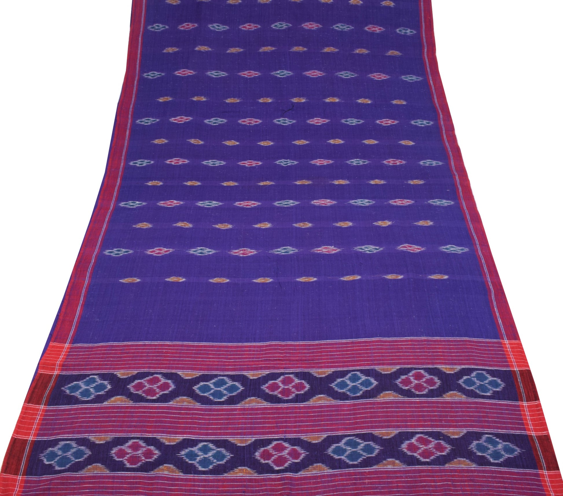 This rare, traditionally crafted Blue & Red Sambalpuri Ikat saree hails from the northern region of Odisha, woven from 100% pure cotton. A fine example of single Ikat artistry, it features a multicolor floral pallu and border, with intricate thread work running through the body.