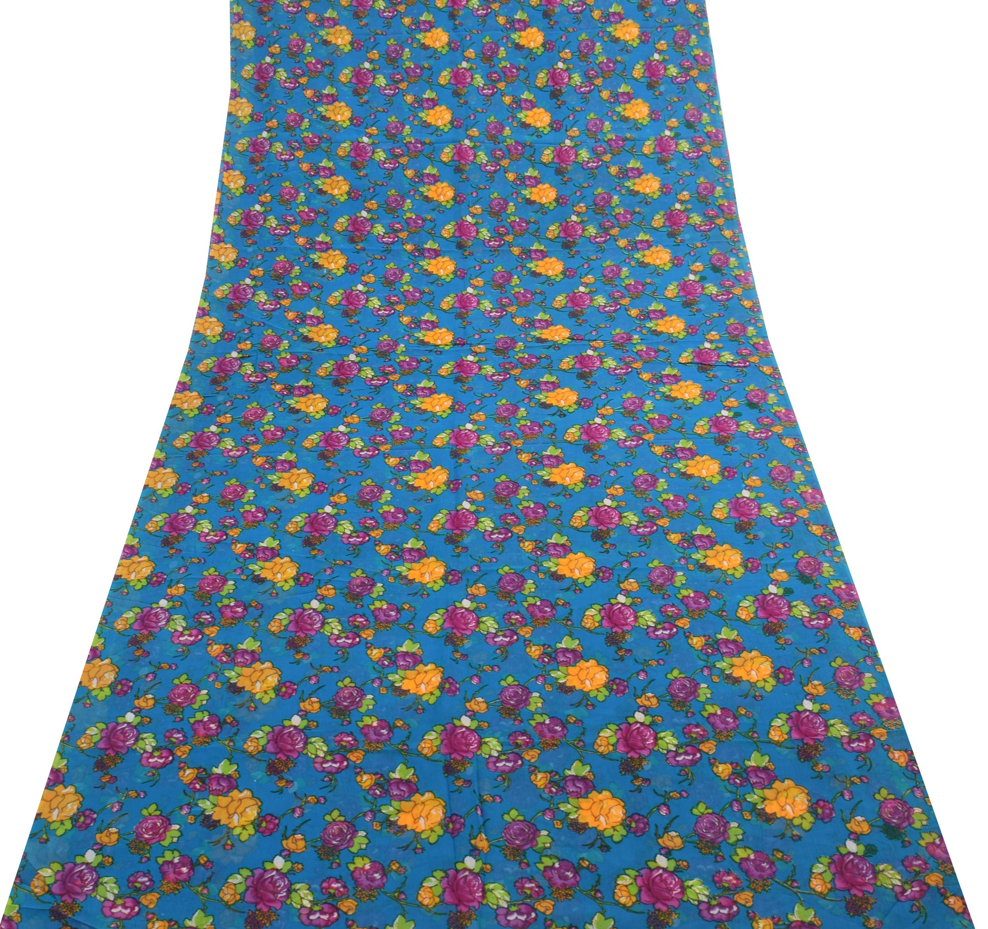 Sushila Vintage Blue Saree 100% Pure Georgette Silk Printed Craft Floral Fabric
