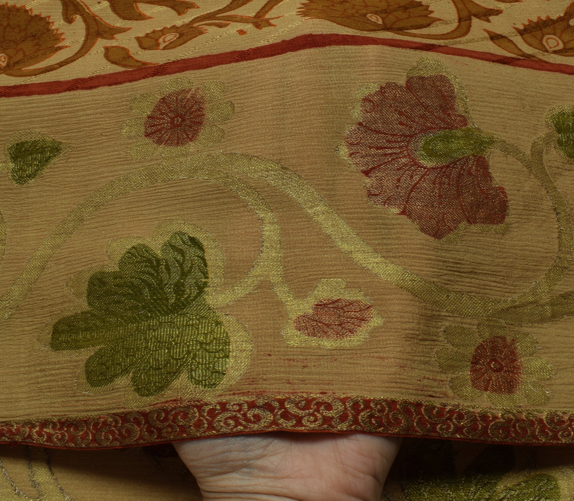 Experience the timeless allure of this Brown 100% Pure Georgette Silk saree, crafted with intricate Floral motifs and refined Printed & Woven details. It is perfect for special occasions, creative repurposing, or as a beautiful heirloom gift. Measuring approximately 192 Inch in length and 43 Inch in width, this sari offers versatile styling options. It is lightweight, weighing just 270 Grams (Actual Product weight), making it easy to drape and carry for long hours. The natural breathability and luxurious drape of 100% pure georgette silk make it a prized choice for those who appreciate fine craftsmanship and vintage fashion.