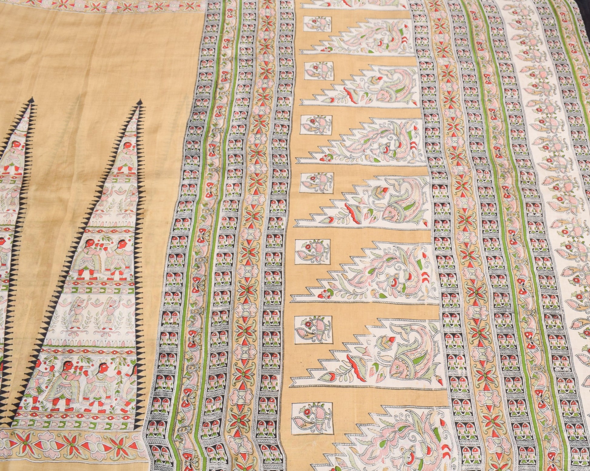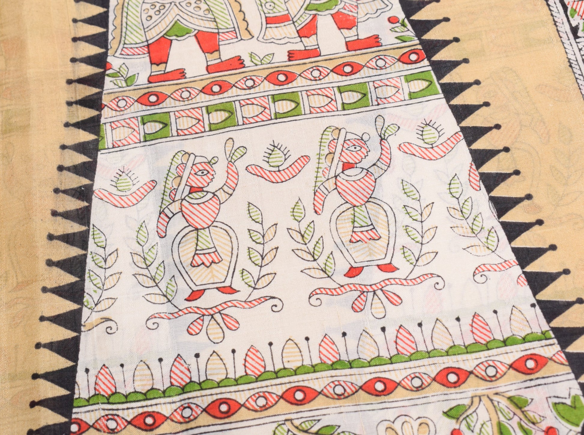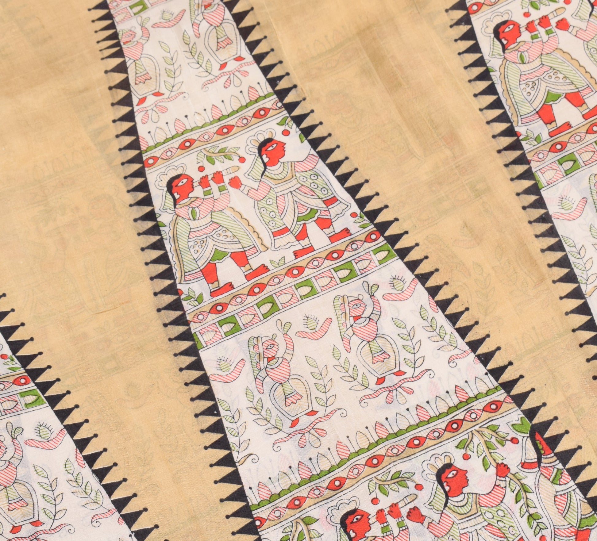 Celebrate Indian folk art with this exquisite Madhubani hand-brush printed saree, crafted from 100% pure silk in a deep brown hue. Adorned with intricate human, animal, and bird motifs, this pre-loved piece reflects the rich storytelling tradition of Madhubani art—a centuries-old painting style from Bihar, known for its vibrant imagery and symbolic themes drawn from mythology and nature.