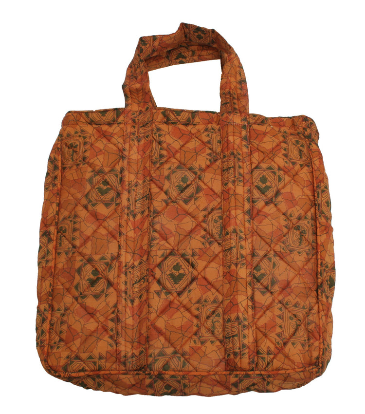 This Tote bag is quilted and handmade using printed 100% Pure Silk Vintage Saree. It is designed to be able to contain all your everyday stuff or for light traveling. The top closes with a Zip, and when opened it has 2 smaller compartments in each side.