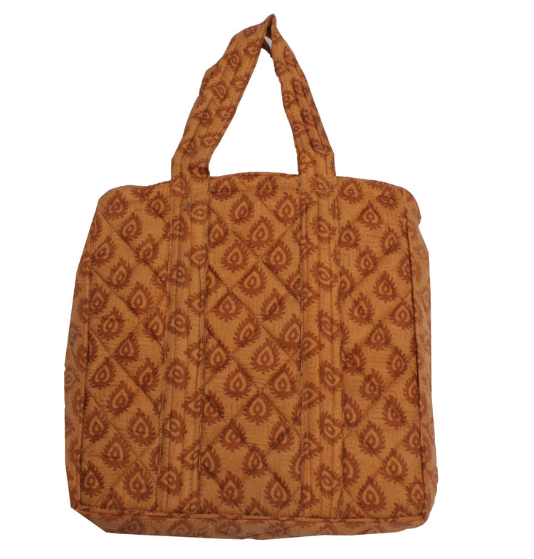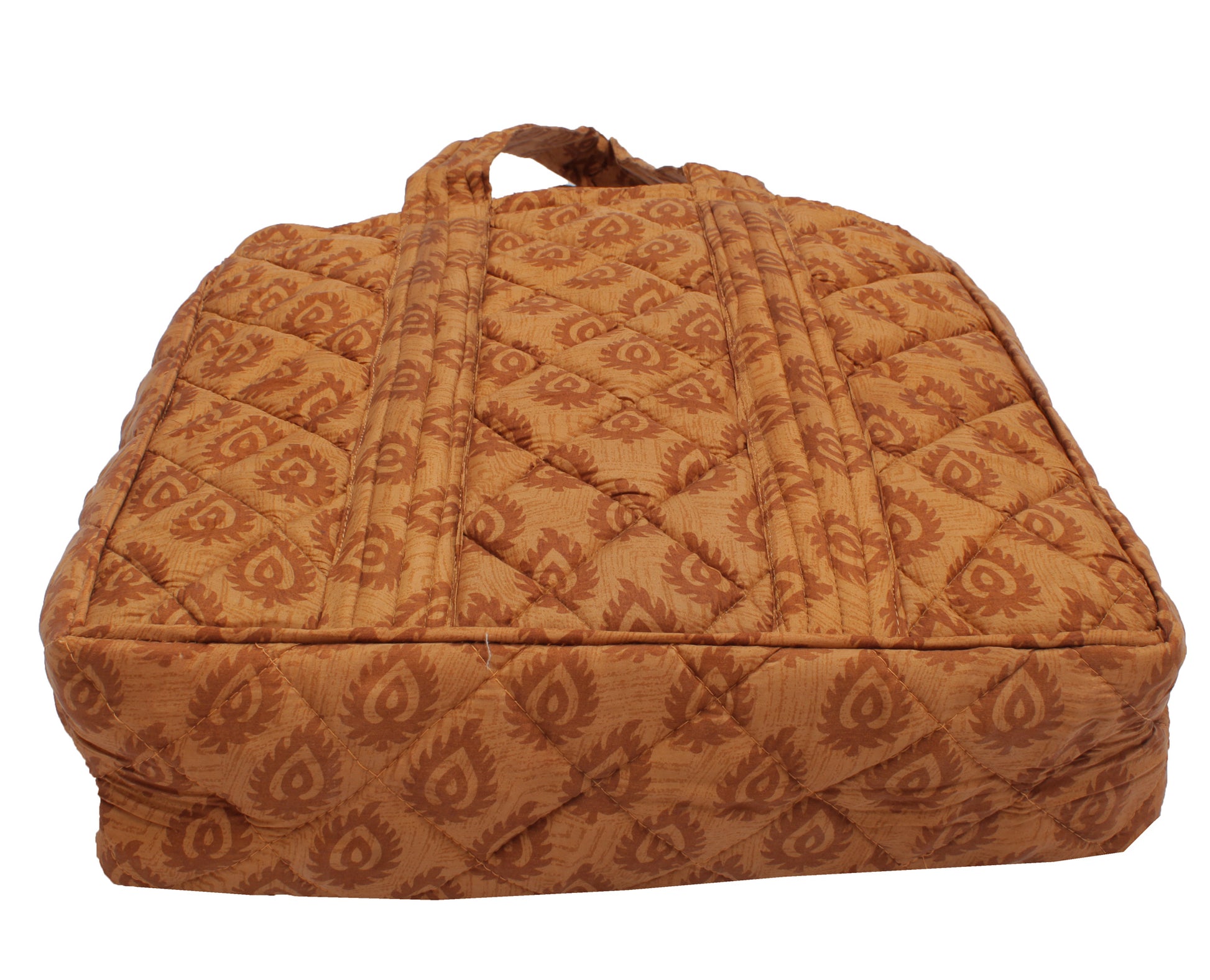 This Tote bag is quilted and handmade using printed 100% Pure Silk Vintage Saree. It is designed to be able to contain all your everyday stuff or for light traveling. The top closes with a Zip, and when opened it has 2 smaller compartments in each side.