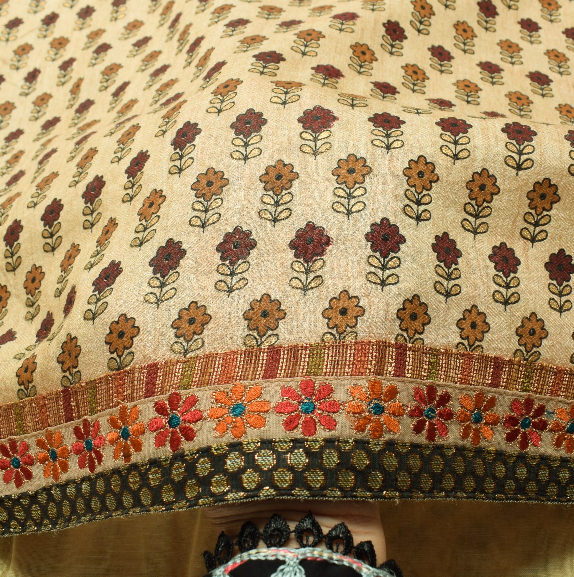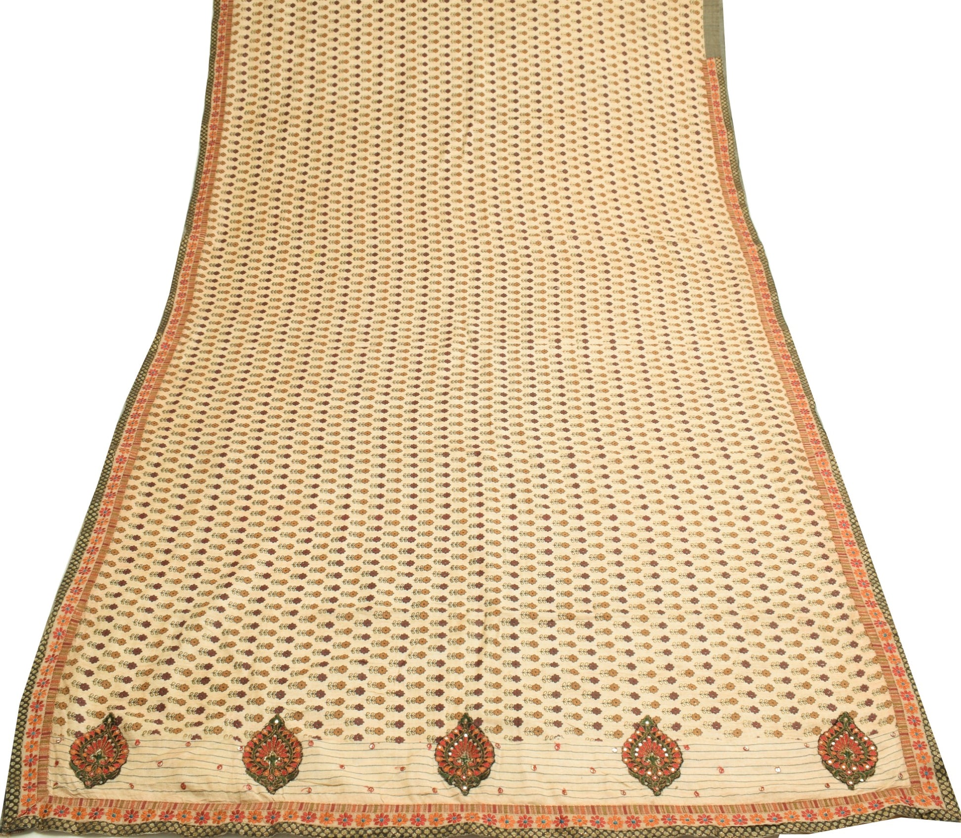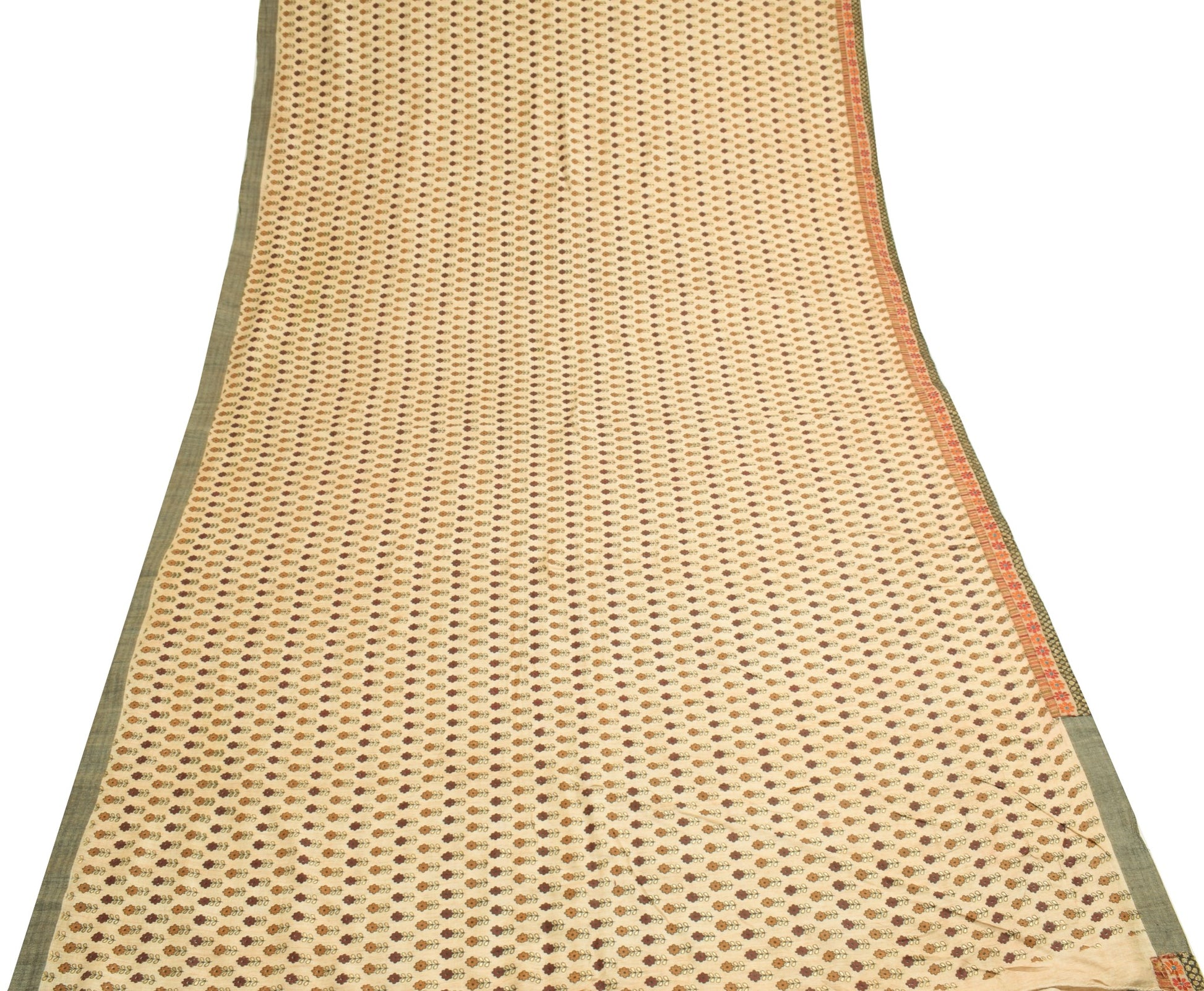 Sushila Vintage Cream Floral Saree 100%Pure Woolen Printed 5YD Sari Craft Fabric
