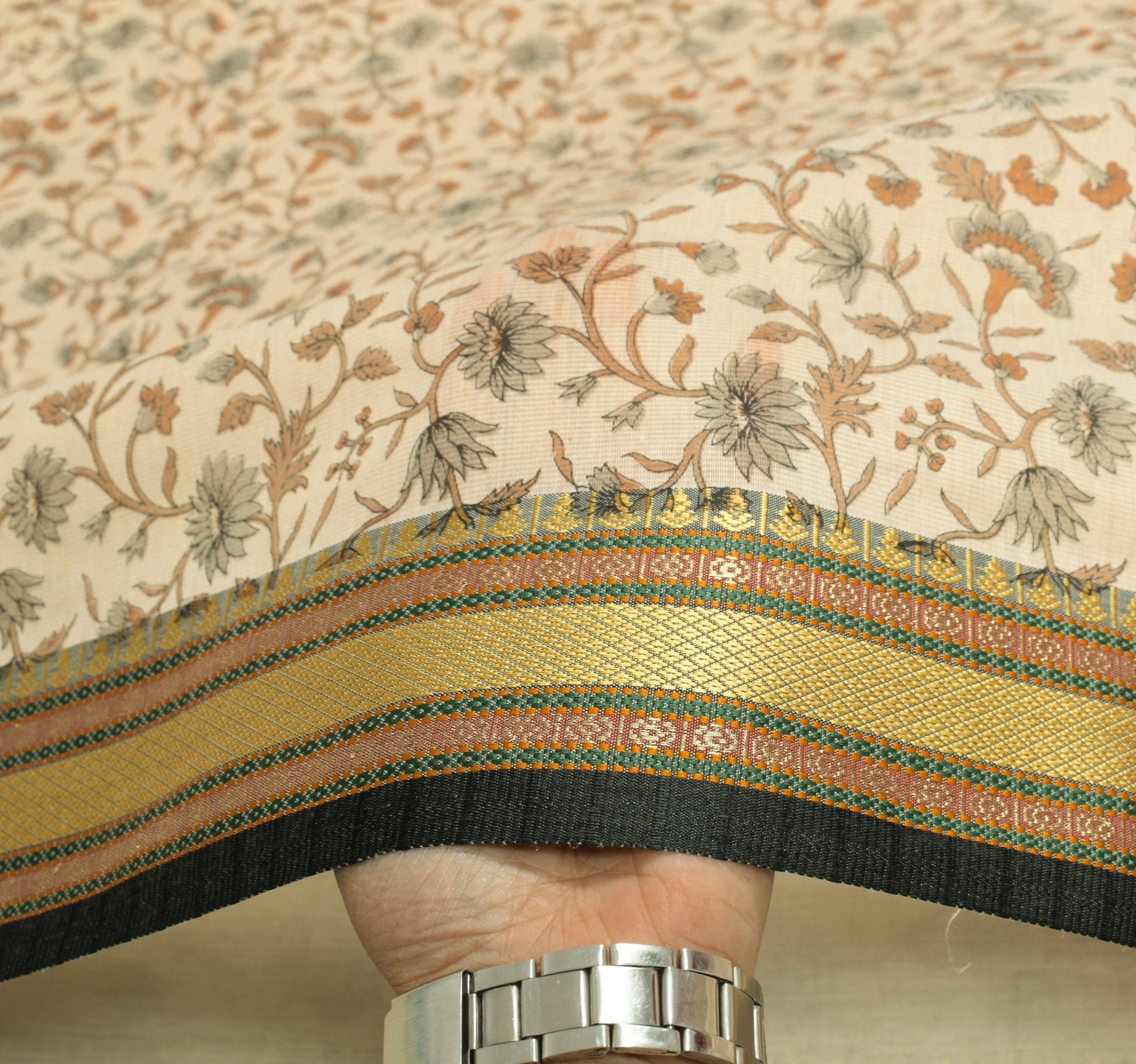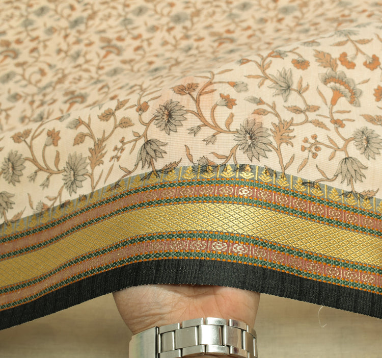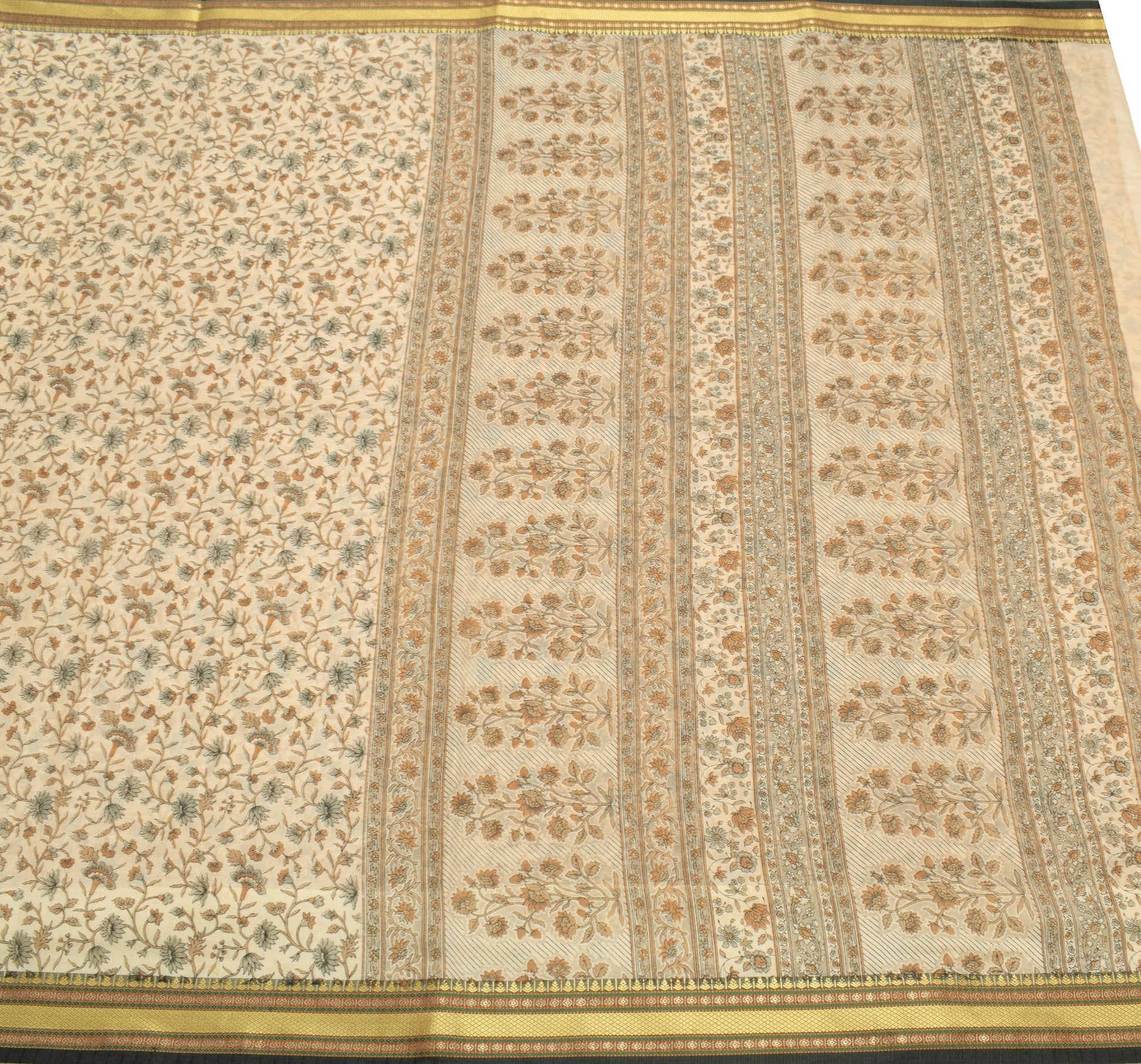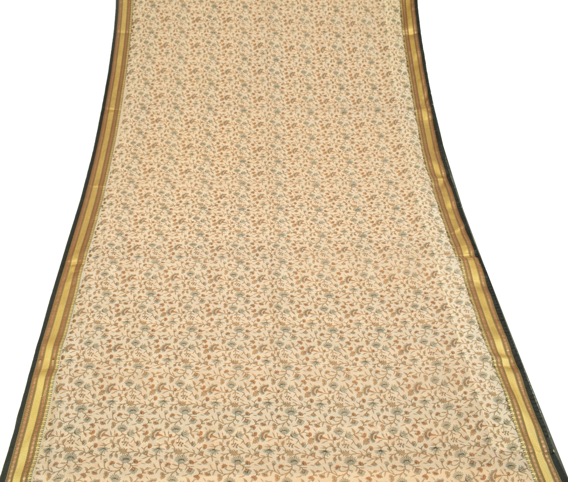 Sushila Vintage Cream Floral Saree Woven Border Art Cotton Printed Craft Fabric