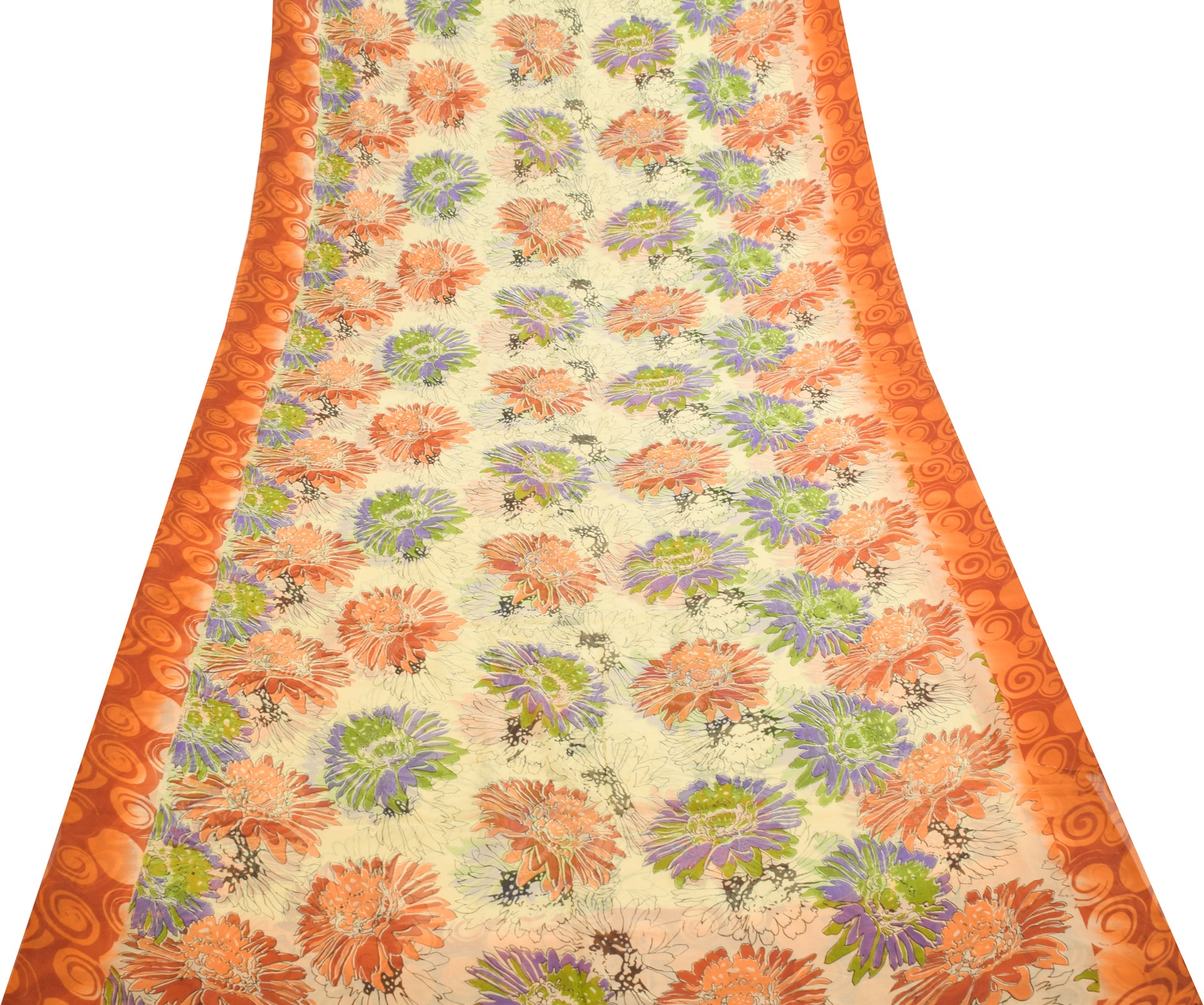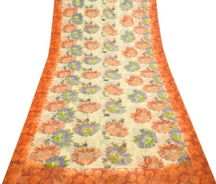 Sushila Vintage Cream Saree 100% Pure Chiffon Silk Printed Floral Craft Fabric
