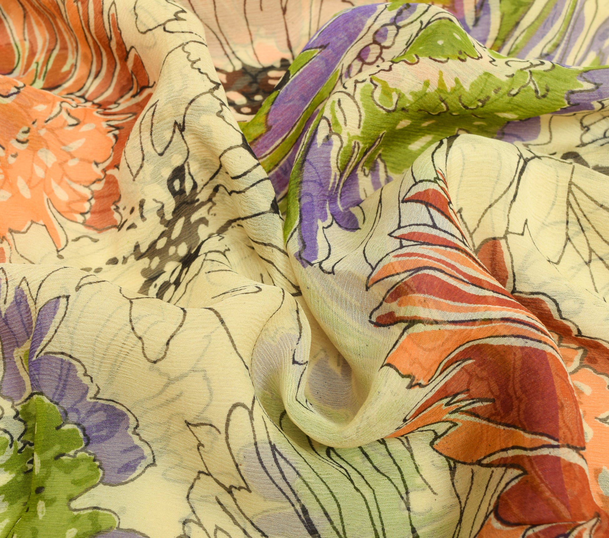 Make a lasting impression with this exquisite cream 100% pure chiffon silk saree, known for its floral patterns and delicate printed work. Crafted from pure, breathable 100% pure chiffon silk, this saree is known for its luxurious drape and timeless appeal. Measuring approximately 182 inch in length and 45 inch in width, it offers versatile styling possibilities, whether worn traditionally or repurposed for creative projects. With a weight of 190 grams (actual product weight), it drapes beautifully, making it an ideal choice for those who appreciate the charm of vintage textiles.