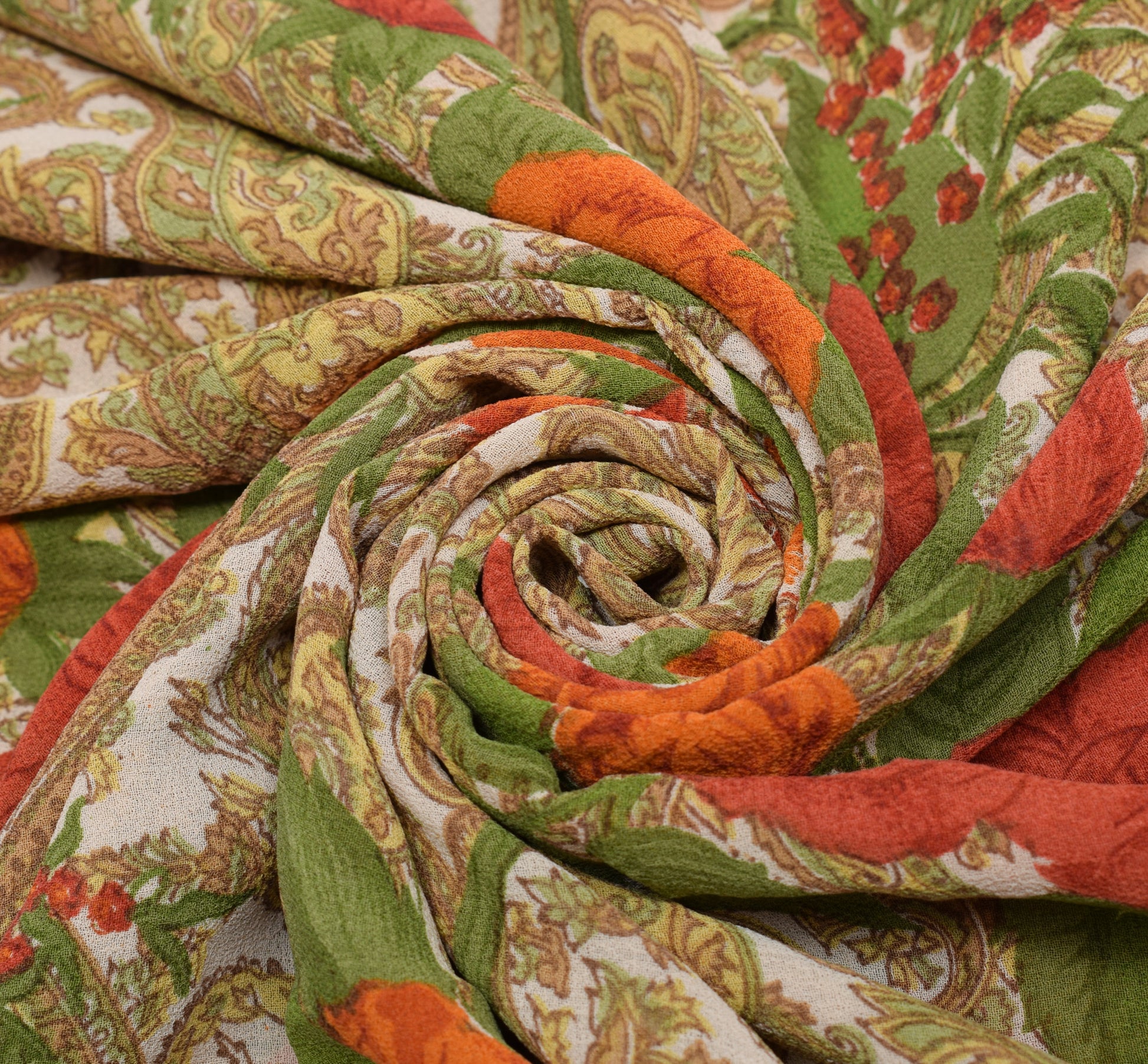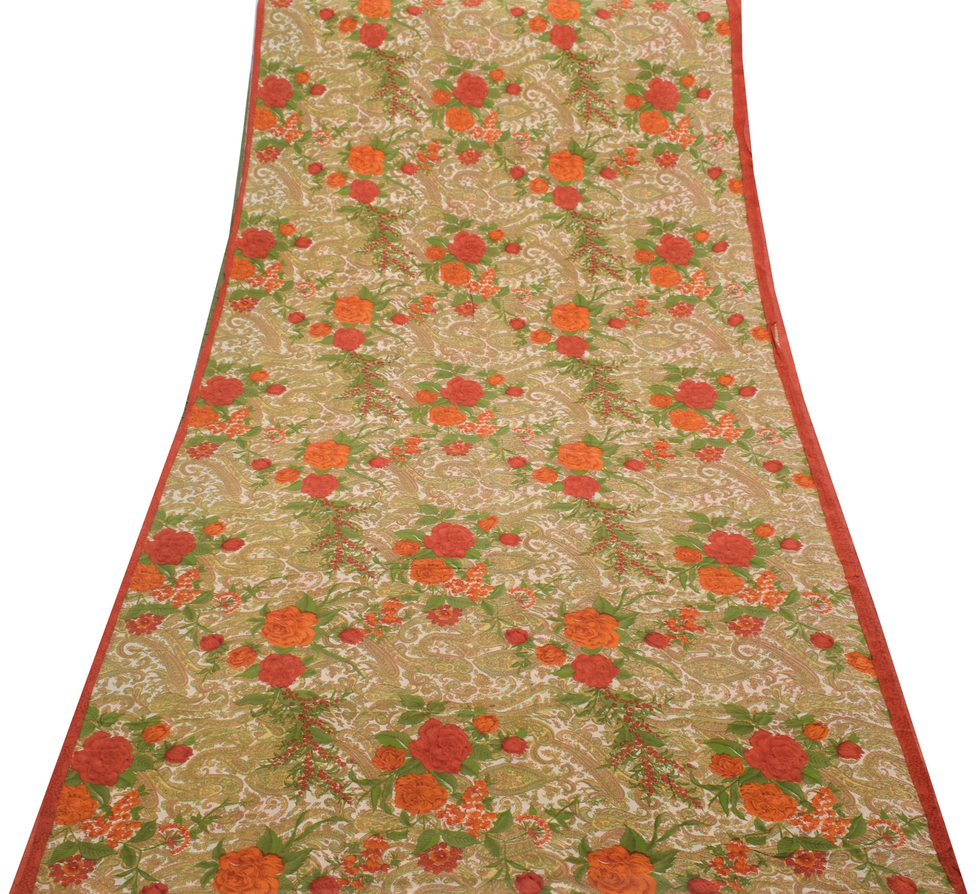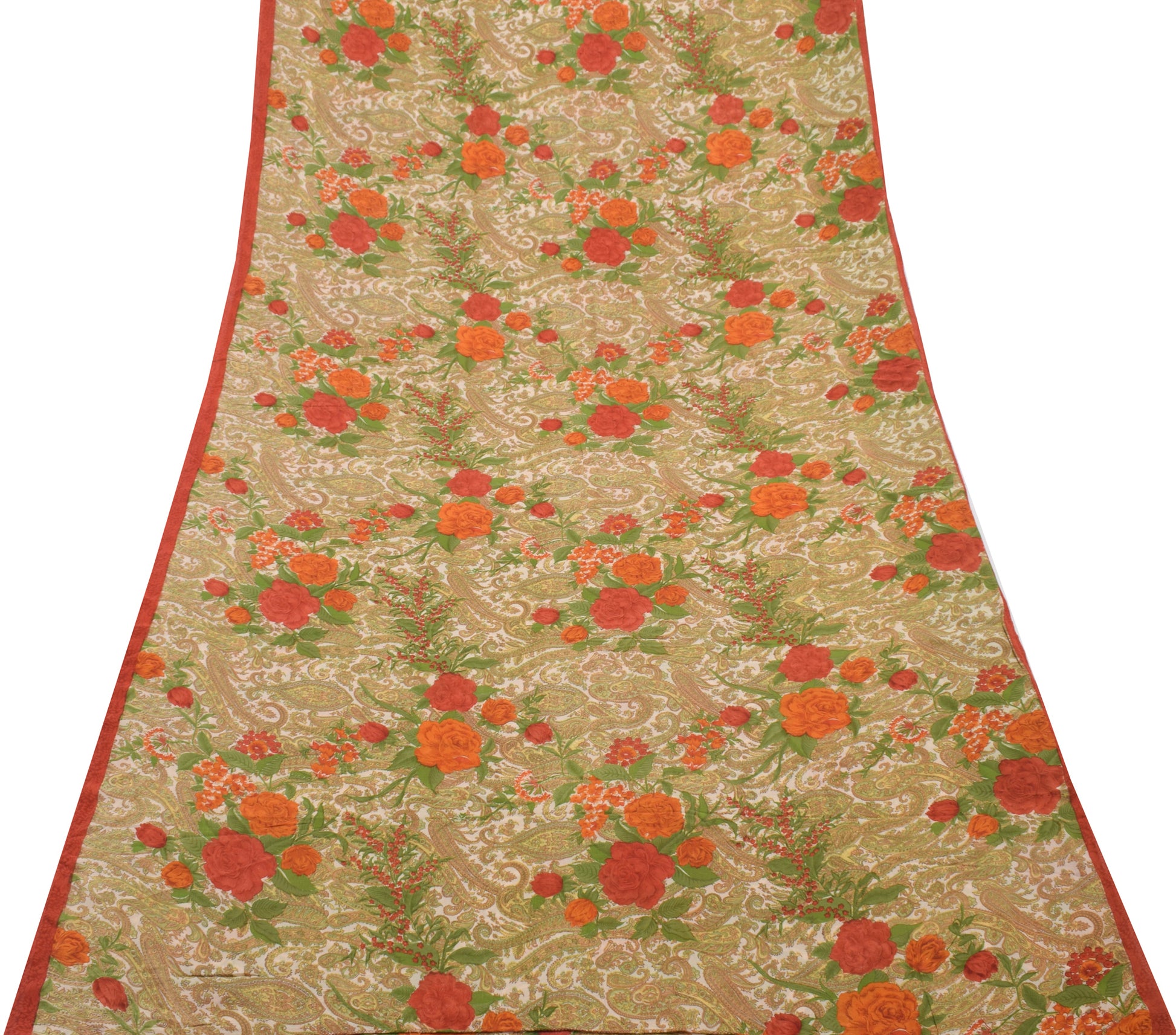 Sushila Vintage Cream Saree 100%Pure Georgette Silk Printed Paisley Craft Fabric
