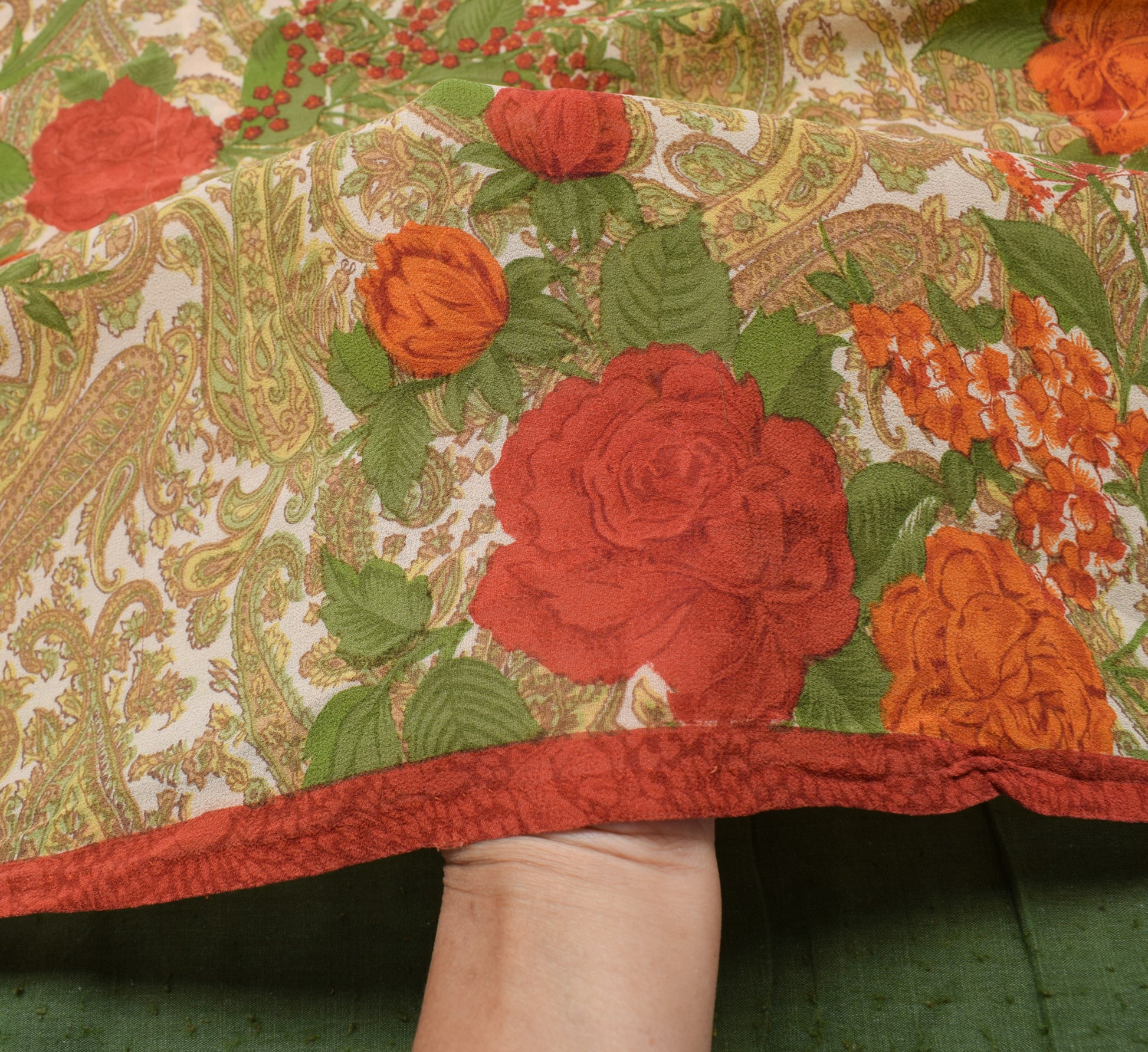 Capture the spirit of heritage fashion with this stunning Cream 100% Pure Georgette Silk saree, featuring beautiful Paisley patterns and fine Printed accents. It is perfect for special occasions, creative repurposing, or as a beautiful heirloom gift. Measuring approximately 175 Inch in length and 42 Inch in width, this sari offers versatile styling options. It is lightweight, weighing just 380 Grams (Actual Product weight), making it easy to drape and carry for long hours. The natural breathability and luxurious drape of 100% pure georgette silk make it a prized choice for those who appreciate fine craftsmanship and vintage fashion.