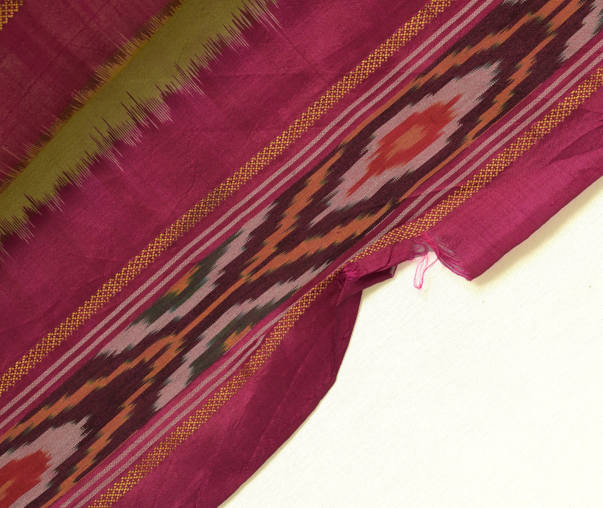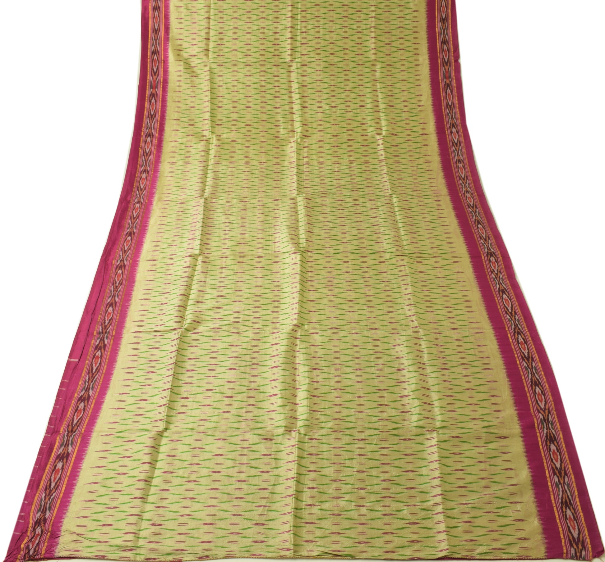 Crafted from Pure Silk with a As Per Images pattern and ikkat print detailing in a rich Cream shade, this vintage saree measures approximately Approx 180 Inch / 14.994 Foot / 5.04 Yard / 457.2 CM / 4.572 Meter in length and Approx 43 Inch / 3.5819 Foot / 1.204 Yard / 109.22 CM / 1.0922 Meter in width, with a total weight of 330 Grams. This sari is ideal for upcycling, sewing, crafting, and creative projects, offering endless possibilities for creating unique dresses, home decor accents, cushion covers, bags, table runners, or other fashion accessories. Given its pre-owned nature, it may have defects like holes, cuts, tears, spots, discolorations, or other imperfections, making it unsuitable for wearing as a full saree. Please note that these defects will not be explicitly mentioned in the listing.