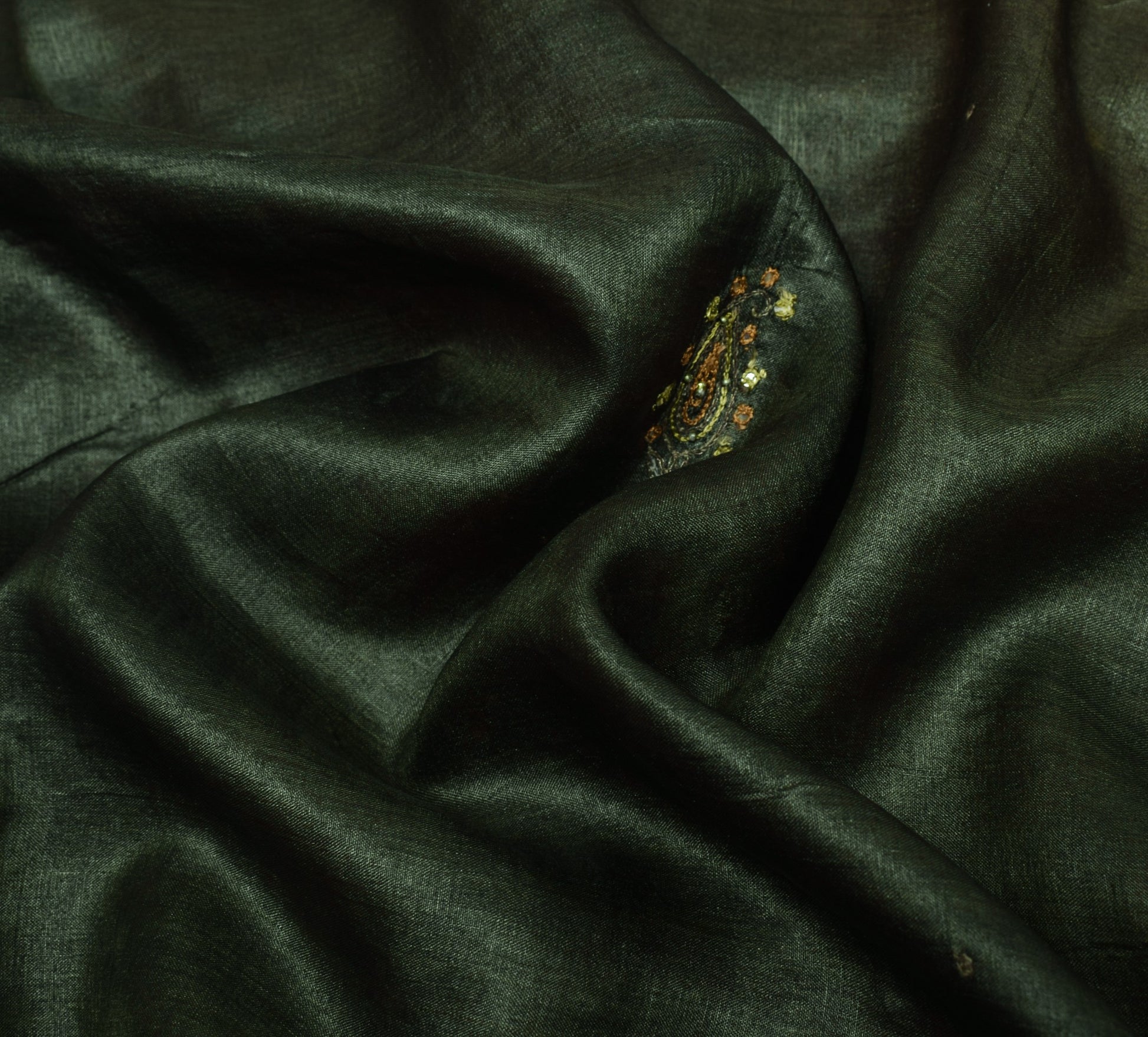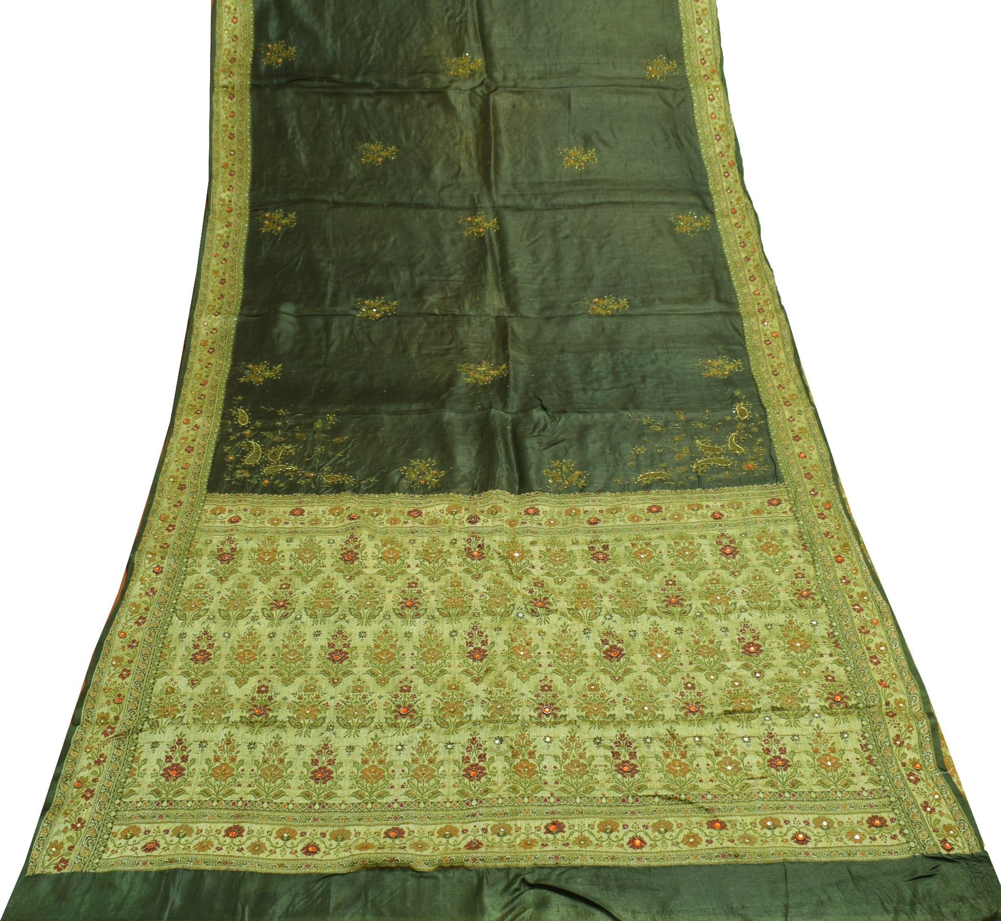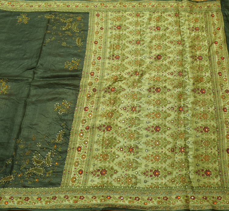 Capture the spirit of heritage fashion with this dark green 100% pure tussar silk saree, showcasing stunning paisley motifs and artistic hand beaded, mirror work, plastic beads, rhine stone, woven & embroidered embellishments. Measuring approximately 192 inch in length and 42 inch in width, this sari provides a generous amount of fabric for versatile styling. It weighs just 430 grams (actual product weight), making it a comfortable choice for long wear. this sari is carefully finished, with fall attached and pico done, ensuring a polished, ready-to-wear look. Whether worn traditionally, upcycled into beautiful home décor, or transformed into unique dresses, this sari is a versatile addition to your collection.