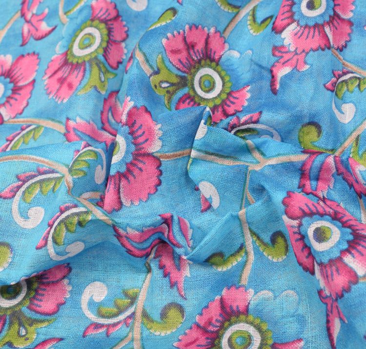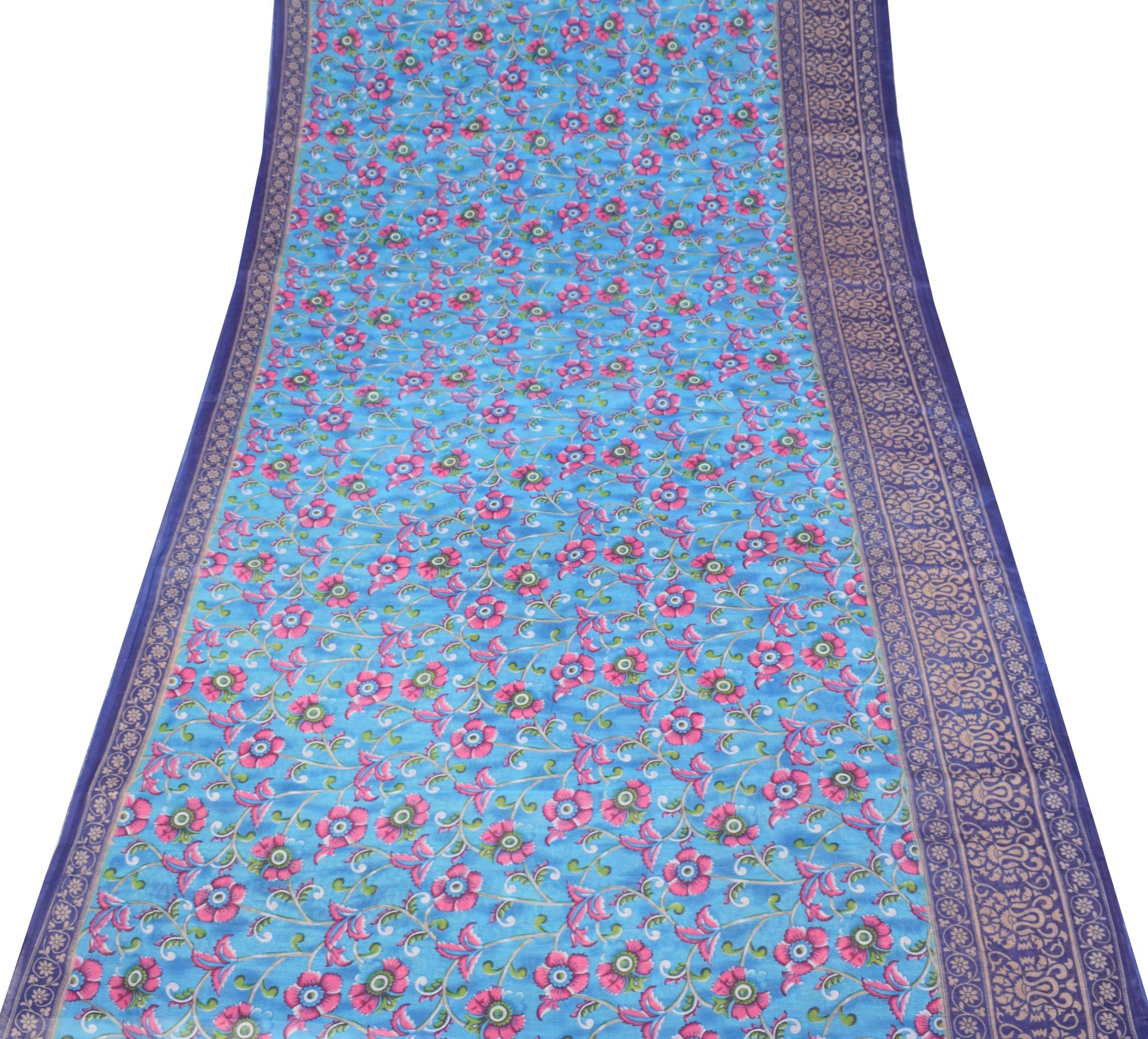 Sushila Vintage Floral Aqua Blue Saree 100% Pure Cotton Printed Craft Fabric