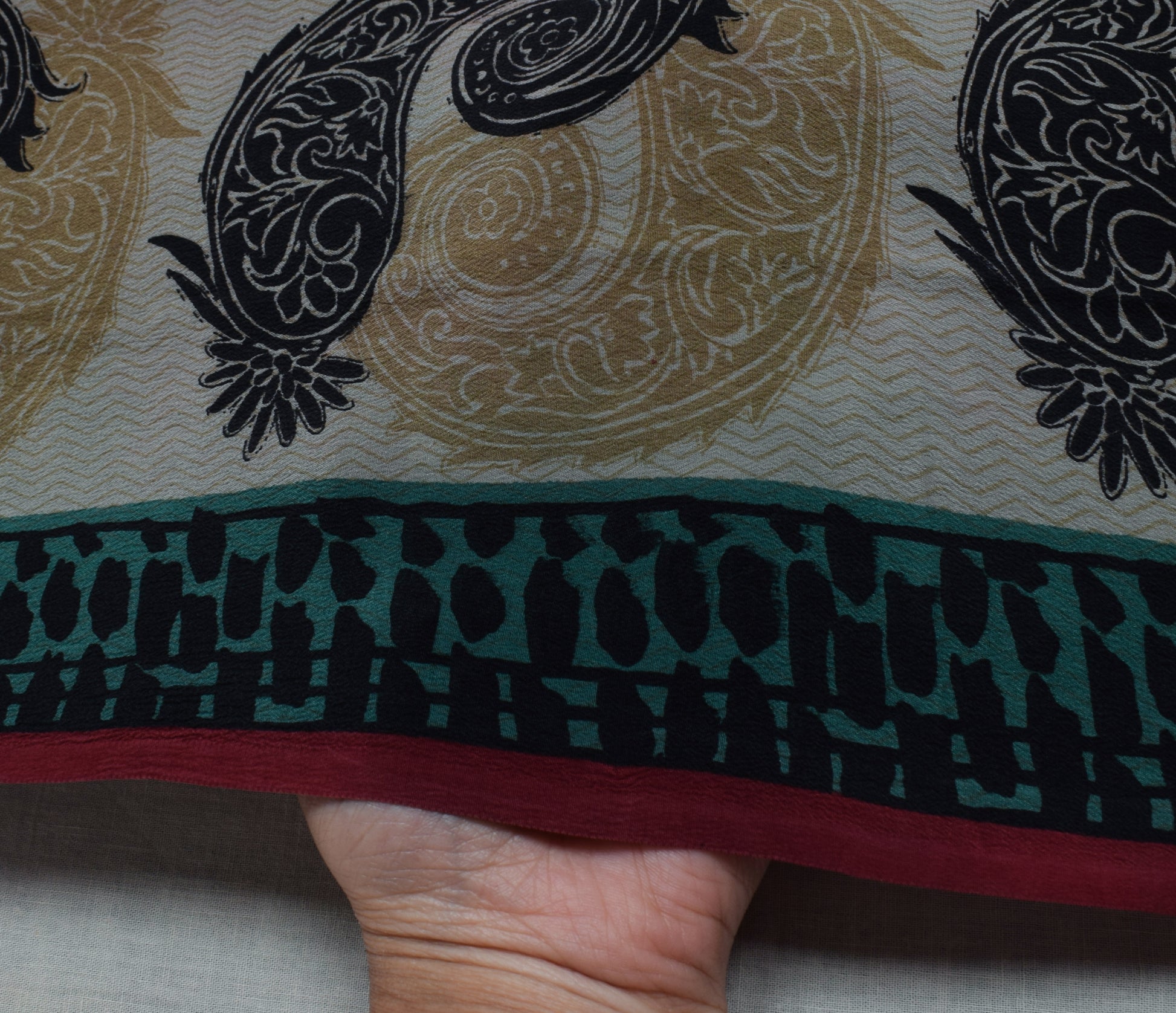 Capture vintage allure with this gray 100% pure crepe silk saree, beautifully crafted with paisley designs and intricate printed accents. Crafted from pure, breathable 100% pure crepe silk, this sarI boasts a luxurious drape and enduring appeal. Measuring roughly 192 inch in length and 43 inch in width, it offers versatile styling—whether worn traditionally or repurposed into bespoke dresses, home décor, or creative crafts. Weighing about 365 grams (actual product weight), it falls gracefully, making it ideal for anyone who appreciates the charm of vintage textiles.