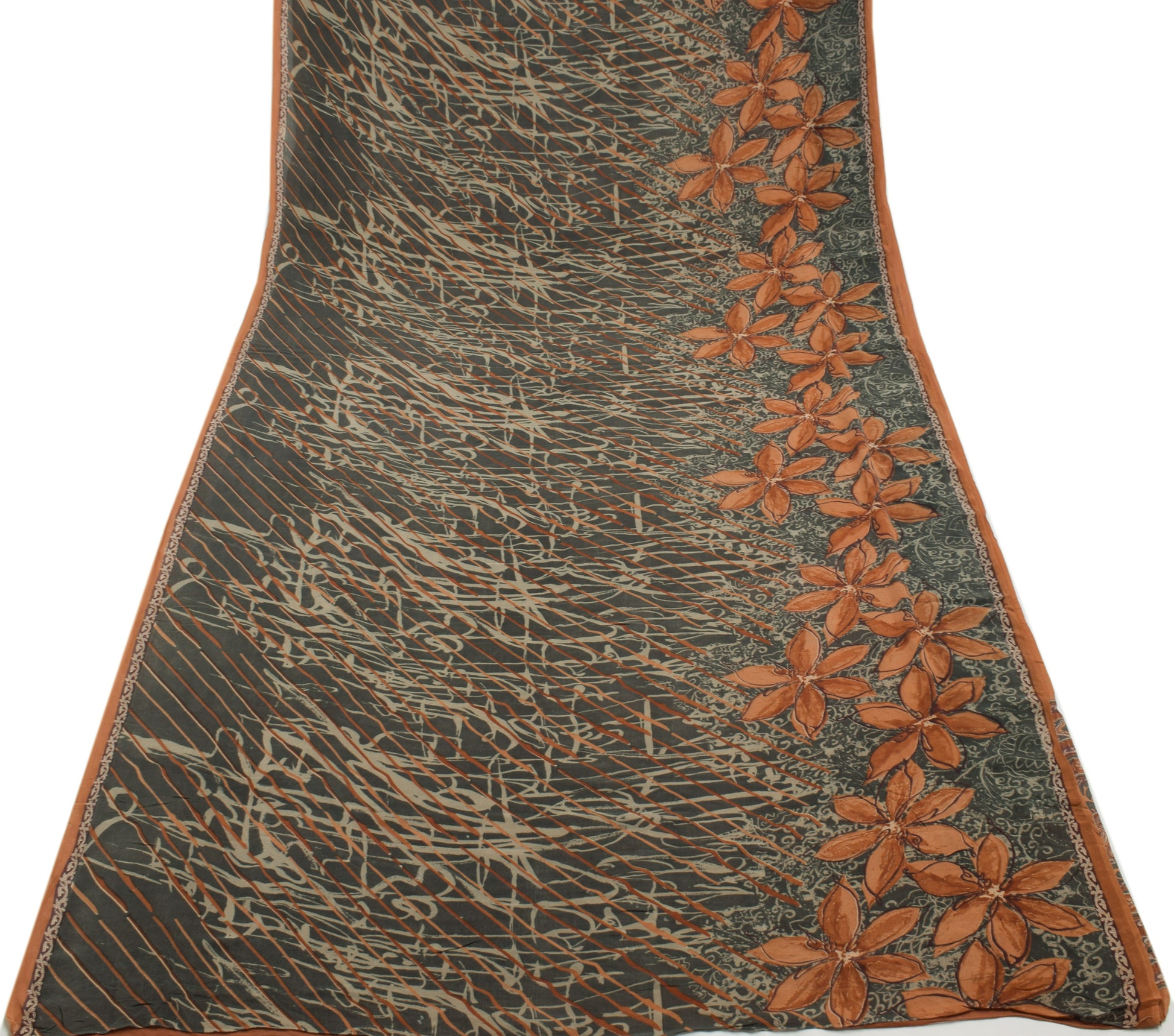 Sushila Vintage Gray Saree 100% Pure Georgette Silk Printed Floral Craft Fabric