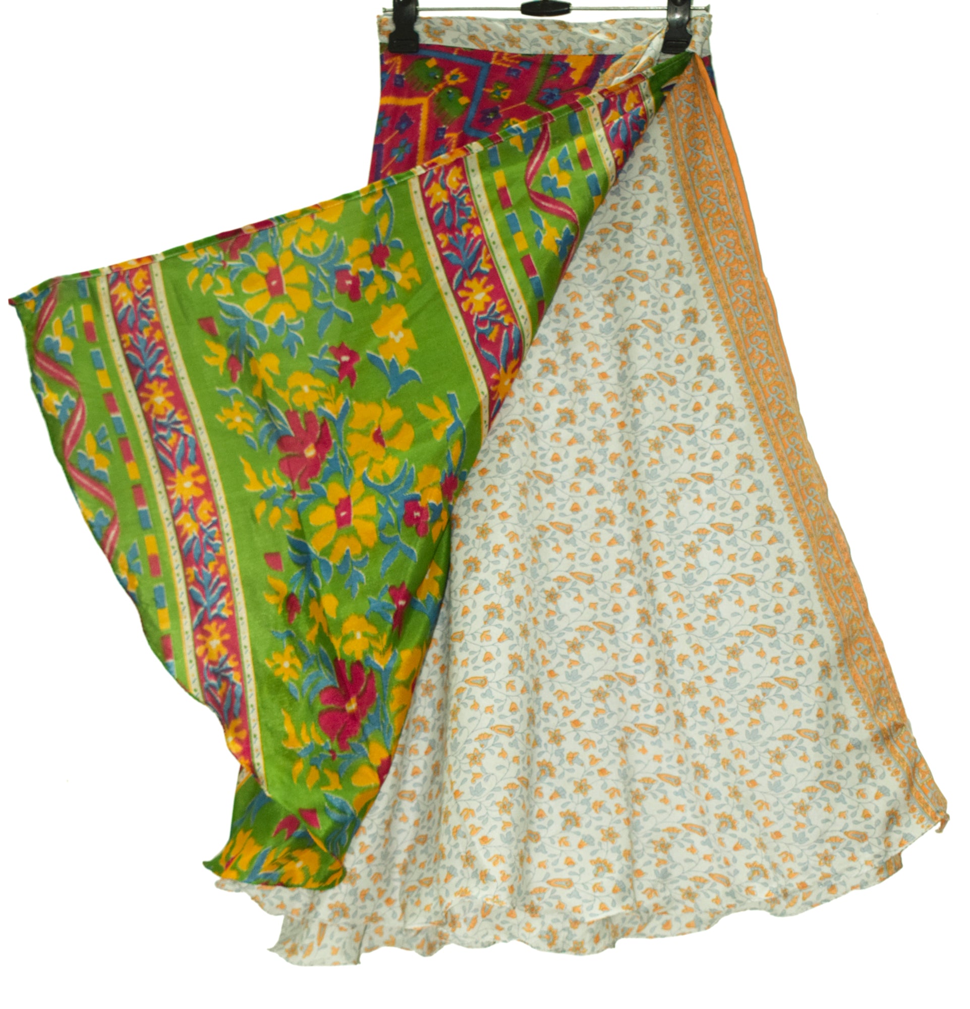 This reversible 2‑Layer Magic Wrap Skirt is crafted from pre‑owned vintage Art or Artificial Silk saree fabric, showcasing a charming green floral pattern for a perfect blend of style and sustainability. Ideal for beach outings, casual wear, or versatile styling, these skirts are lightweight, comfortable, and uniquely patterned. The vibrant designs and flowing fabric make them ideal for pairing with shirts, T‑shirts, or Kurtis. These skirts can be styled in multiple ways, offering endless possibilities for fashion enthusiasts. For styling ideas, simply search for "magic wrap skirt tutorial" on YouTube.