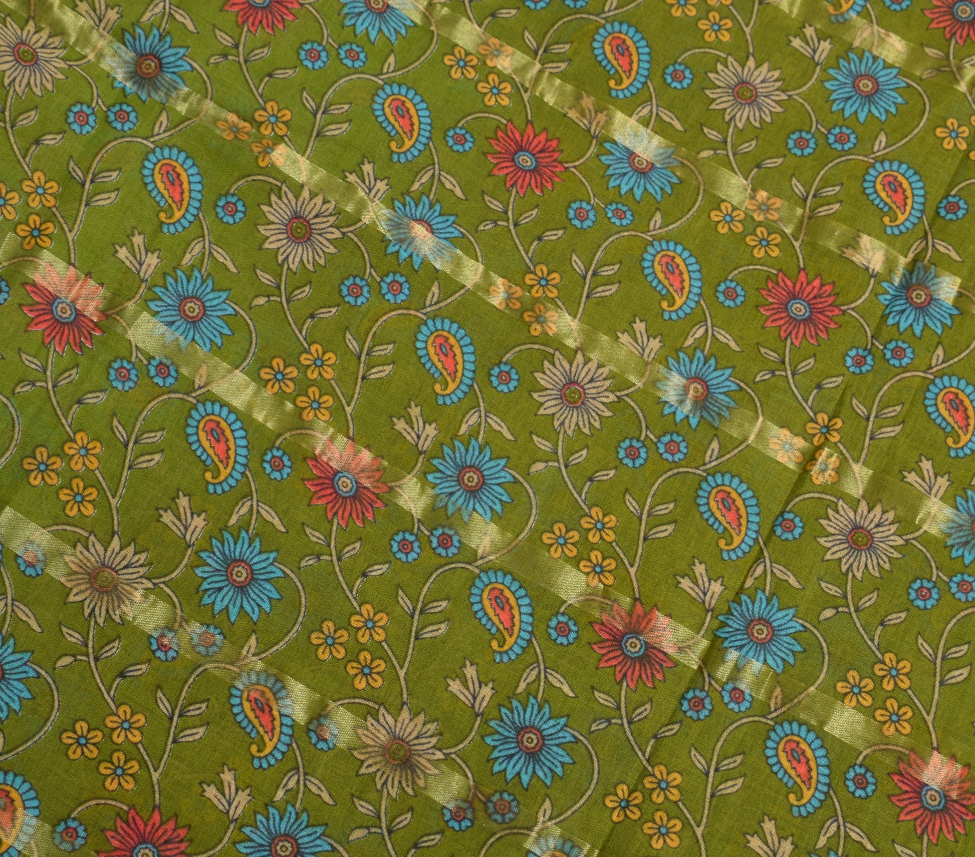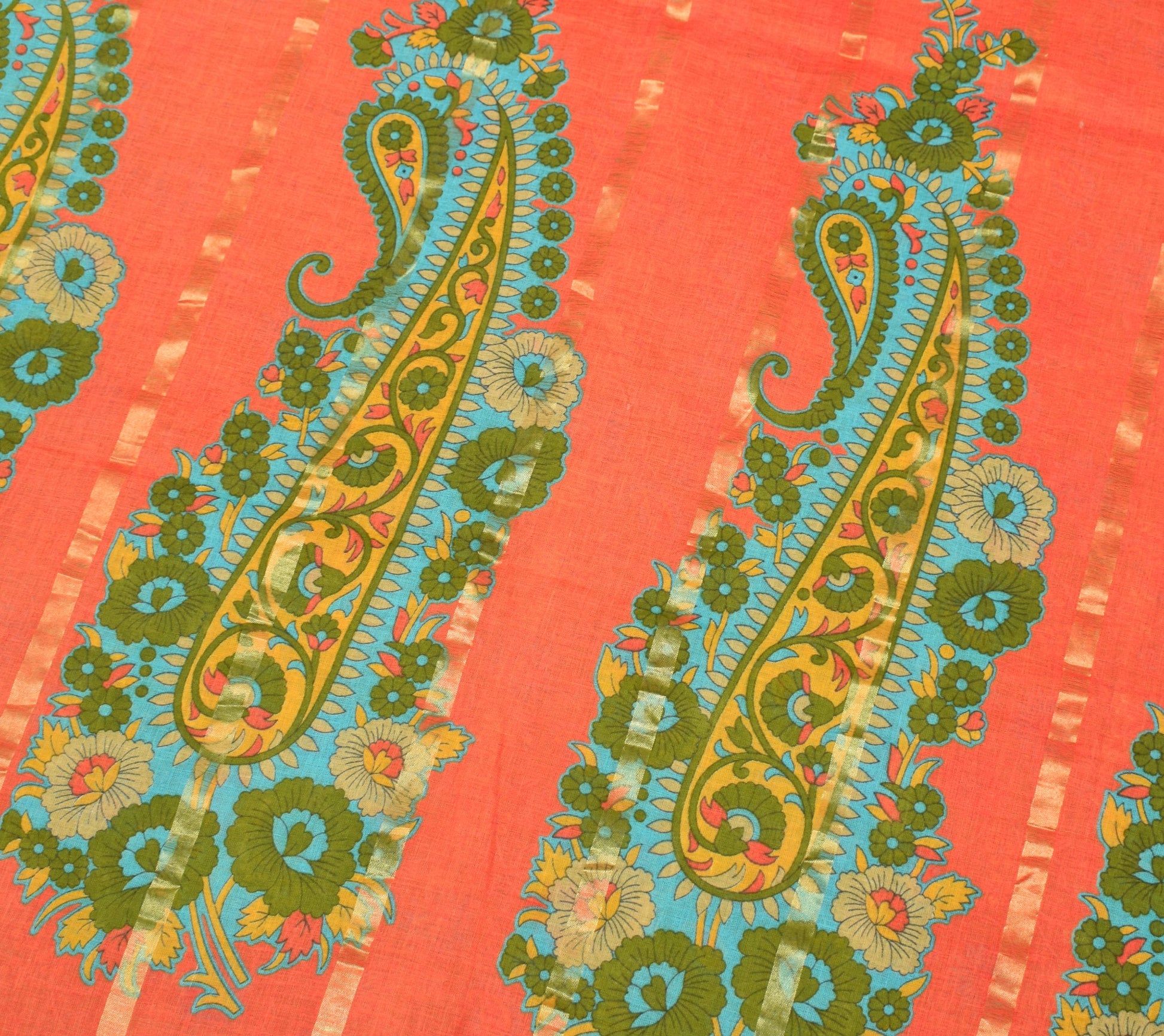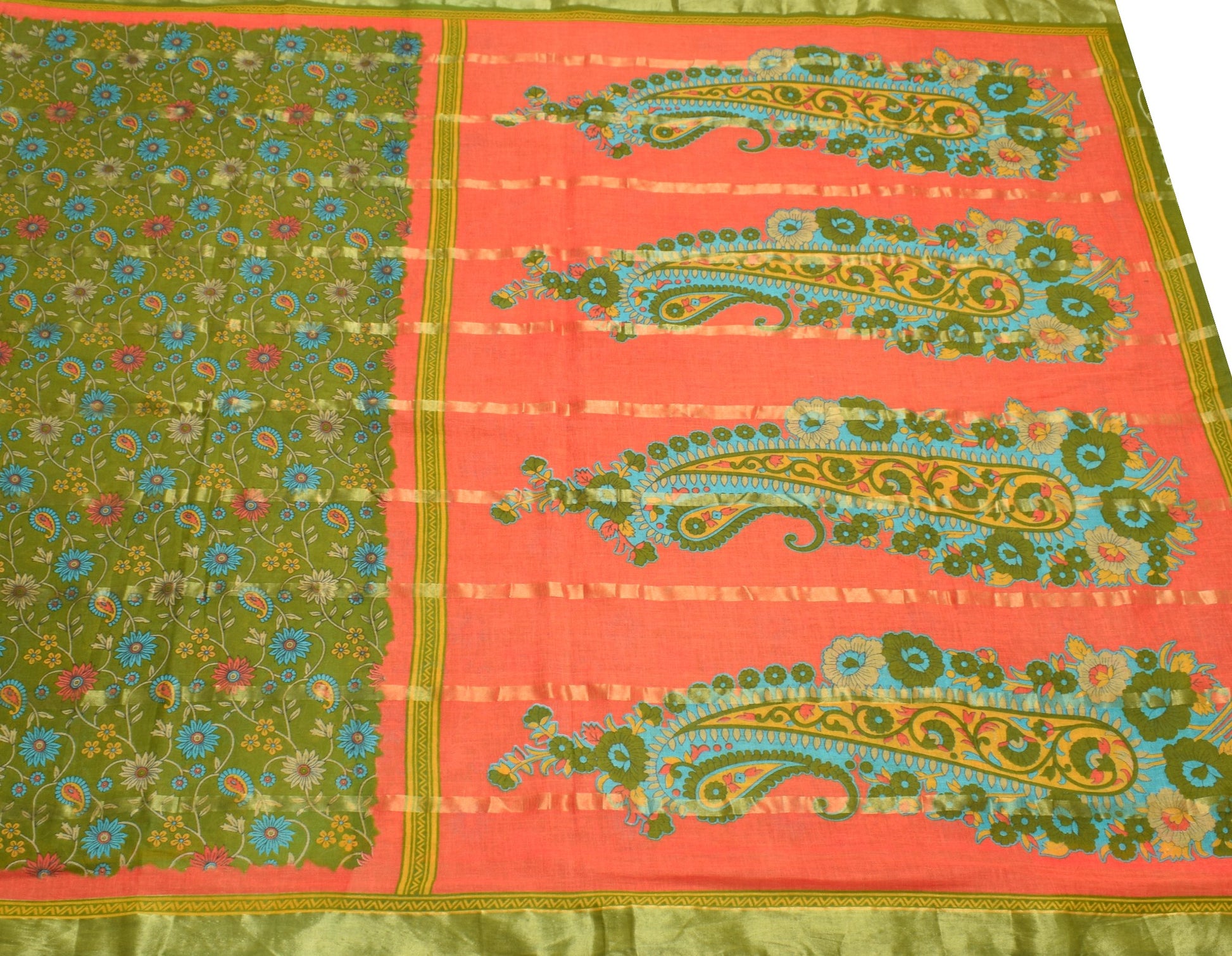 Sushila Vintage Green Orange Floral Saree 100% Pure Cotton Printed Craft Fabric