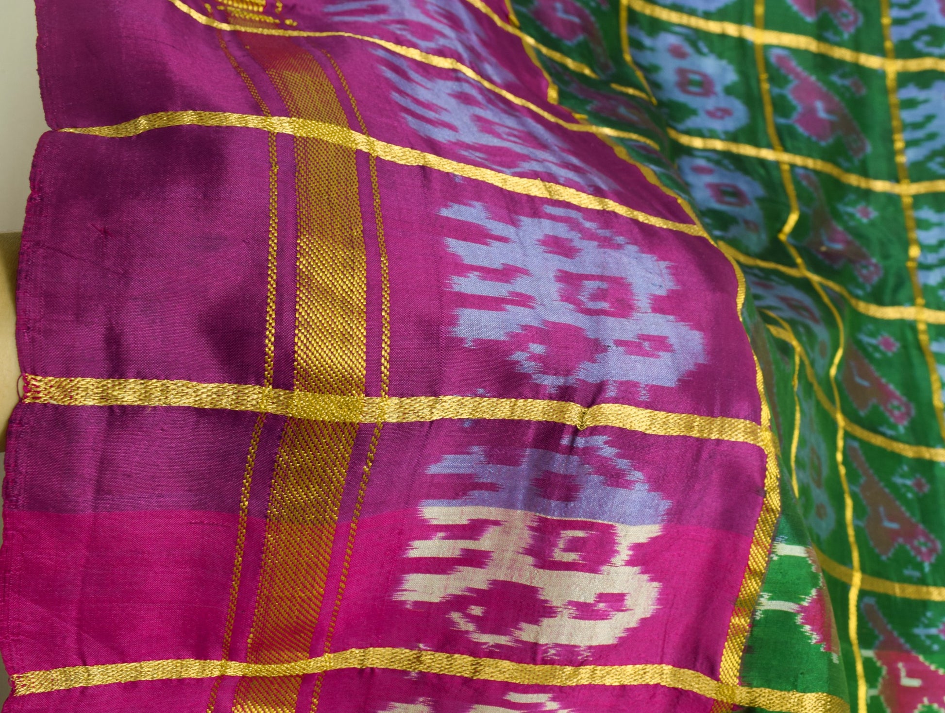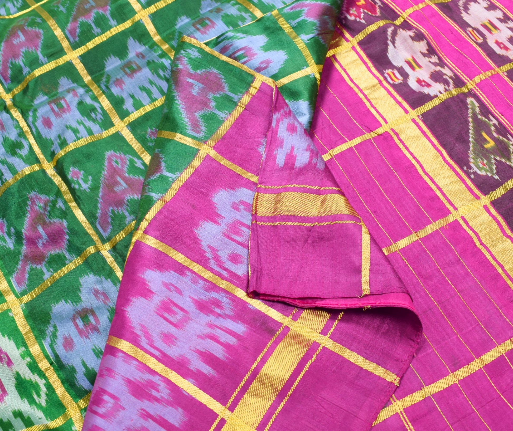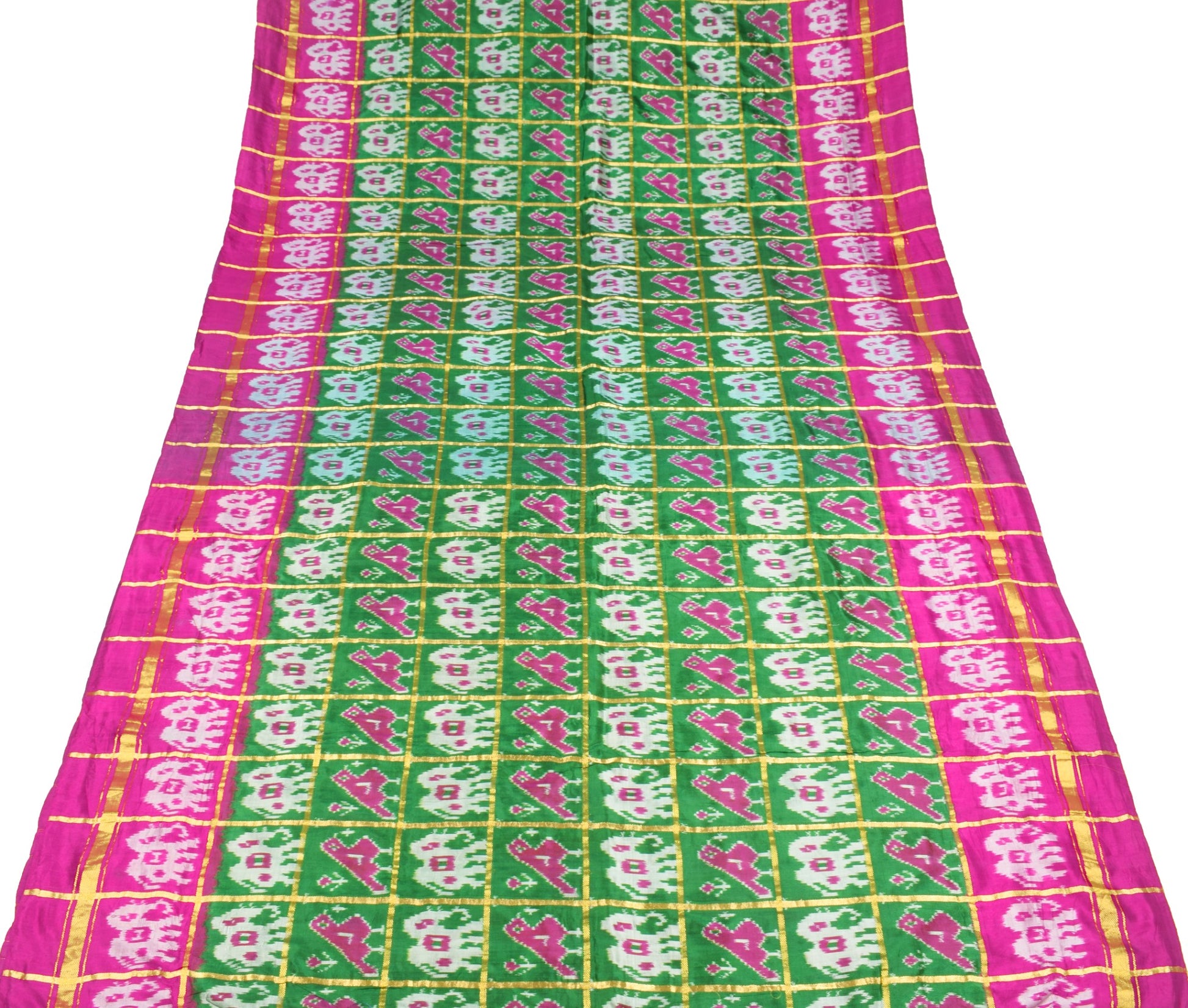 Sushila Vintage Green Patola Saree Pure Silk Handloom Checks Ikat Sari Fabric
