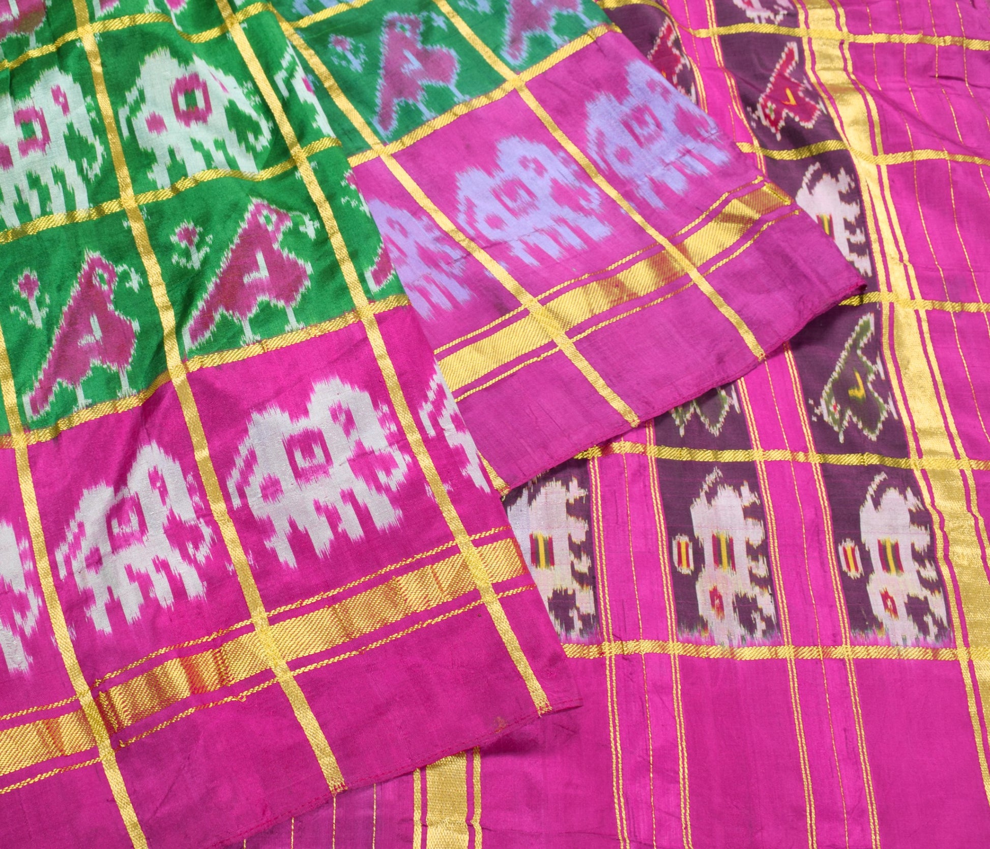 Green Magenta patola-style animal Birds motif enclosed checked ikkat saree, contrast elephant Birds motif border & pallu of ikkat designs