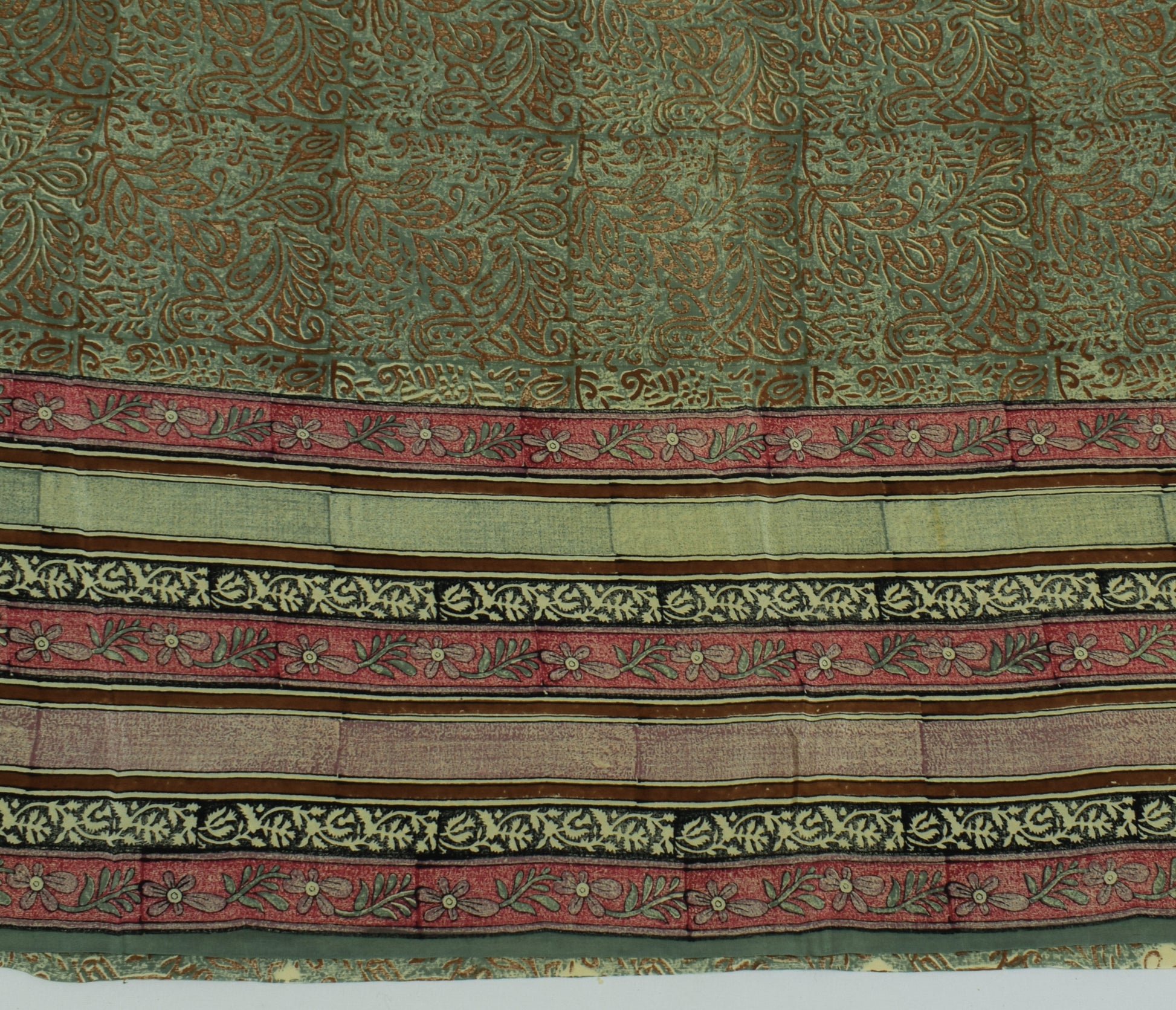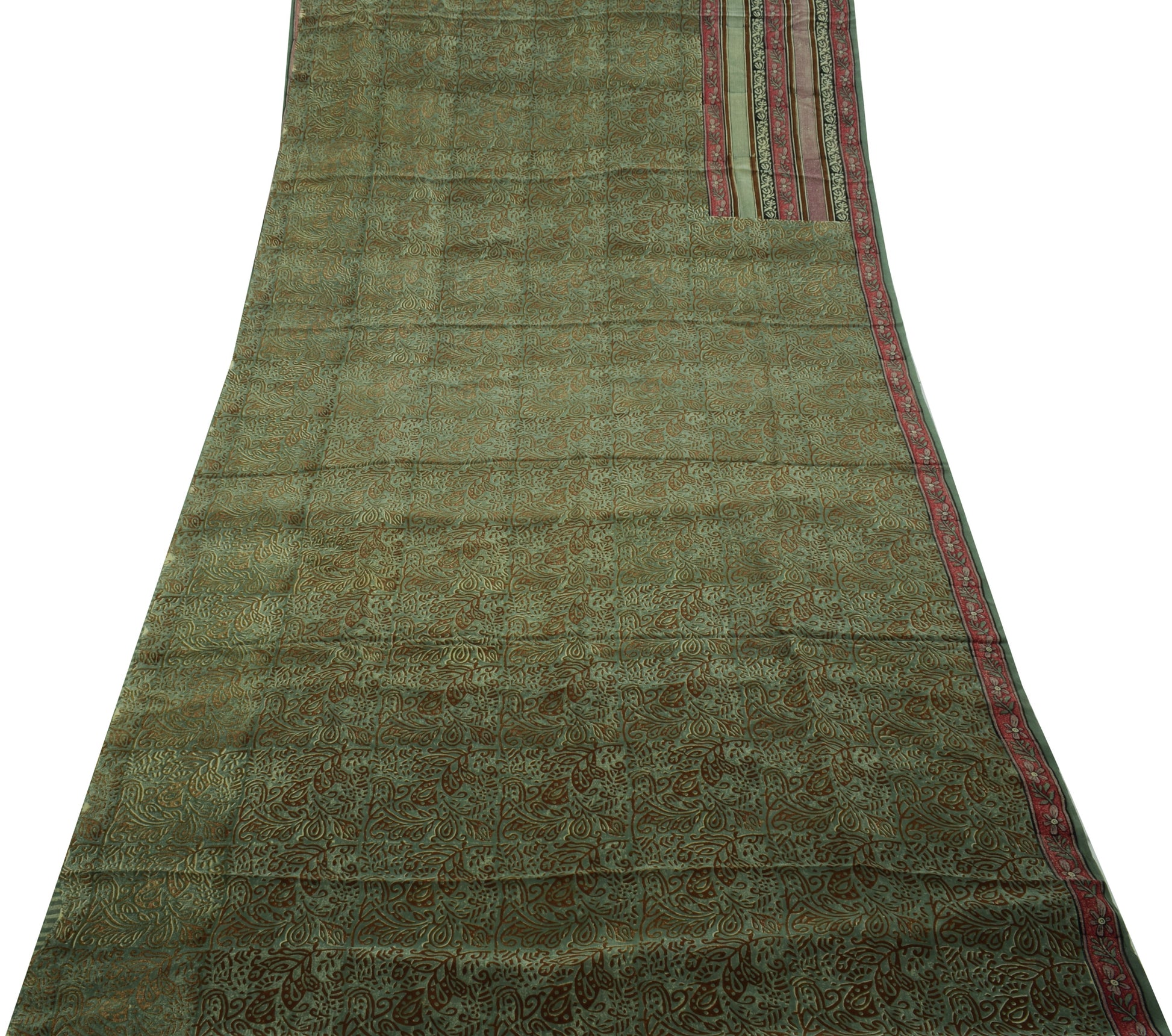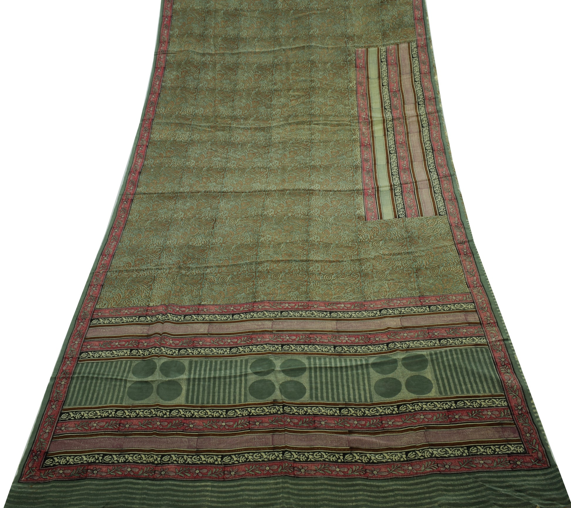 Step into timeless elegance with this green 100% pure crepe silk saree, featuring delicate floral motifs and hand block printed detailing. Crafted from pure, breathable 100% pure crepe silk, this sarI boasts a luxurious drape and enduring appeal. Measuring roughly 222 inch in length and 43 inch in width, it offers versatile styling—whether worn traditionally or repurposed into bespoke dresses, home décor, or creative crafts. Weighing about 390 grams (actual product weight), it falls gracefully, making it ideal for anyone who appreciates the charm of vintage textiles.