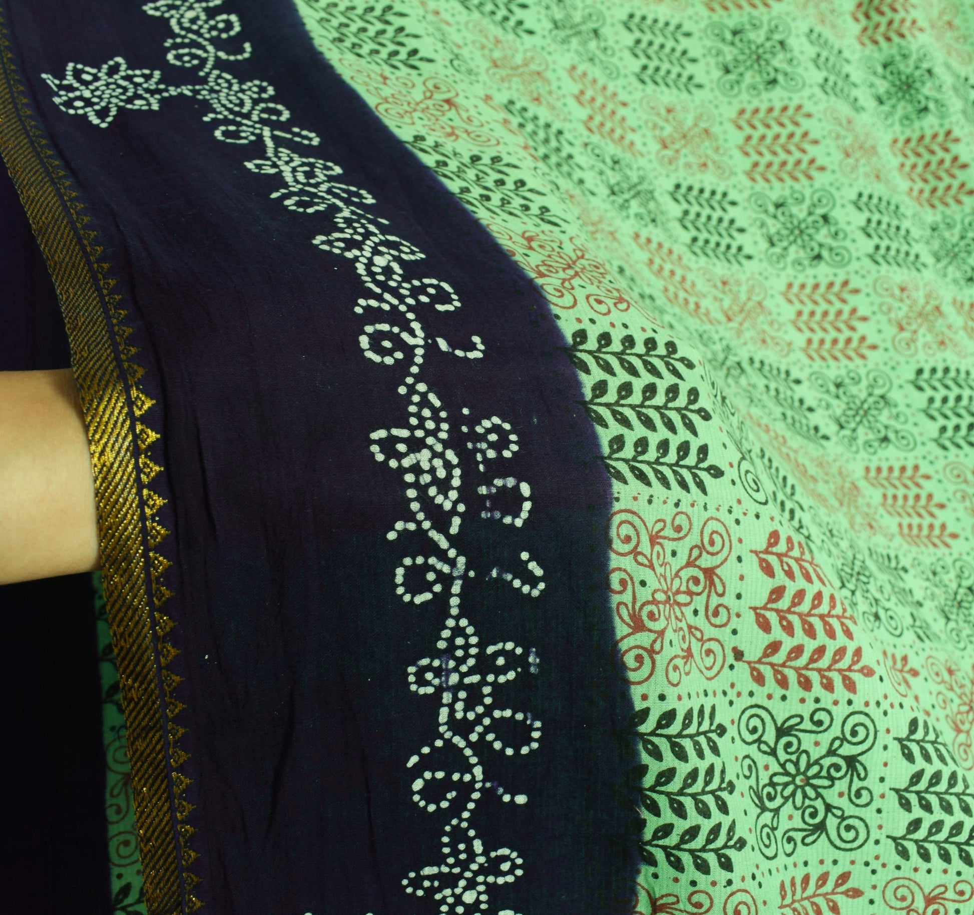 A blend of tradition and earthy charm, this hand-printed cotton saree is a timeless treasure.