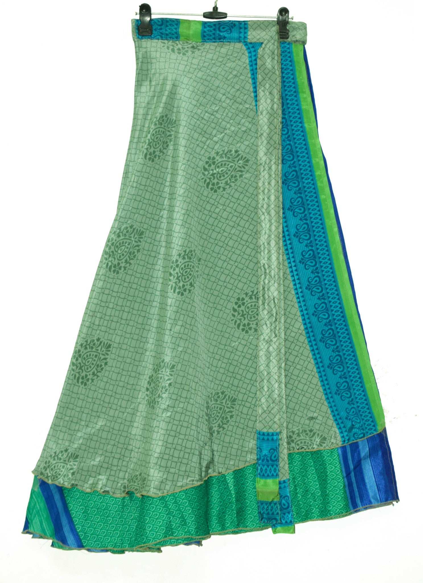 This reversible 2‑Layer Magic Wrap Skirt is crafted from pre‑owned vintage Art or Artificial Silk saree fabric, showcasing a charming green floral pattern for a perfect blend of style and sustainability. Ideal for beach outings, casual wear, or versatile styling, these skirts are lightweight, comfortable, and uniquely patterned. The vibrant designs and flowing fabric make them ideal for pairing with shirts, T‑shirts, or Kurtis. These skirts can be styled in multiple ways, offering endless possibilities for fashion enthusiasts. For styling ideas, simply search for "magic wrap skirt tutorial" on YouTube.