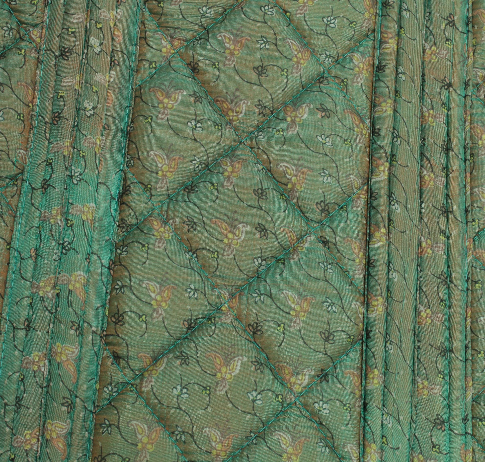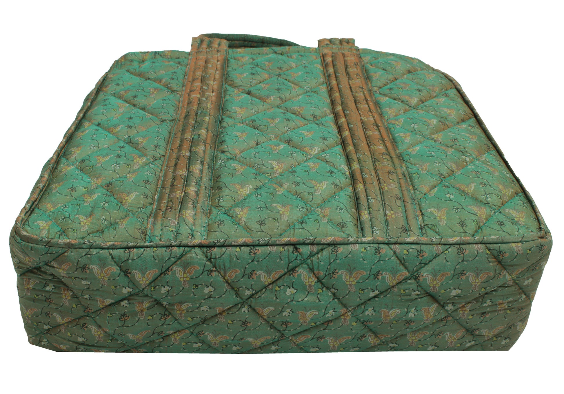 The outer fabric is 100% Pure Silk Printed Saree Fabric quilted with Foam and, Middle layer uses water resistant fabric and the inner layer uses Roto Fabric.