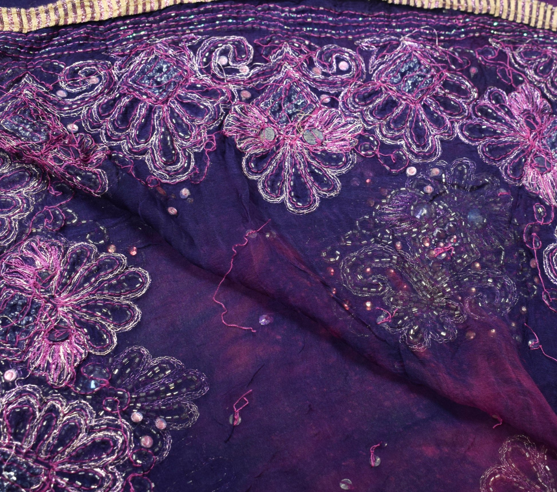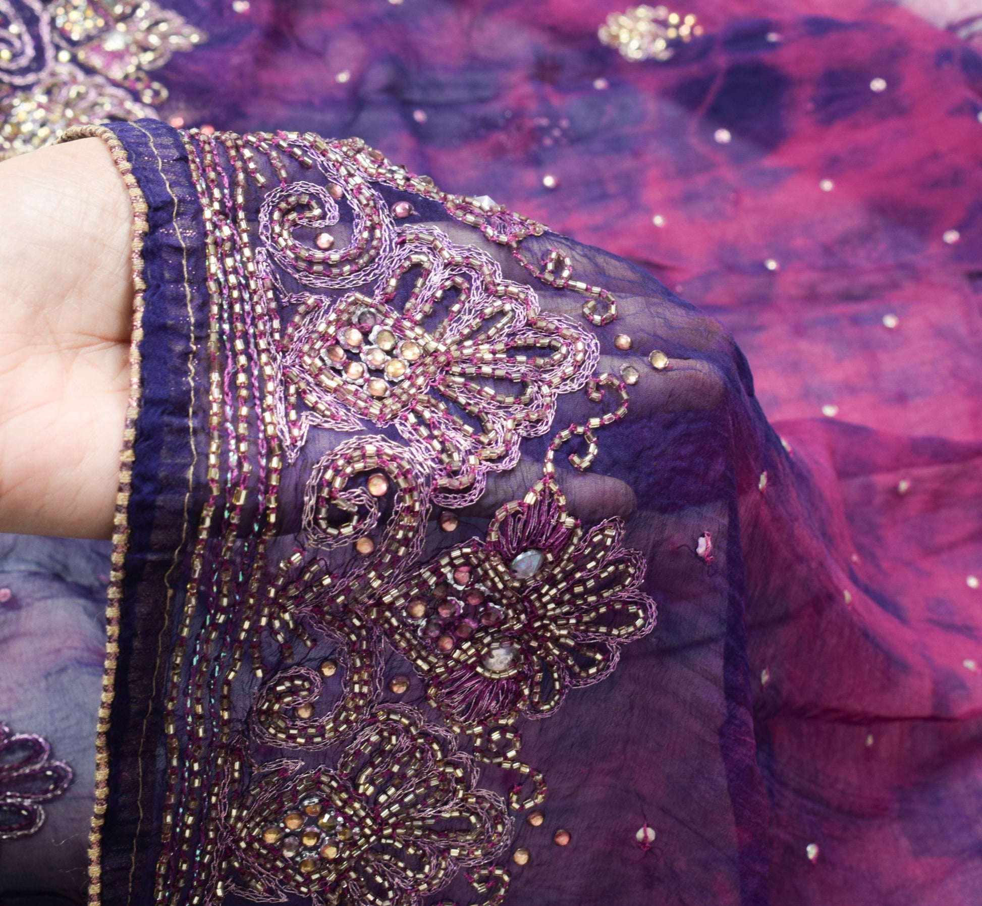 Turn heads with this vibrant and luxurious dupatta, crafted from 100% pure chiffon silk and drenched in a stunning blend of blue and purple tie-dye hues. Adorned with dazzling hand beaded work, glass beads, rhinestones, and rich zari embroidery, this piece is a celebration of intricate craftsmanship and artistic flair.