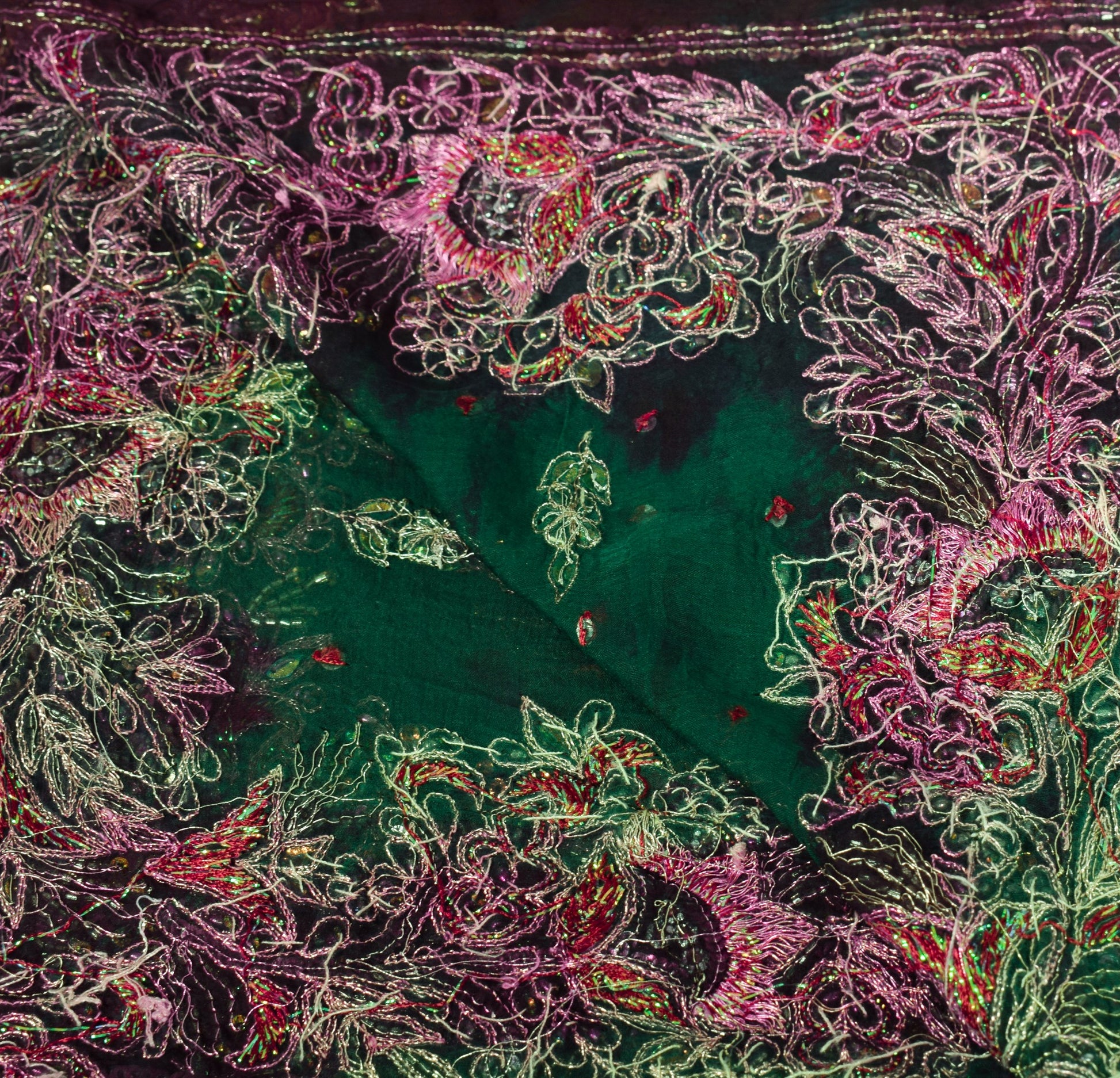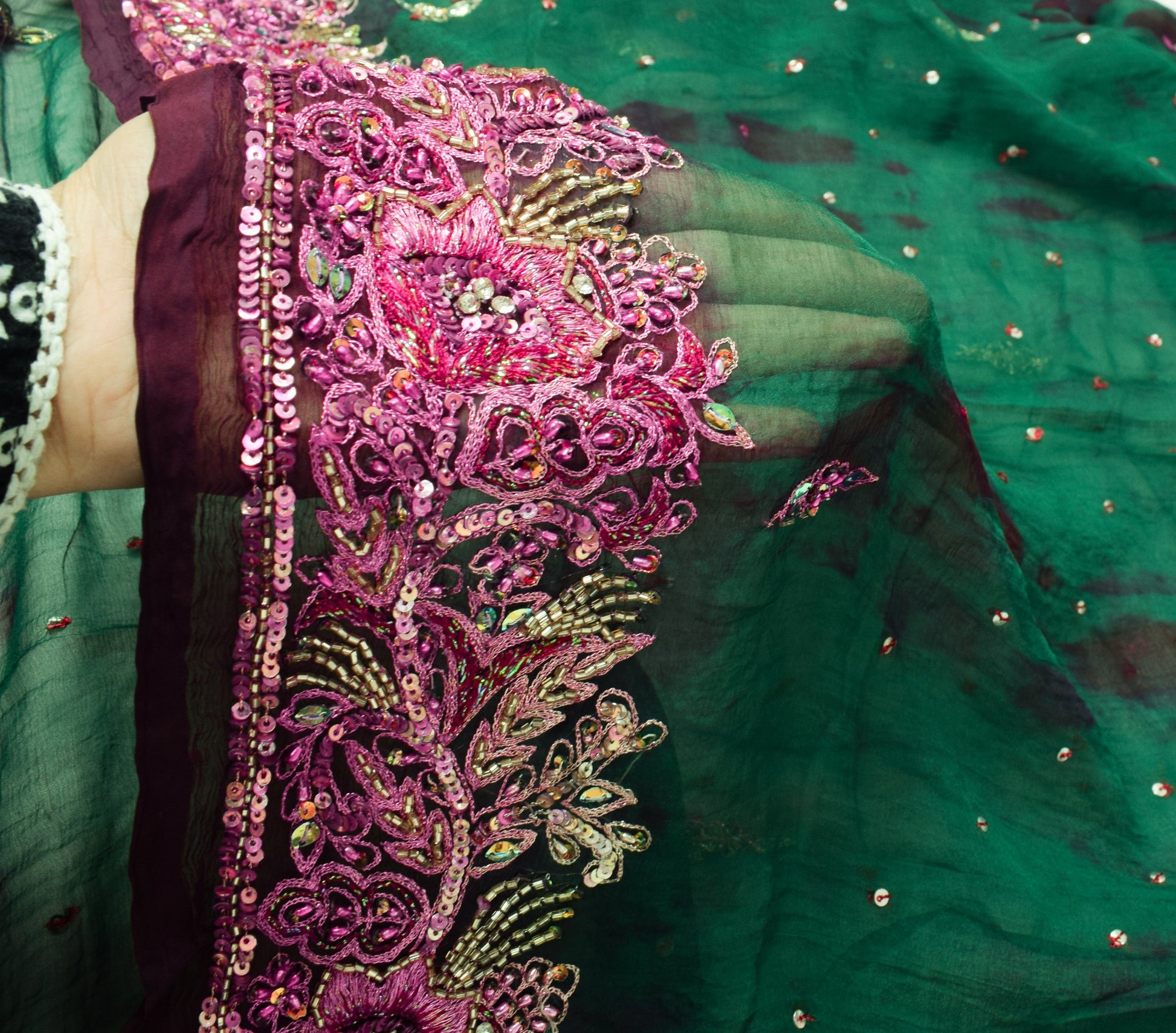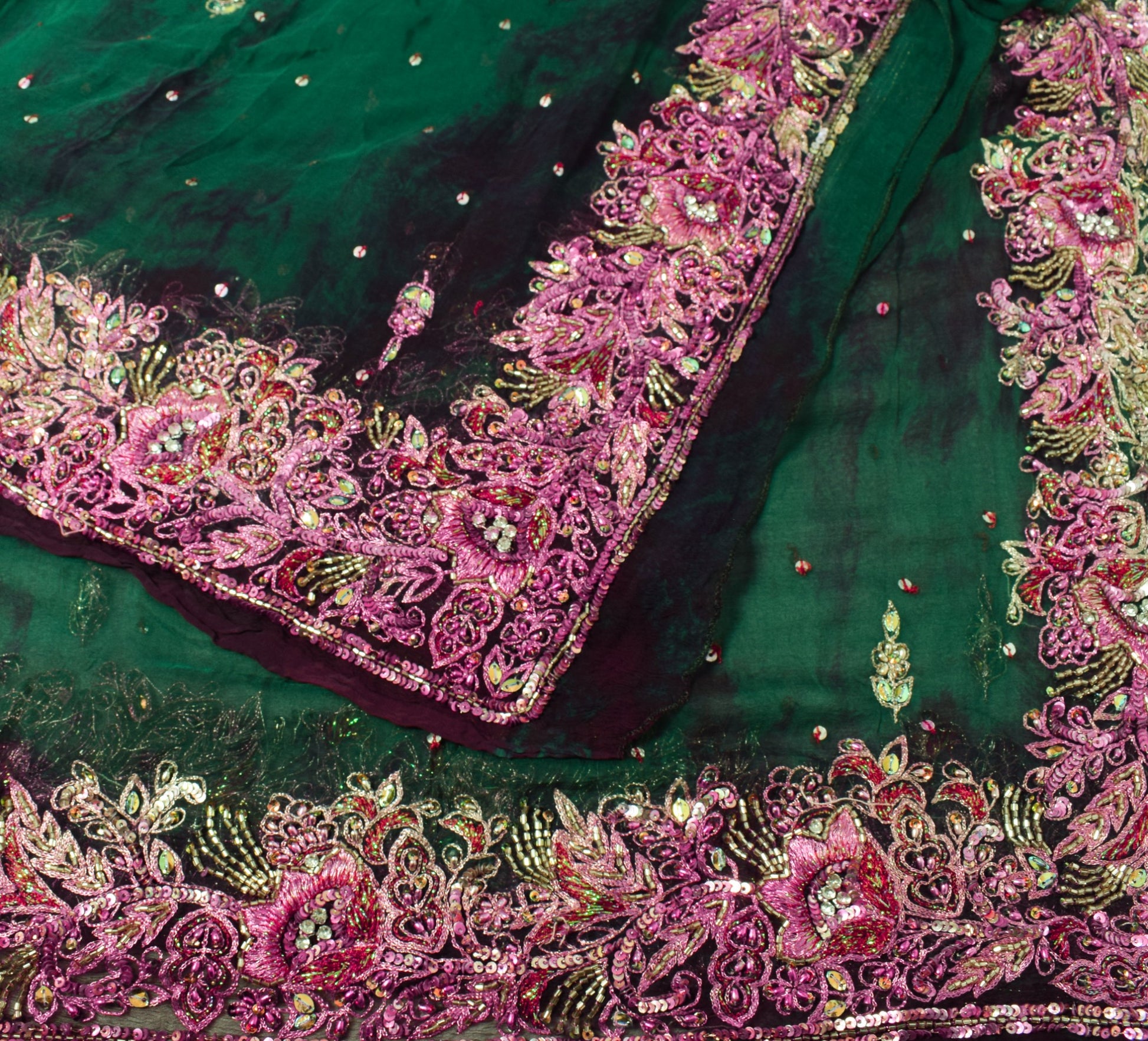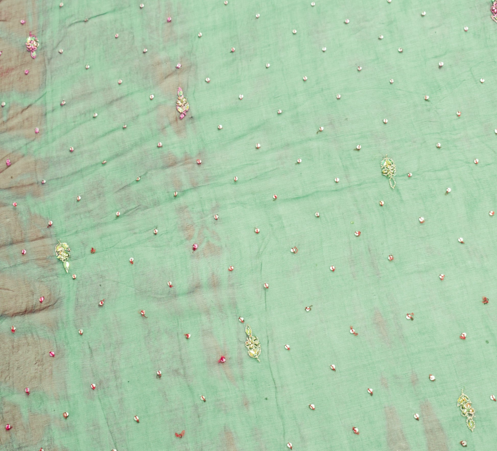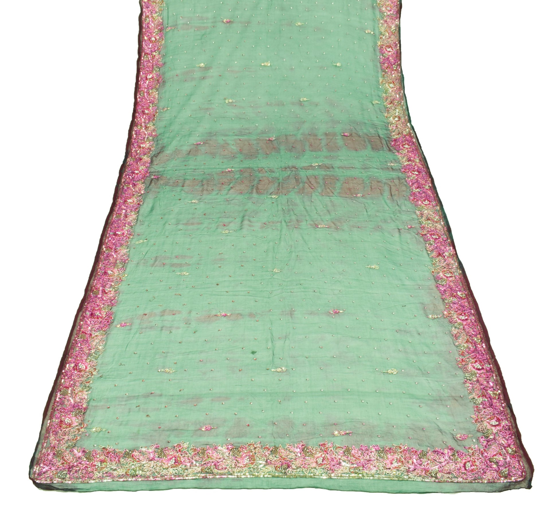 Sushila Vintage Hand Beaded Dupatta Blue Pure Chiffon Tie-Dye Green Long Stole