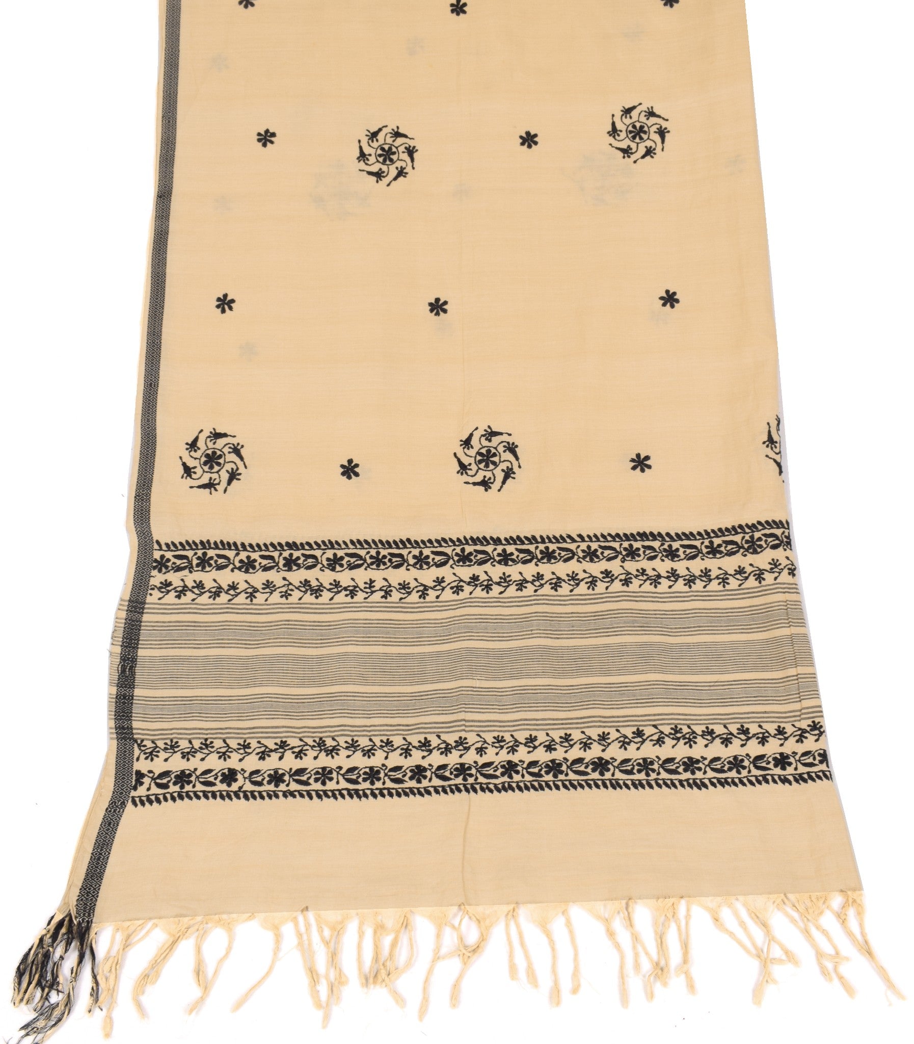 Grace meets craftsmanship in this elegant 100% pure cotton dupatta, featuring delicate floral patterns brought to life through intricate hand embroidery and woven detailing. Rendered in a soft, timeless cream hue, this piece exudes understated sophistication. Measuring 96 x 42 inches and weighing 220 grams, it offers a graceful drape and breathable comfort. A beautiful pre-loved treasure, perfect for those who cherish artisanal textiles and slow fashion.