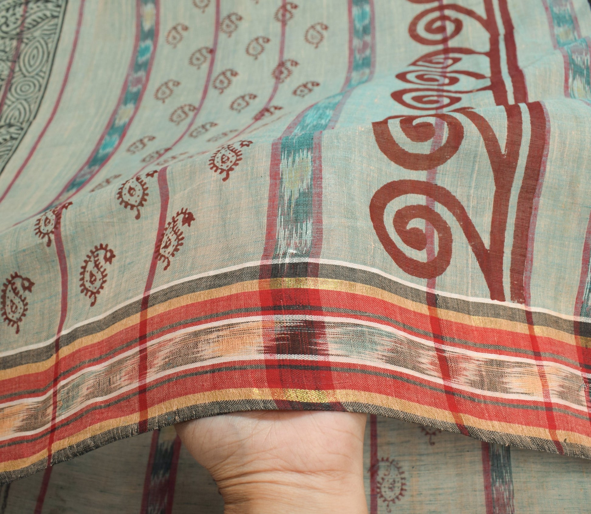 Celebrate the artistry of Indian textiles with this handwoven pure cotton saree, featuring a rare fusion of vibrant hand block-printed paisley motifs and intricate Ikat weaving. The multi-color design bursts with character, blending the rustic charm of Rajasthan’s block print with the rhythmic geometry of Telangana or Odisha Ikat.