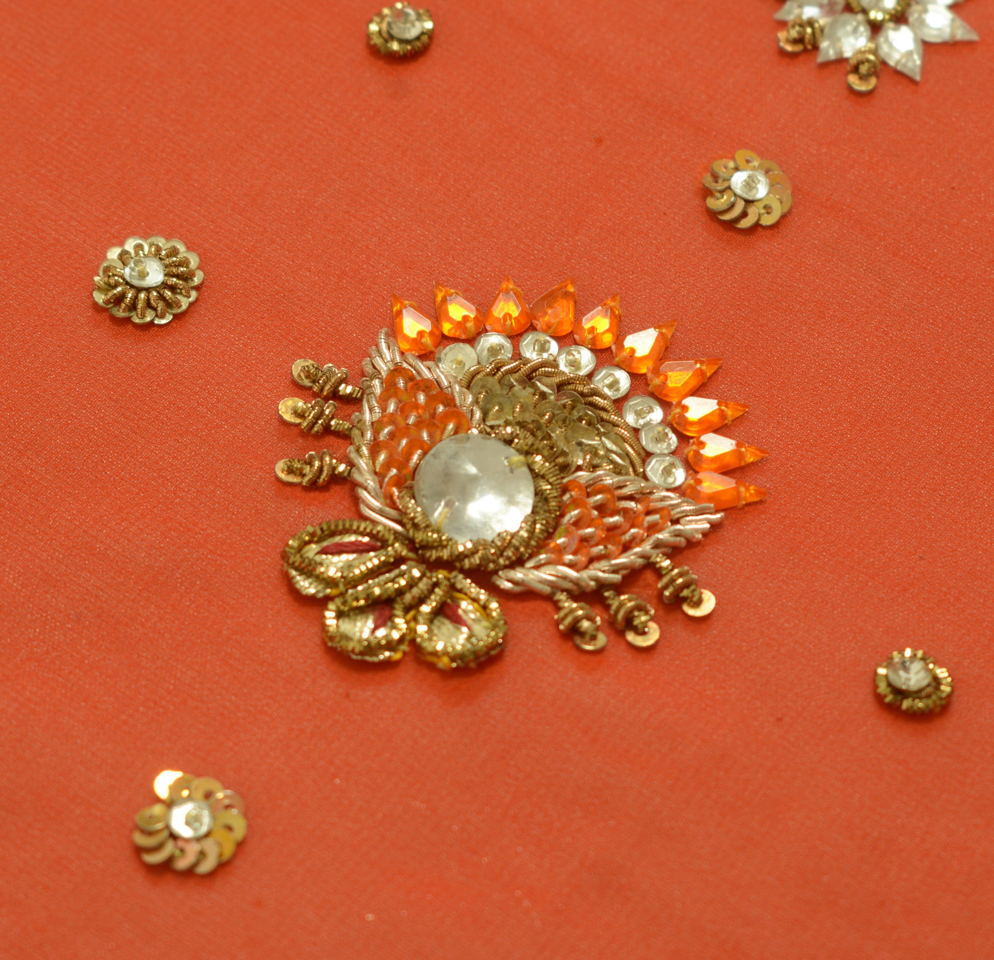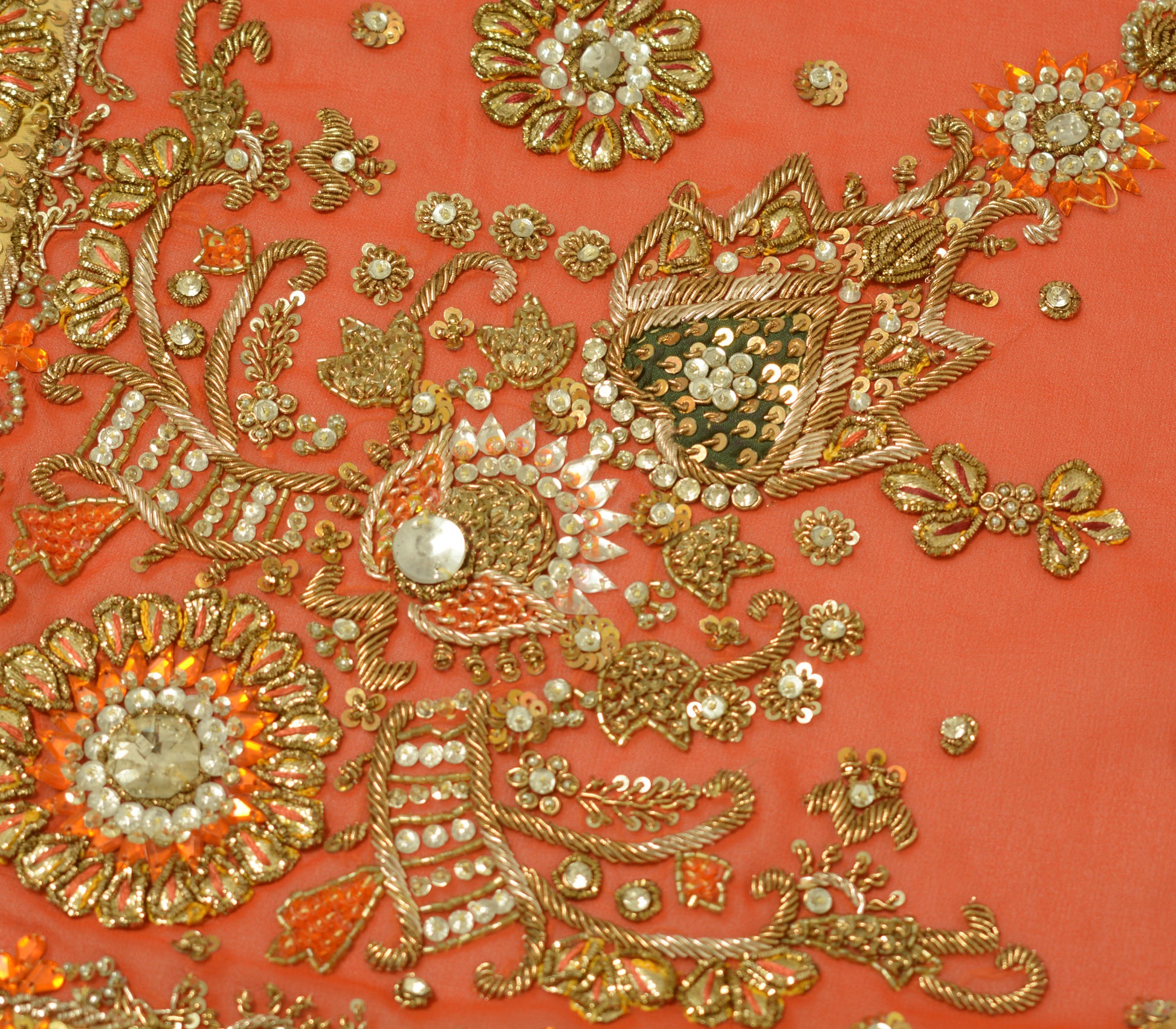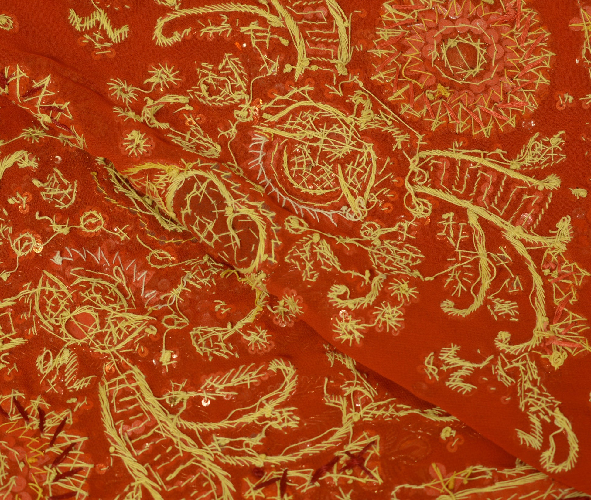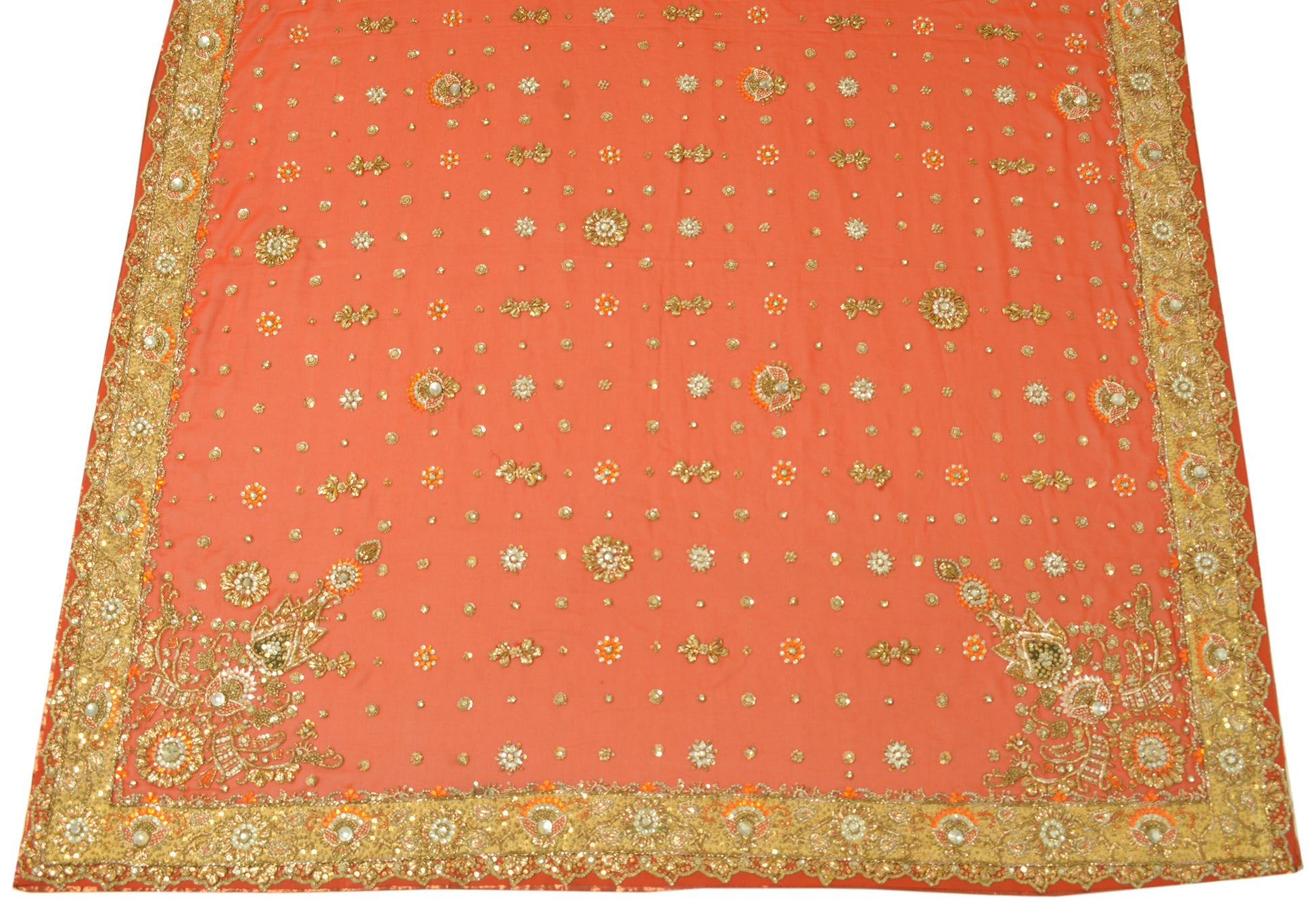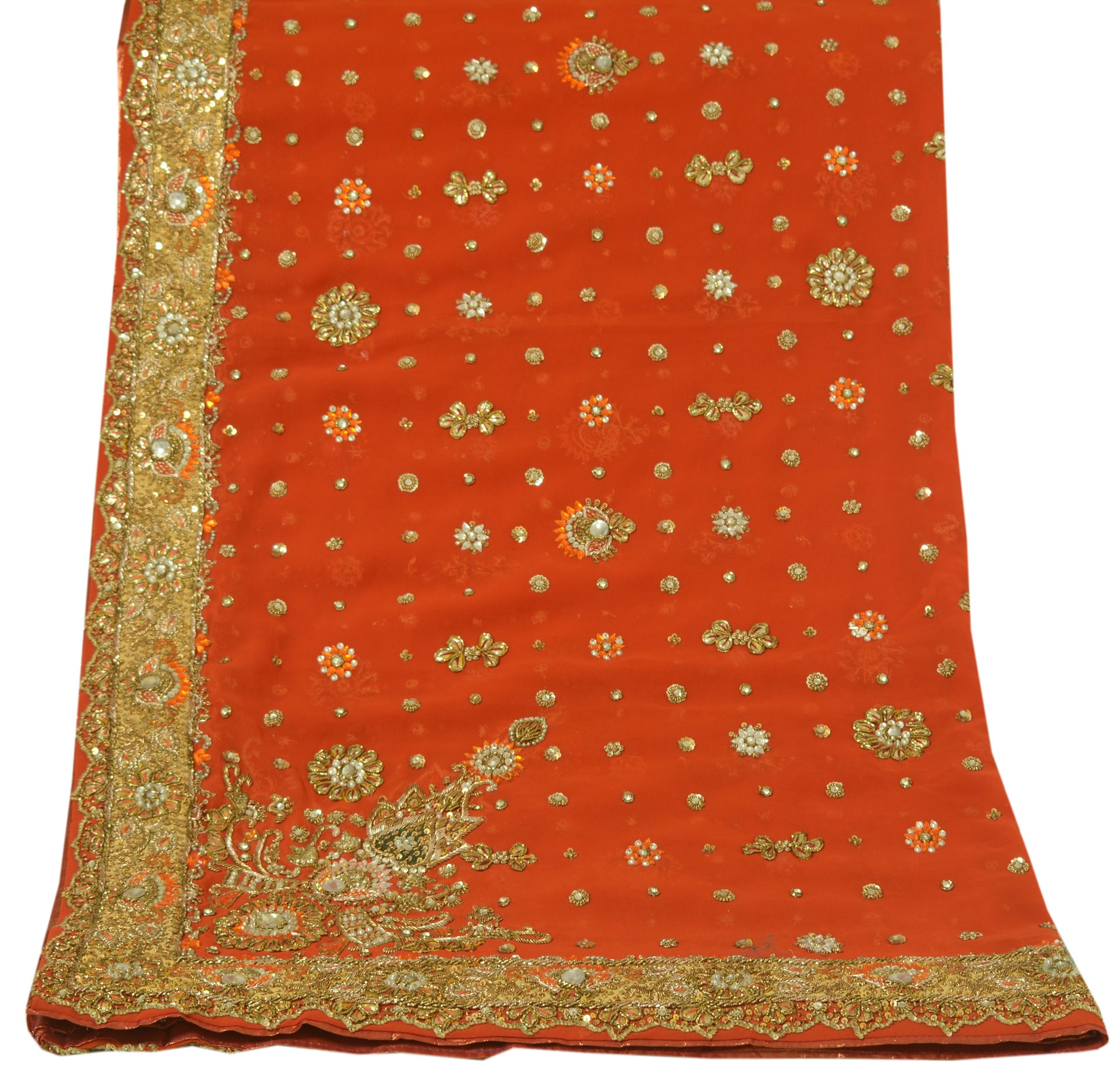 Add a touch of cultural heritage to your collection with this beautiful Dark Orange Floral Heavy Dupatta, ideal for use as an Indian Long Stole, Scarves, Veil, or Hijab. Crafted from premium Georgette (Not Sure Pure or Blend Due finished Edges unable to do the burn test)Â, this piece features intricate Hand Beaded Zardozi Work, Sequins Work, Rhine Stone work that captures the rich cultural heritage of India. The Dark Orange base beautifully complements the delicate Floral details, making it a perfect choice for weddings, festivals, or creative upcycling projects.