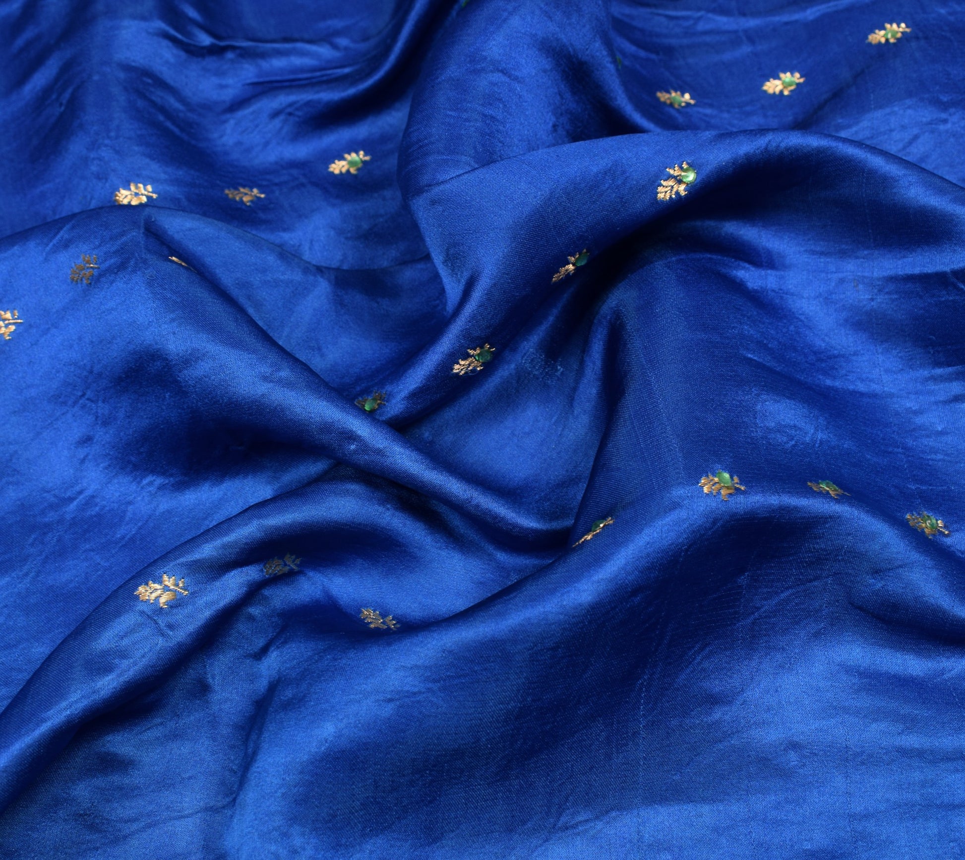 Drape yourself in timeless luxury with this Sushila Vintage Banarasi saree, crafted from 100% pure satin silk in a deep, regal blue. Adorned with shimmering golden zari brocade, delicate beadwork, and sparkling rhinestones, this saree is a true celebration of handcrafted heritage. The floral motifs woven throughout lend an air of classic sophistication, while the weight and texture speak to its rich, premium quality.