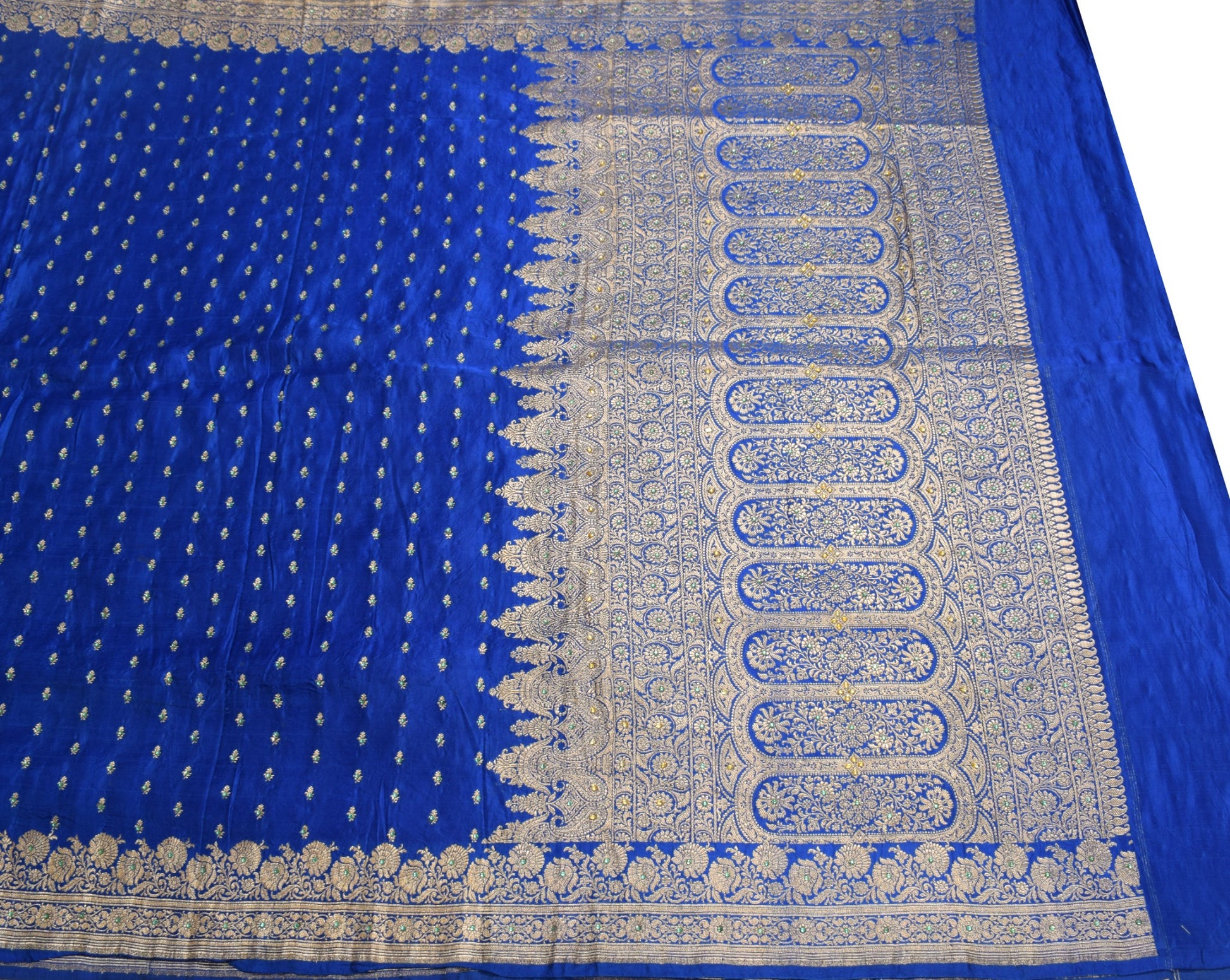 Sushila Vintage Heavy Saree Pure Satin Silk Banarasi Brocade Blue Sari Fabric