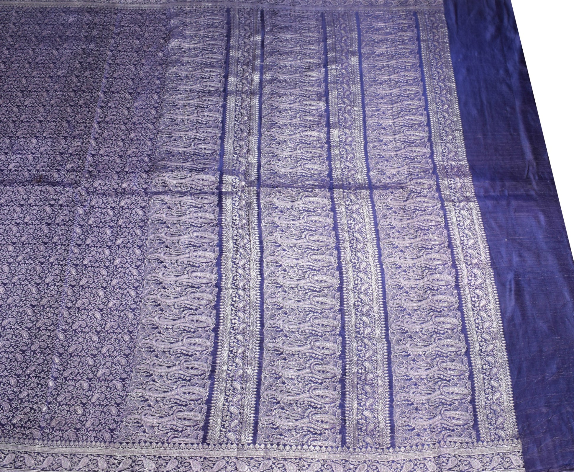 Experience the timeless grandeur of Indian craftsmanship with this Sushila Vintage Banarasi Saree, a true heirloom woven from 100% pure satin silk in a deep, royal blue. Adorned with intricately woven paisley motifs, this saree reflects the centuries-old artistry of Varanasi's legendary weaving traditions.