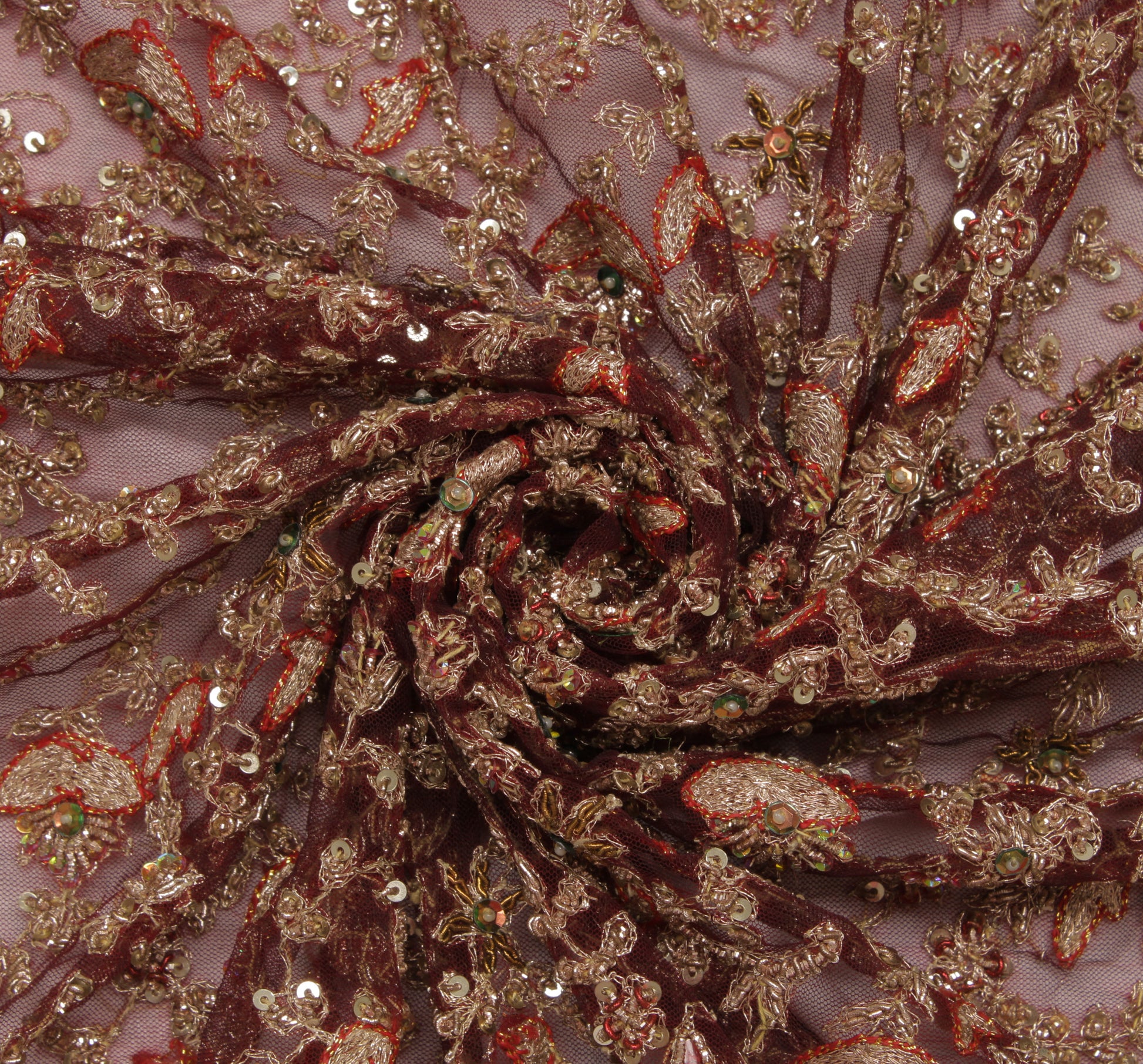 Wrap yourself in the artistry of this beautiful Maroon Floral Dupatta, Scarf, Indian Long Stole, Veil, or Hijab, a timeless addition to your wardrobe. Made from premium Net Mesh, this piece features intricate Hand Beaded Zardozi Work, Sequins Work & Zari Embroidered work, adding a touch of traditional charm to any outfit. The Maroon base beautifully complements the delicate Floral detailing, creating a truly timeless accessory.
