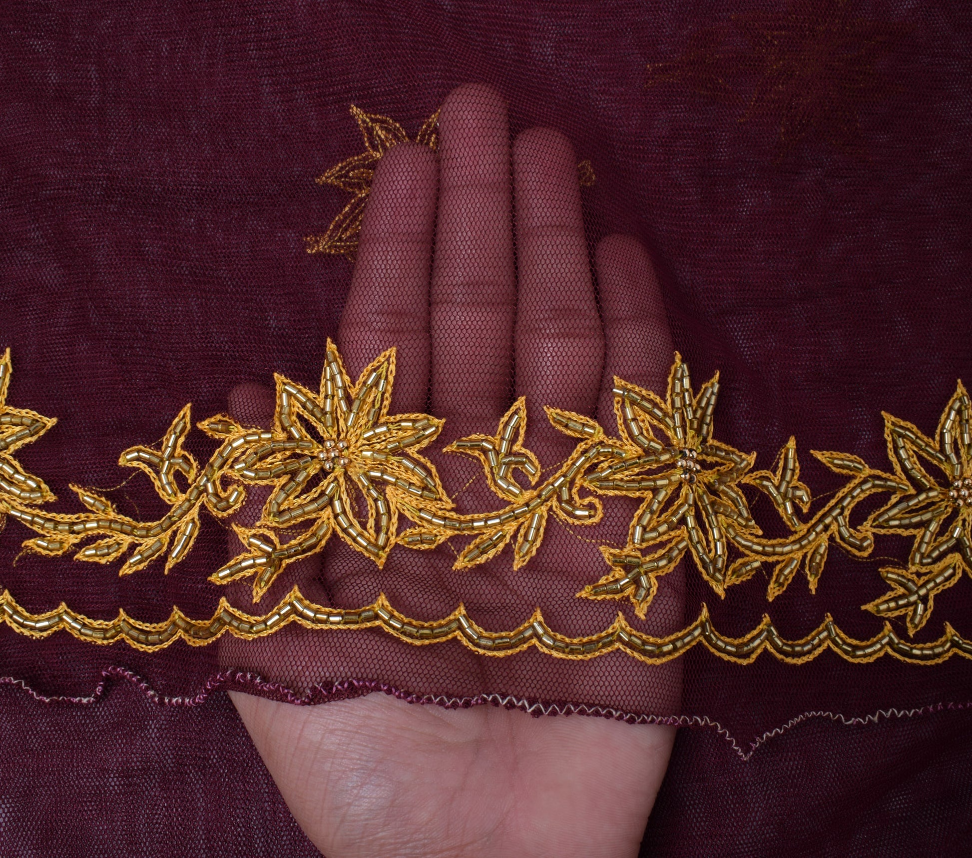 Sushila Vintage Maroon Indian Dupatta Net Mesh Hand Beaded Long Wrap Scarves