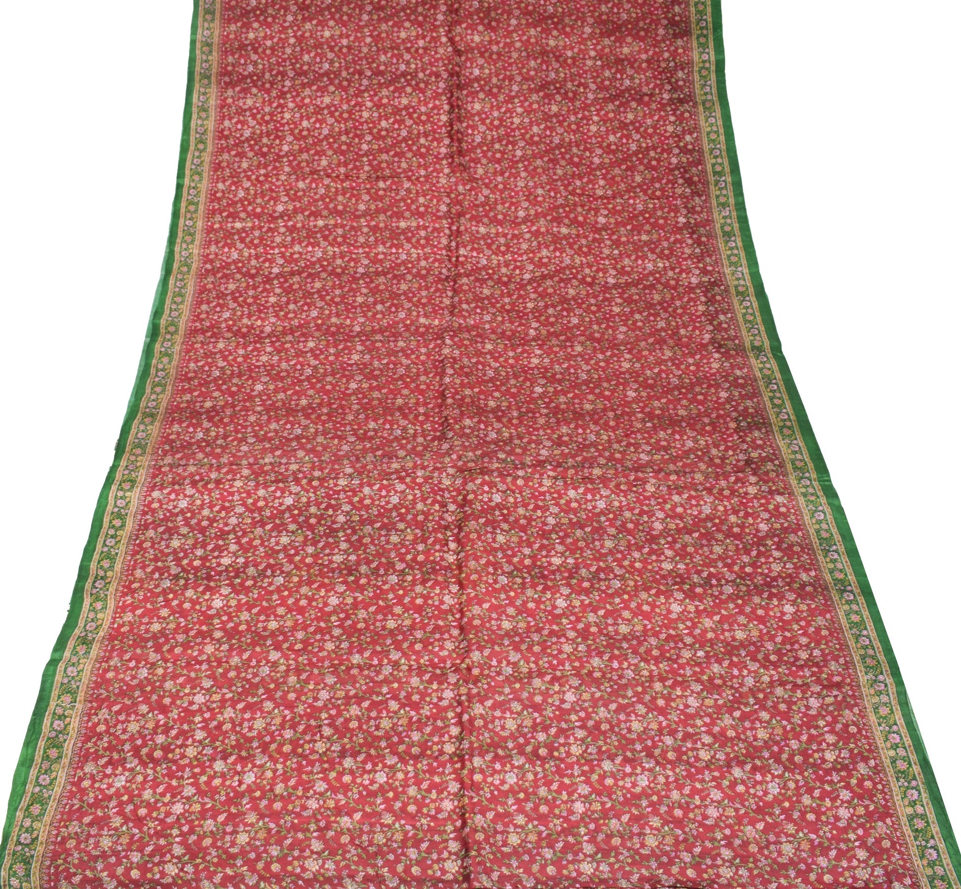 Sushila Vintage Maroon Saree Green Pallu Border Pure Silk Print Floral 6YD Sari