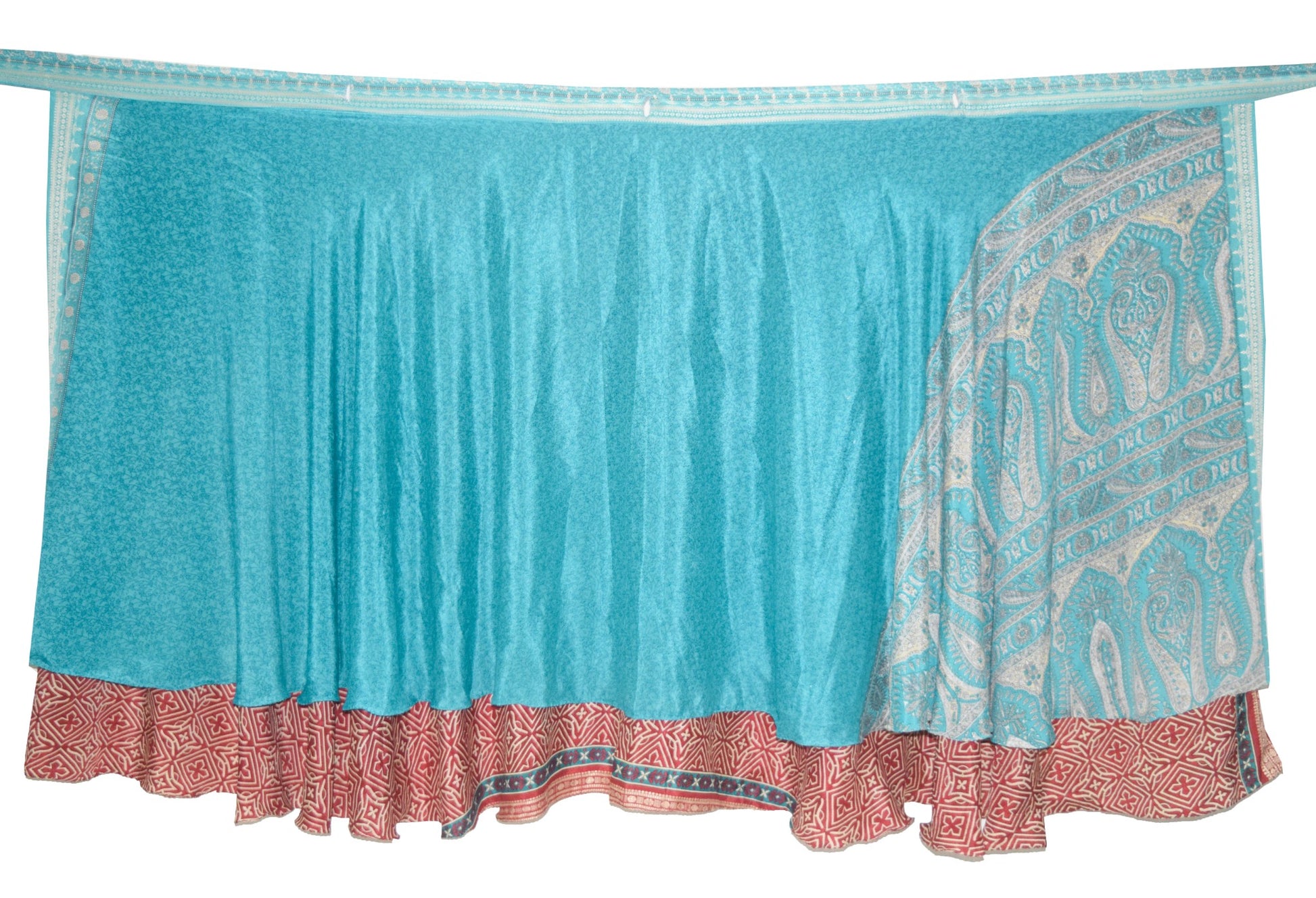 This reversible 2‑Layer Magic Wrap Skirt is crafted from pre‑owned vintage Art or Artificial Silk saree fabric, showcasing a charming maroon & turquoise blue floral pattern for a perfect blend of style and sustainability. Ideal for beach outings, casual wear, or versatile styling, these skirts are lightweight, comfortable, and uniquely patterned. The vibrant designs and flowing fabric make them ideal for pairing with shirts, T‑shirts, or Kurtis. These skirts can be styled in multiple ways, offering endless possibilities for fashion enthusiasts. For styling ideas, simply search for "magic wrap skirt tutorial" on YouTube.