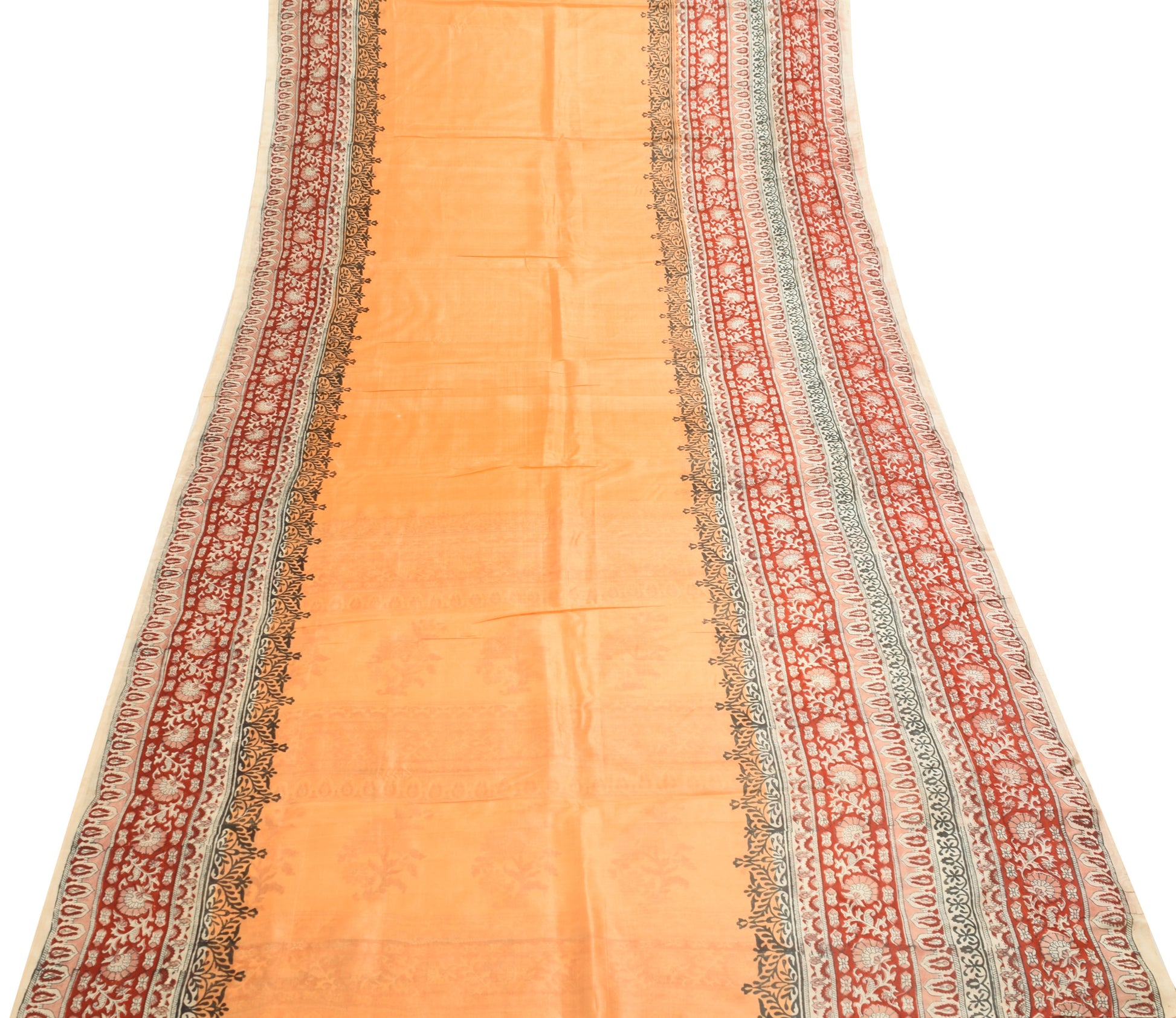 Sushila Vintage Orange Saree 100% Pure Silk Hand Block Printed Craft Fabric