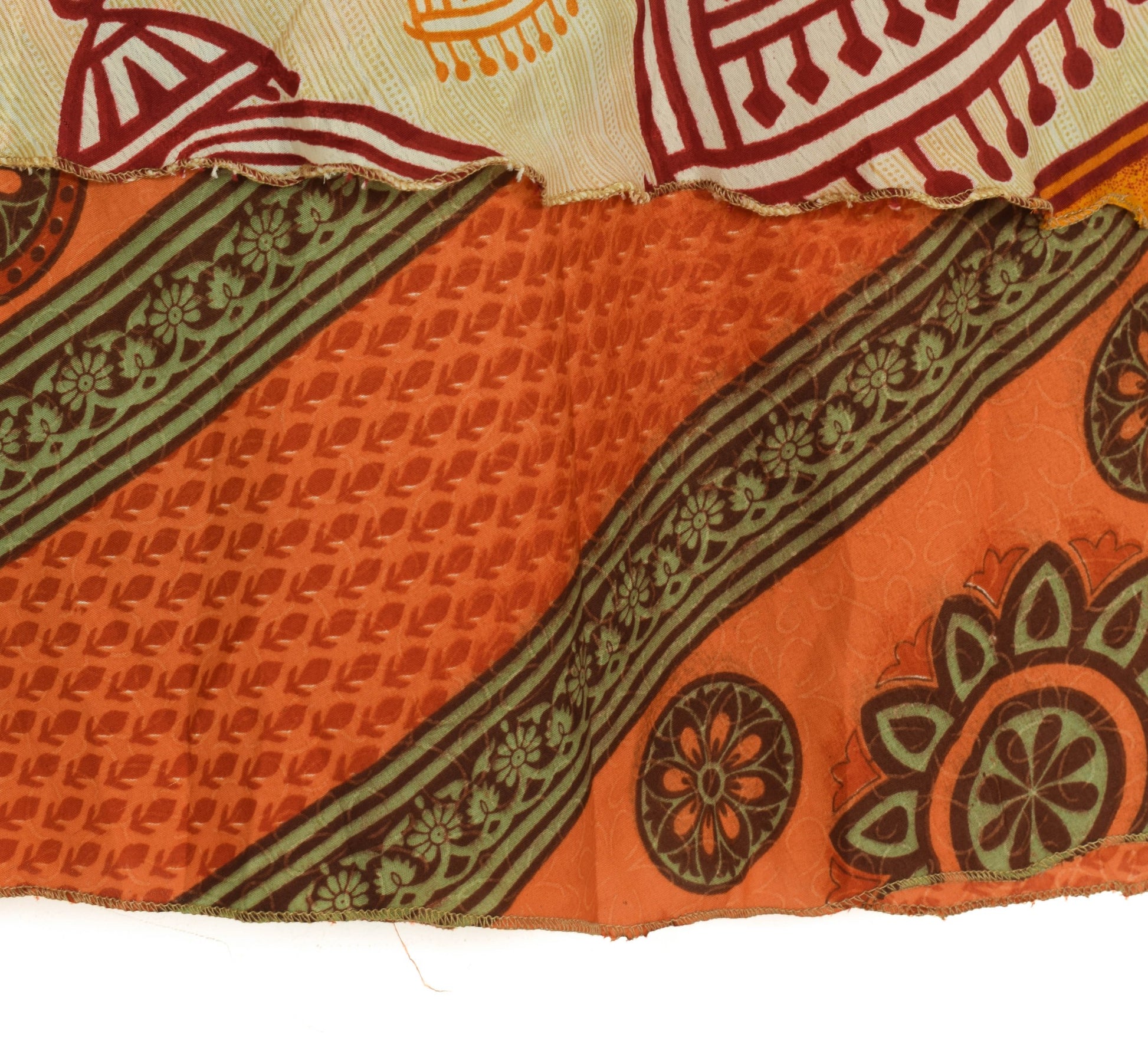 This reversible 2‑Layer Magic Wrap Skirt is crafted from pre‑owned vintage Art or Artificial Silk saree fabric, showcasing a charming orange as per images pattern for a perfect blend of style and sustainability. Ideal for beach outings, casual wear, or versatile styling, these skirts are lightweight, comfortable, and uniquely patterned. The vibrant designs and flowing fabric make them ideal for pairing with shirts, T‑shirts, or Kurtis. These skirts can be styled in multiple ways, offering endless possibilities for fashion enthusiasts. For styling ideas, simply search for "magic wrap skirt tutorial" on YouTube.