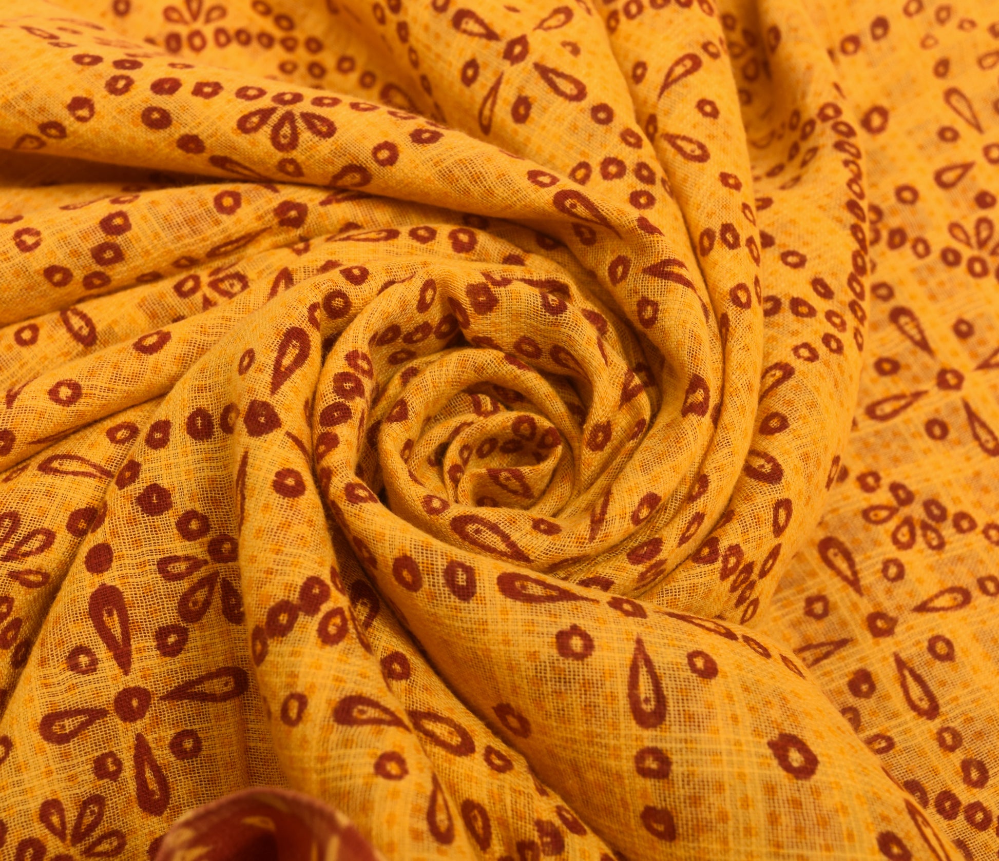 Add a touch of everyday elegance to your wardrobe with this yellow orange 100% pure cotton saree, known for its breathable, lightweight texture and natural comfort. Crafted from breathable, 100% pure cotton, this sari is perfect for warm weather, everyday styling, and creative repurposing. Measuring approximately 168 inch in length and 43 inch in width, it offers a generous amount of fabric for innovative uses, including making curtains, table runners, or even beautiful patchwork quilts. With a lightweight structure, it is easy to drape, carry, and style, making it an excellent choice for those who appreciate comfort without compromising on style.