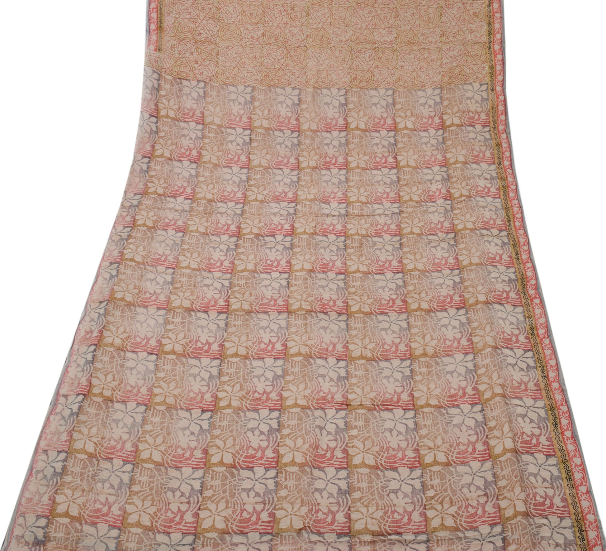 Sushila Vintage Peach Sari Pure Georgette Silk Printed Geometrical Craft Fabric