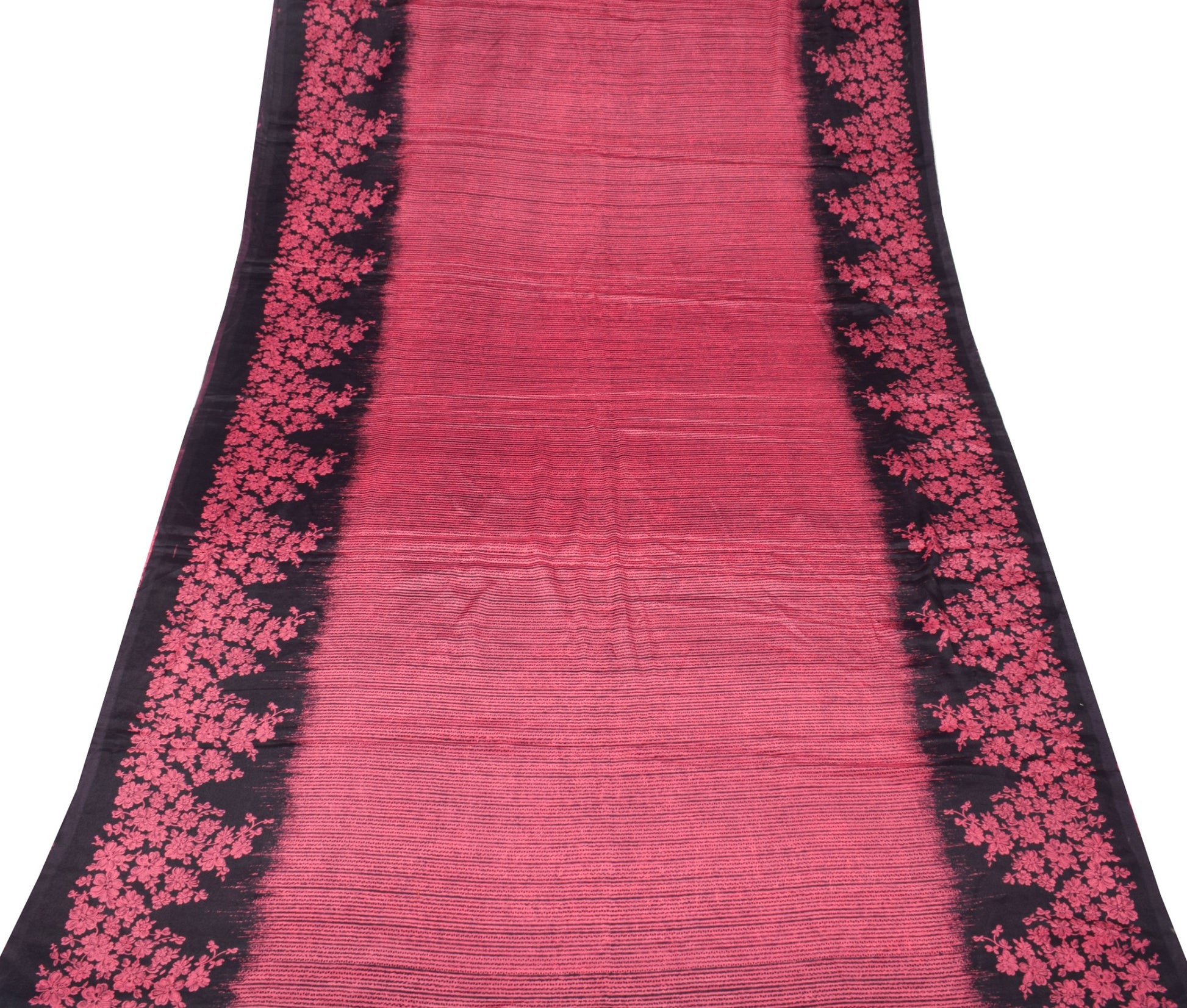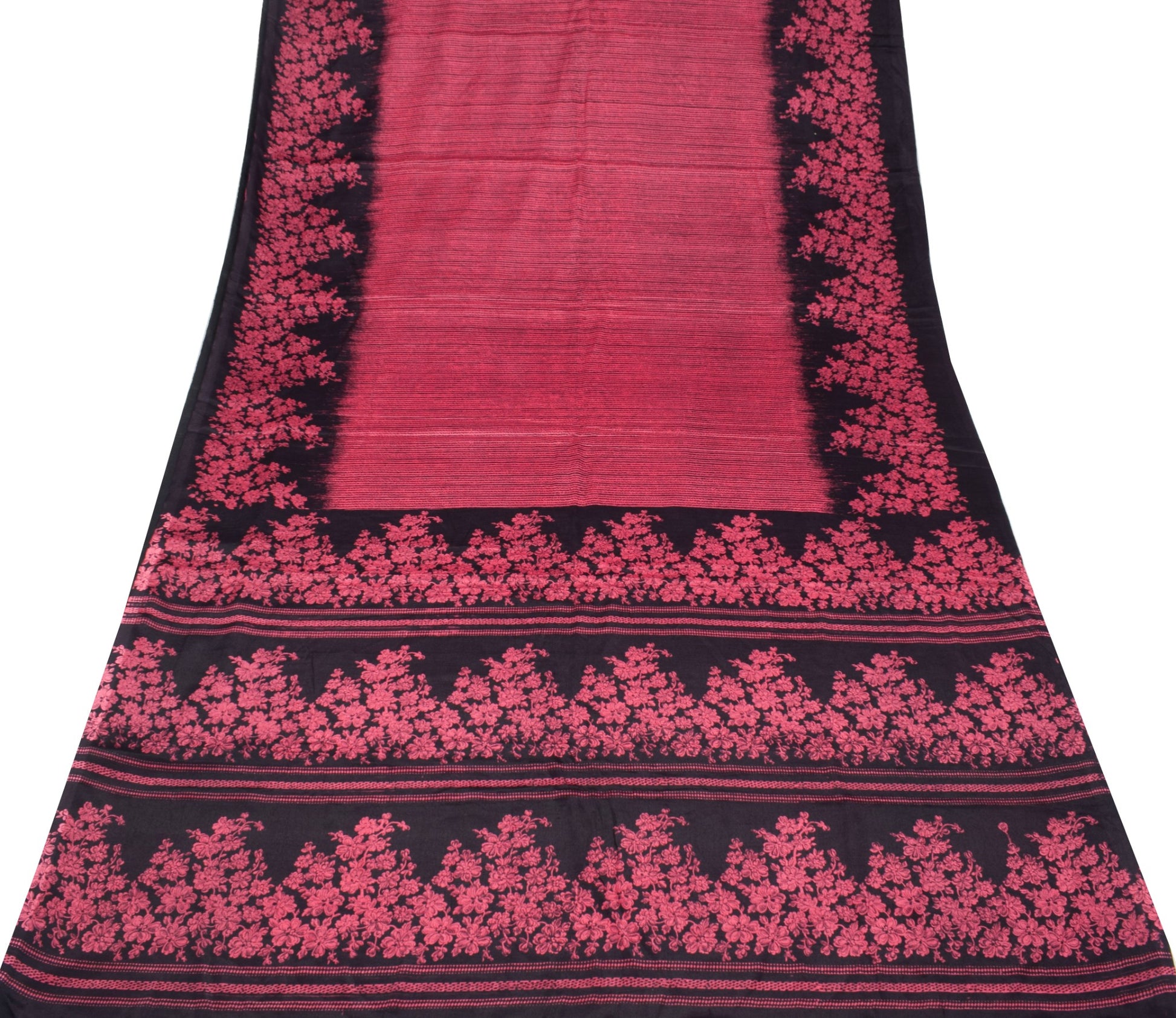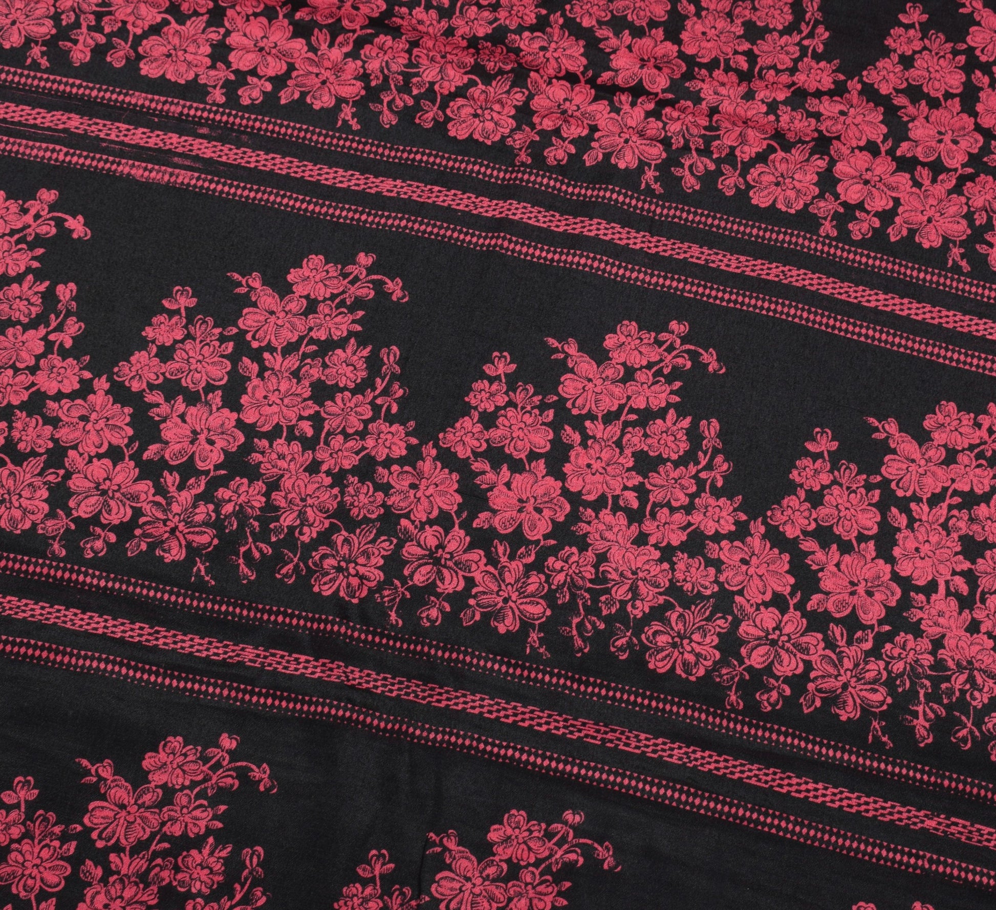 Sushila Vintage Pink Black Saree Pure Silk Printed Floral Sari Soft Craft Fabric