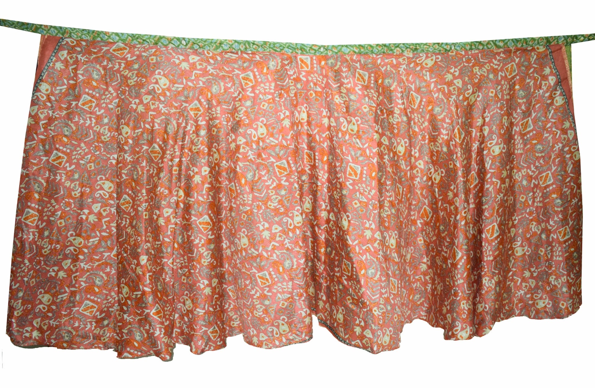 This reversible 2‑Layer Magic Wrap Skirt is crafted from pre‑owned vintage Art or Artificial Silk saree fabric, showcasing a charming pink & green paisley pattern for a perfect blend of style and sustainability. Ideal for beach outings, casual wear, or versatile styling, these skirts are lightweight, comfortable, and uniquely patterned. The vibrant designs and flowing fabric make them ideal for pairing with shirts, T‑shirts, or Kurtis. These skirts can be styled in multiple ways, offering endless possibilities for fashion enthusiasts. For styling ideas, simply search for "magic wrap skirt tutorial" on YouTube.