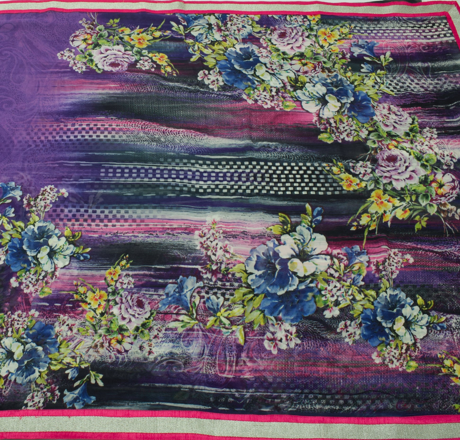Sushila Vintage Purple Saree 100%Pure Georgette Silk Printed Floral Craft Fabric