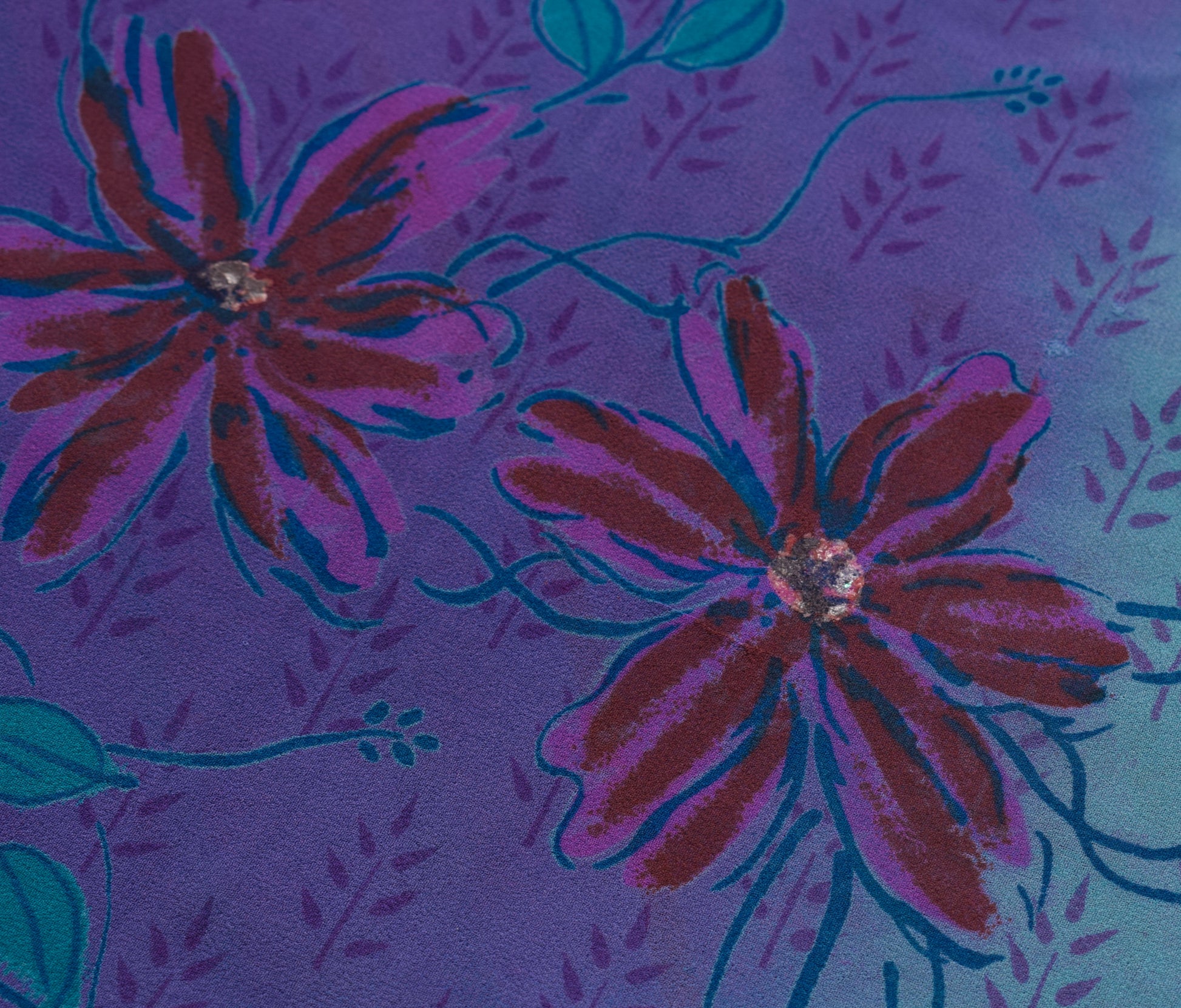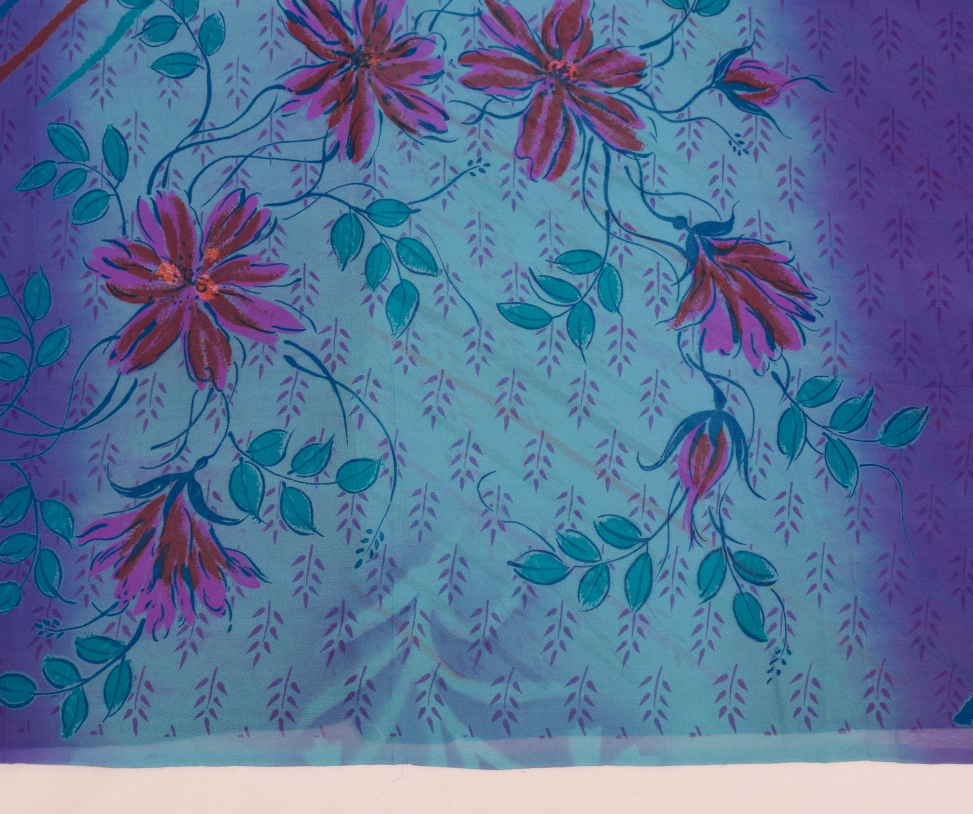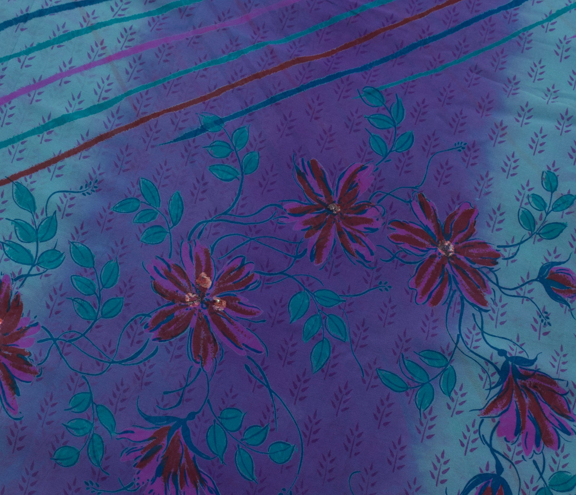Capture the spirit of heritage fashion with this stunning Purple & Aqua blue 100% Pure Georgette Silk saree, featuring beautiful Floral patterns and fine Printed accents. It is perfect for special occasions, creative repurposing, or as a beautiful heirloom gift. Measuring approximately 43 Inch in length and 44 Inch in width, this sari offers versatile styling options. It is lightweight, weighing just 390 Grams (Actual Product weight), making it easy to drape and carry for long hours. The natural breathability and luxurious drape of 100% pure georgette silk make it a prized choice for those who appreciate fine craftsmanship and vintage fashion.