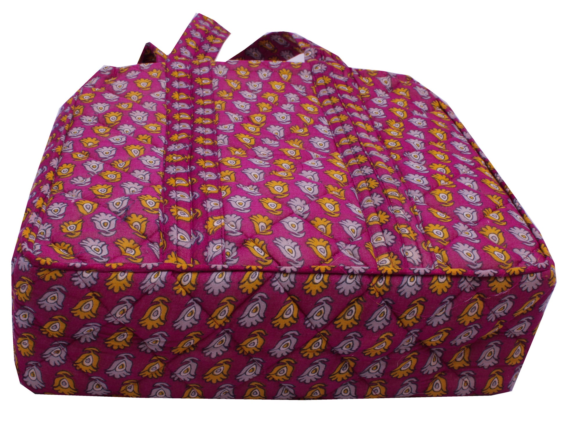 This Tote bag is quilted and handmade using printed 100% Pure Silk Vintage Saree. It is designed to be able to contain all your everyday stuff or for light traveling. The top closes with a Zip, and when opened it has 2 smaller compartments in each side.